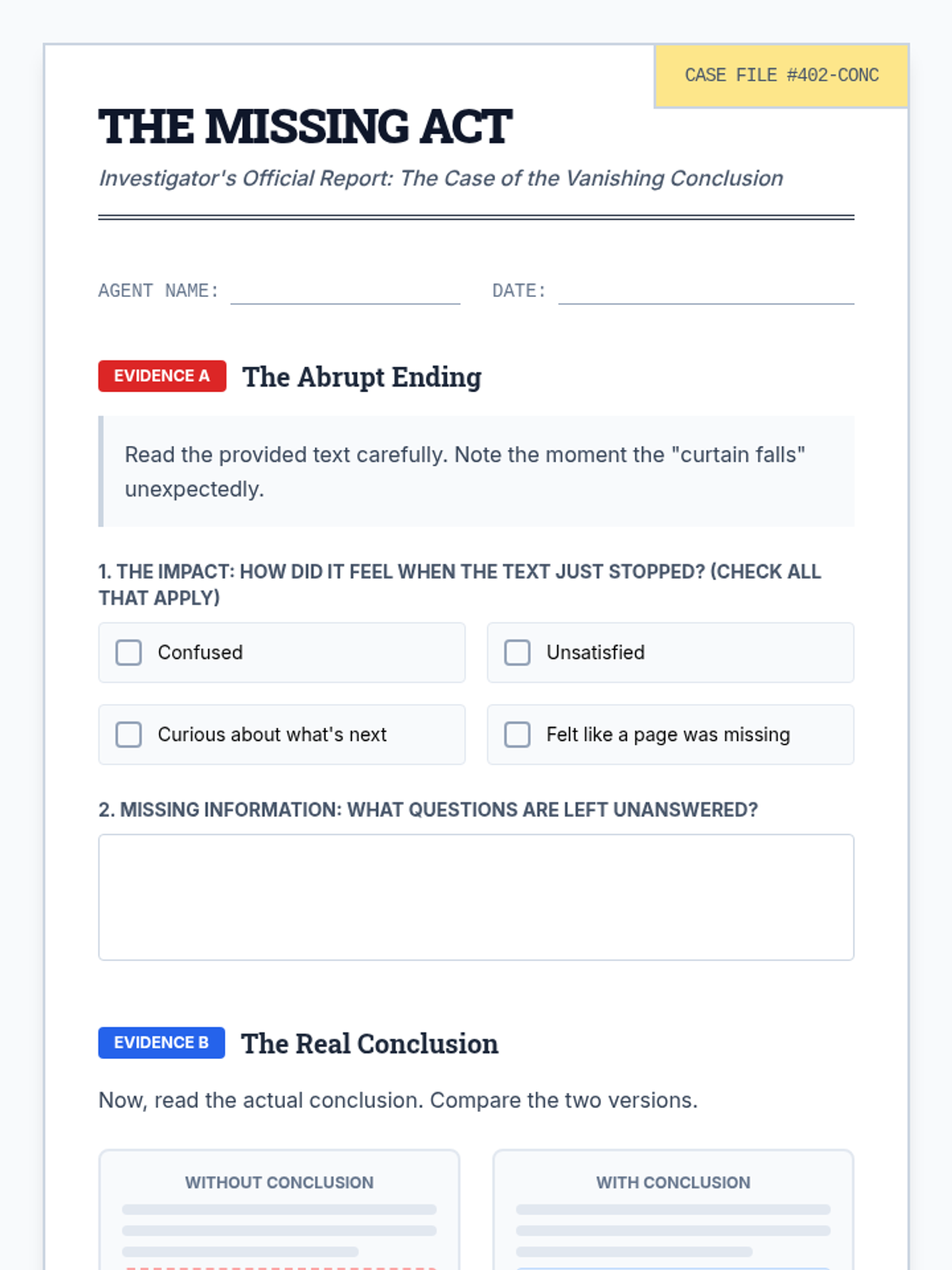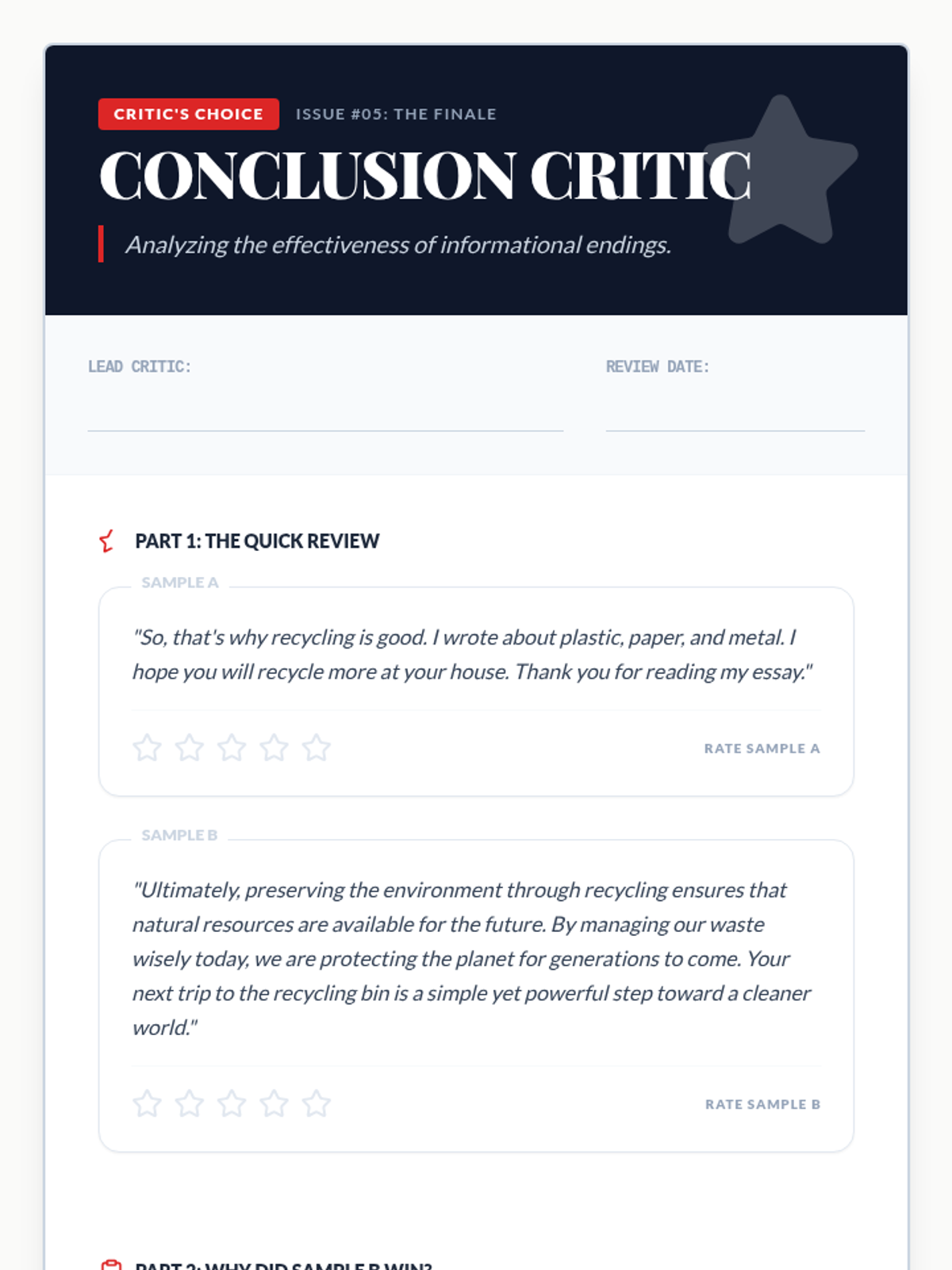 Students explore the structural and rhetorical importance of conclusions in informational writing, moving from understanding purpose to mastering paraphrasing, synthesis, and crafting lasting final insights.