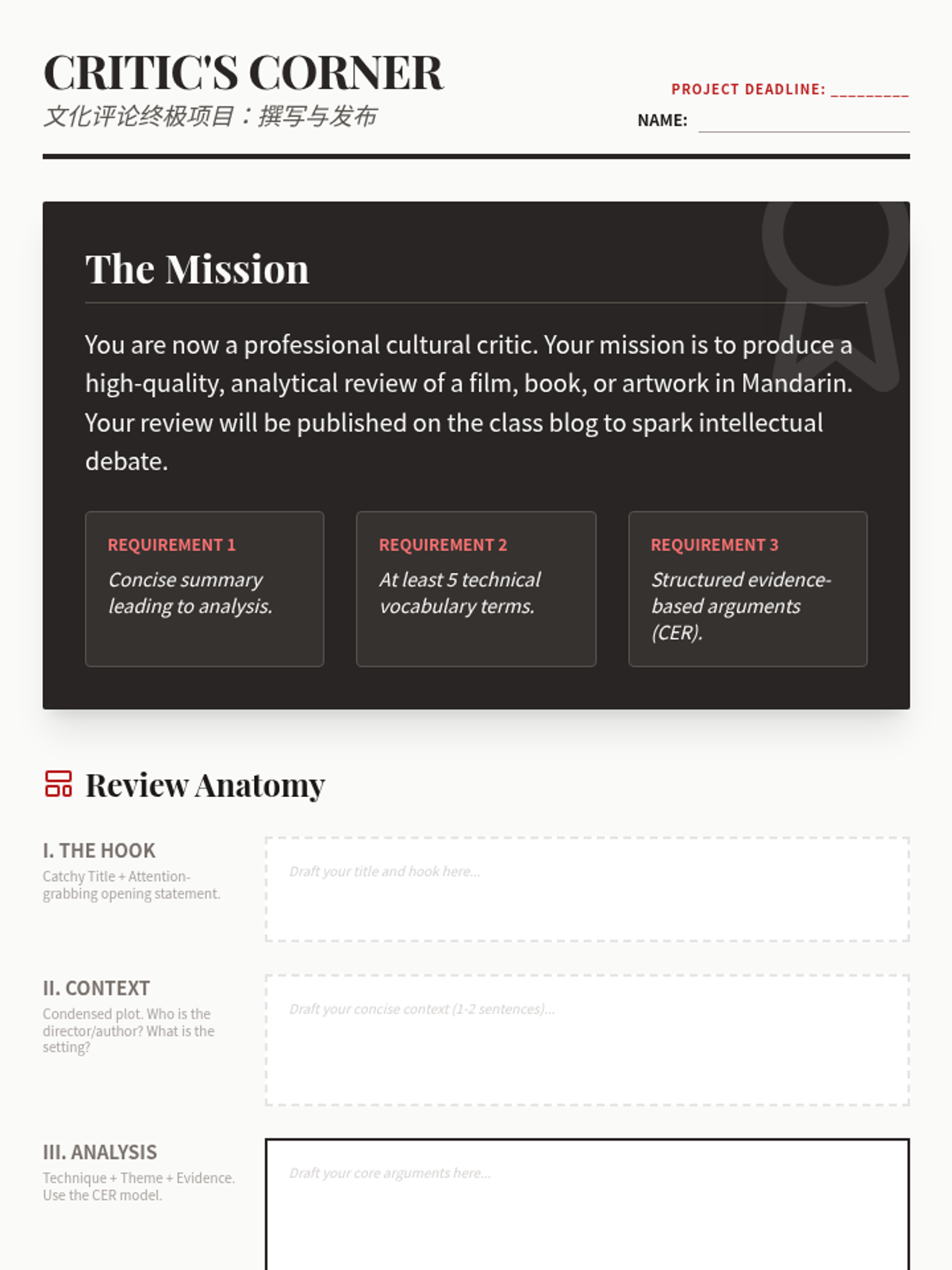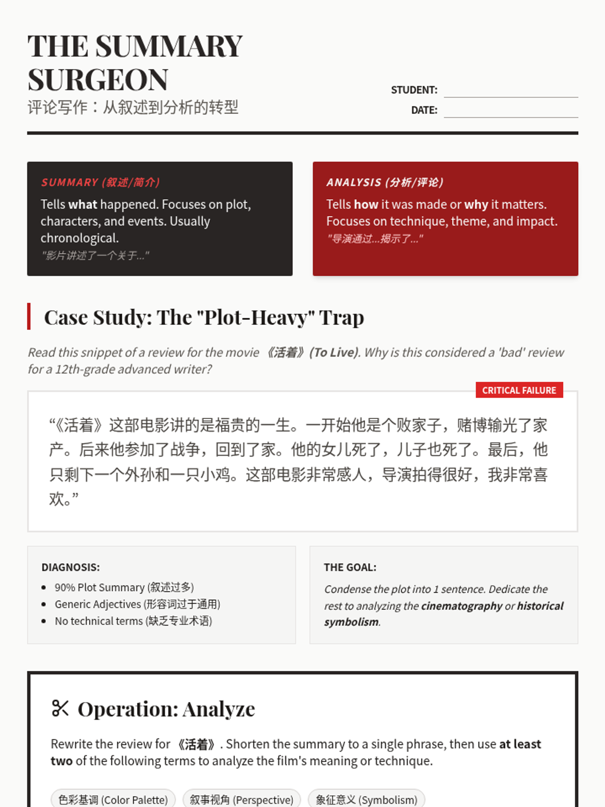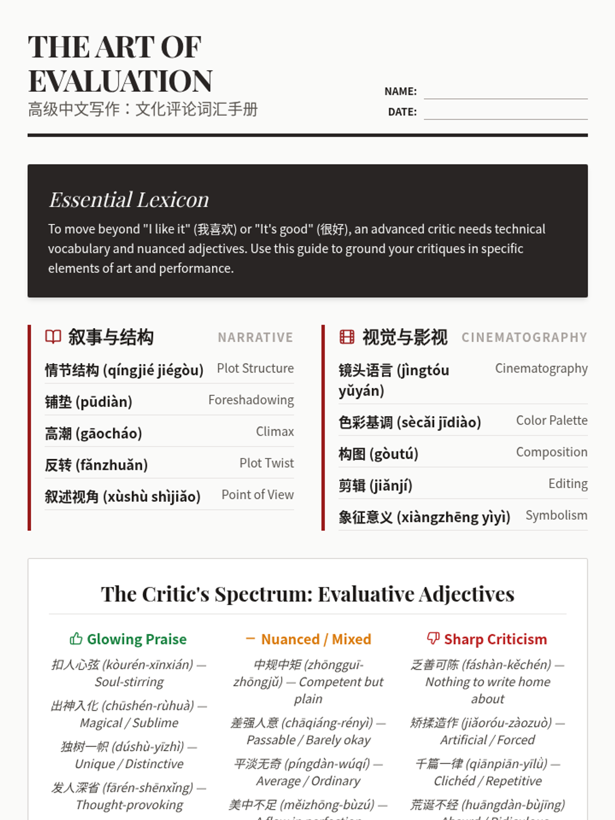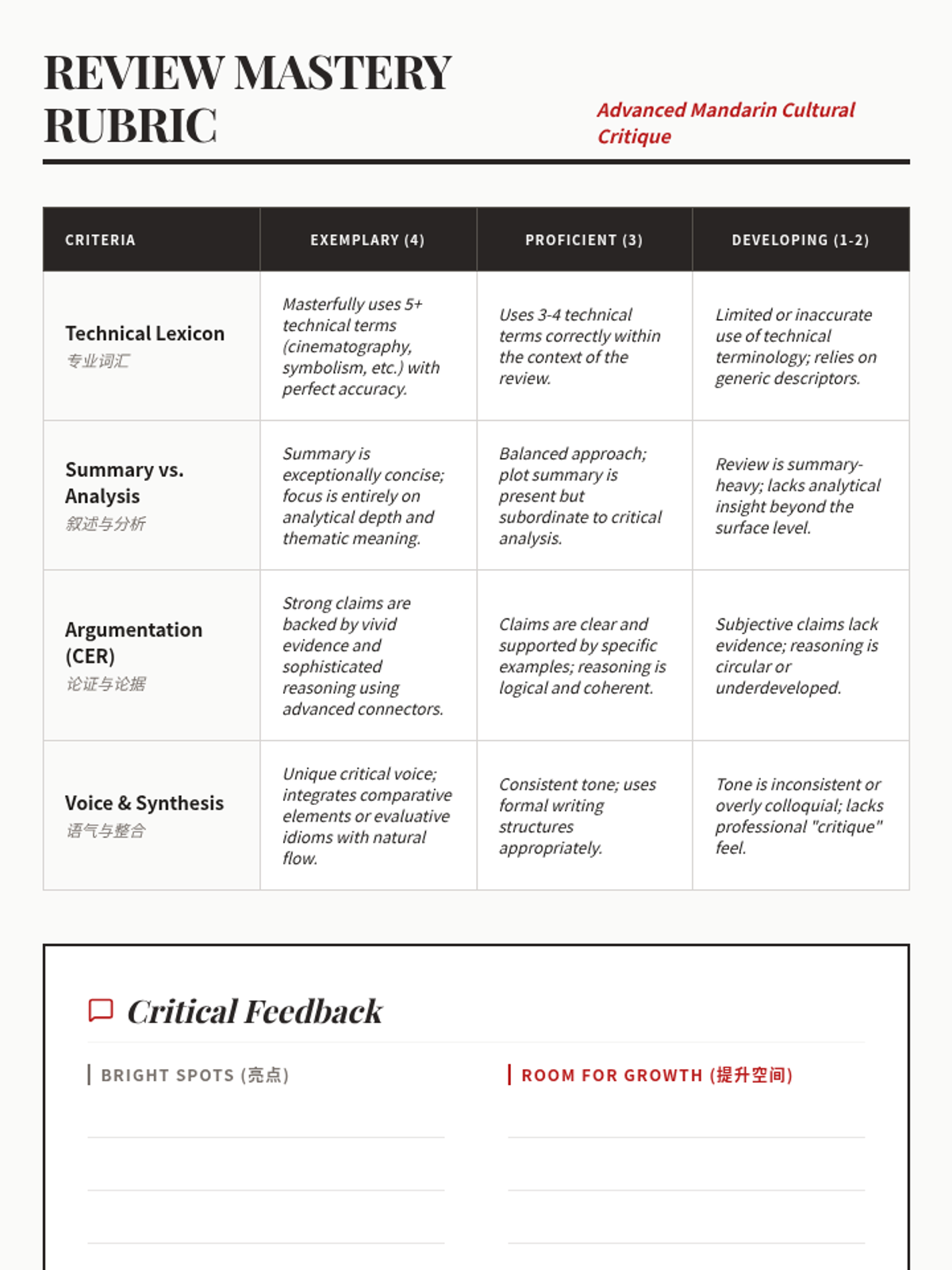 This advanced Mandarin writing sequence teaches 12th-grade students how to craft sophisticated cultural critiques and reviews. Students move from building a technical lexicon to masterfully balancing summary with evidence-based analysis and comparative structures.