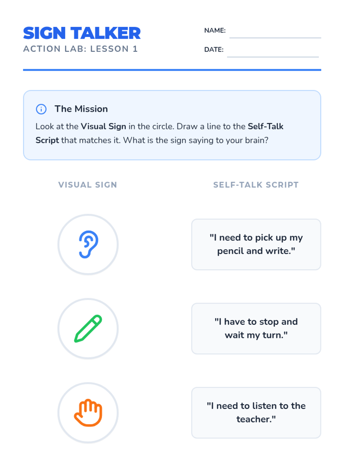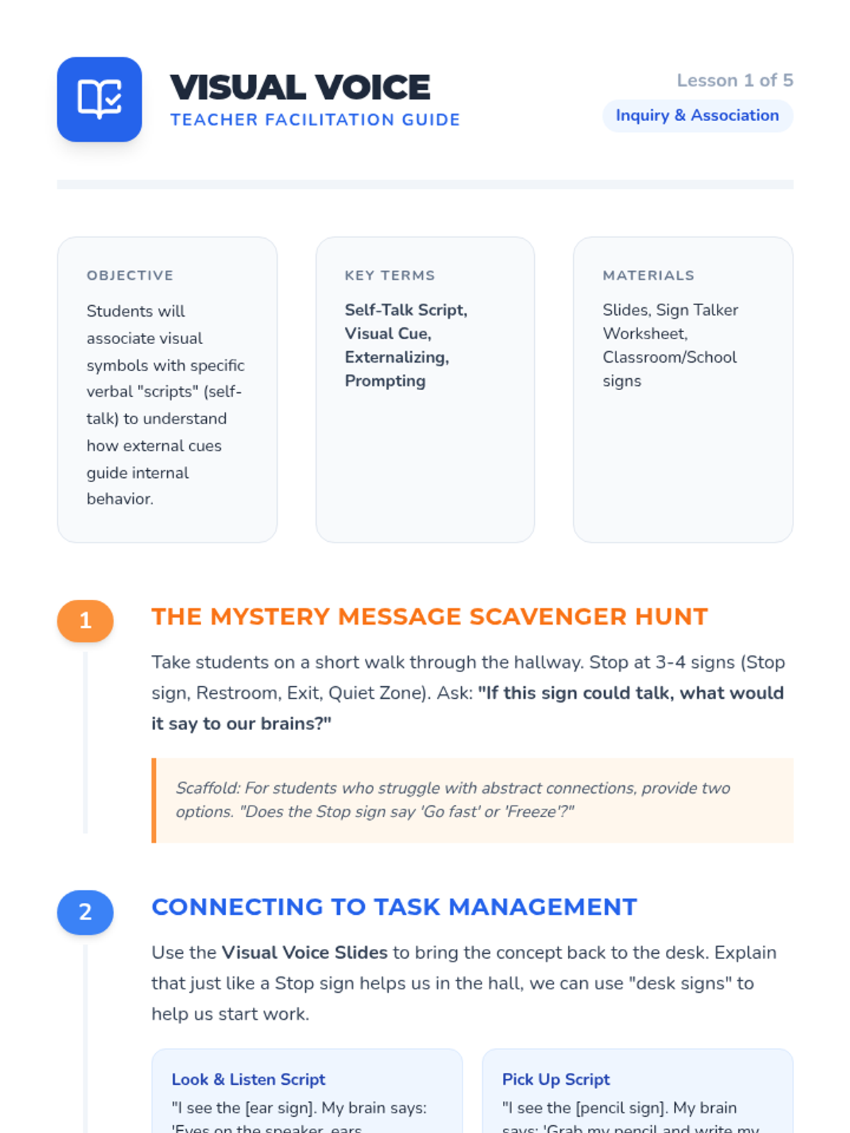 A project-based sequence for 2nd grade students to externalize self-talk strategies into tangible visual aids. Students design and create personal desk tools like start buttons and flipbooks to prompt task initiation and manage common barriers.