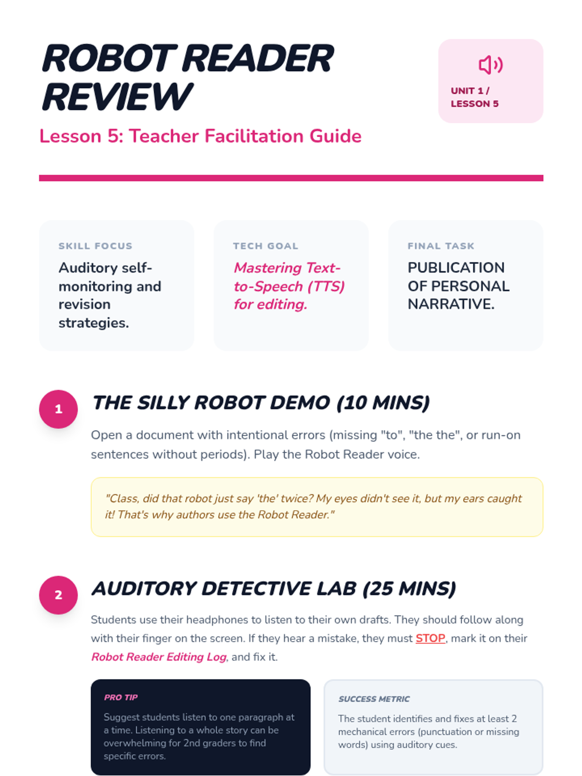 A comprehensive 2nd-grade sequence focused on mastering Text-to-Speech (TTS) tools. Students learn to synchronize visual tracking with audio, adjust speech rates for optimal processing, and use digital tools to support decoding and fluency.