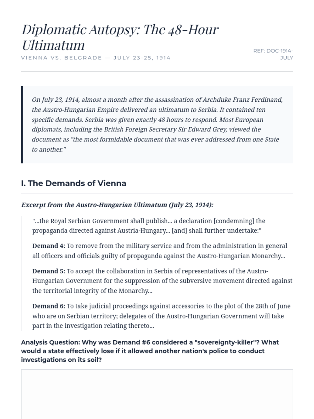 An undergraduate-level exploration of the geopolitical and diplomatic causes of World War I, focusing on the breakdown of the Concert of Europe, the rigidity of alliance systems, Balkan nationalism, and the historiographical debates surrounding war guilt.