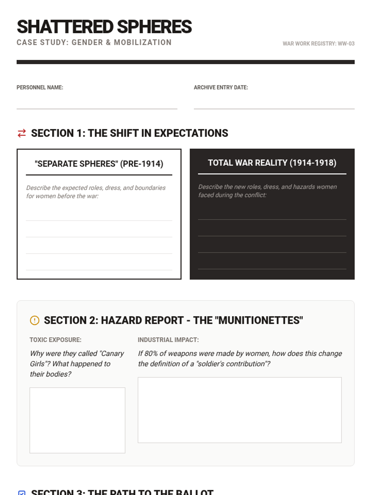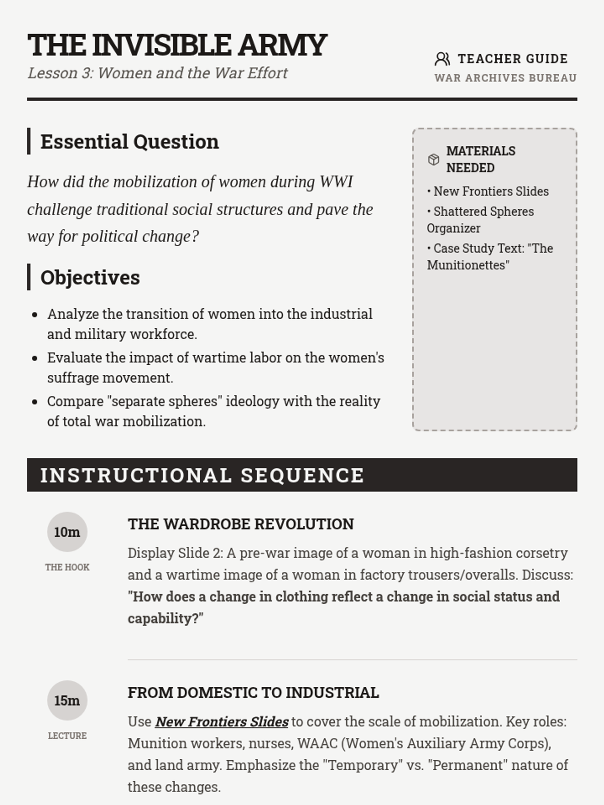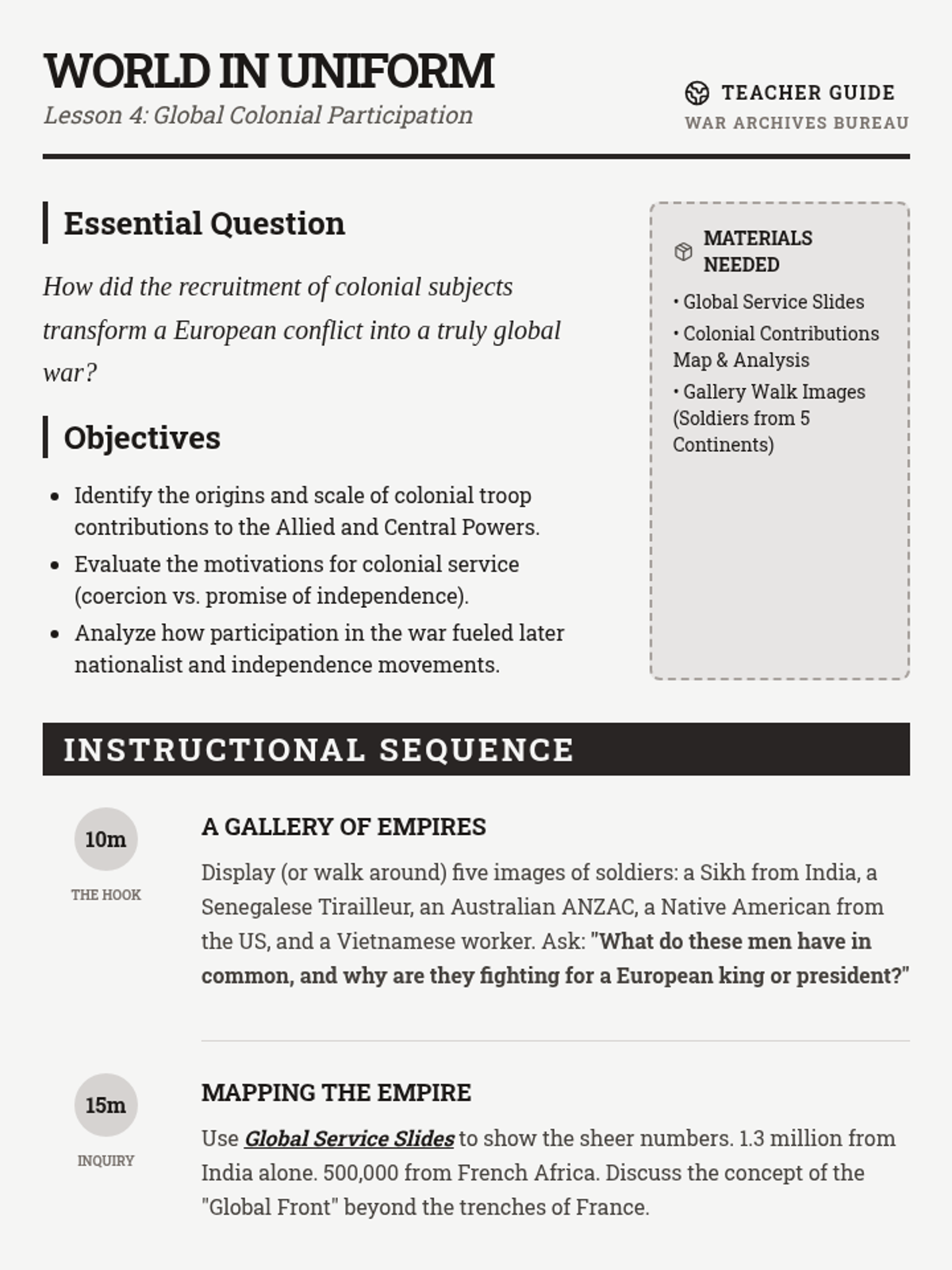 This sequence explores World War I through the lens of 'Total War', examining how the conflict mobilized entire societies, transformed the home front, and utilized propaganda to sustain the war effort globally. Students analyze economic shifts, social changes for women, and the crucial participation of colonial subjects.