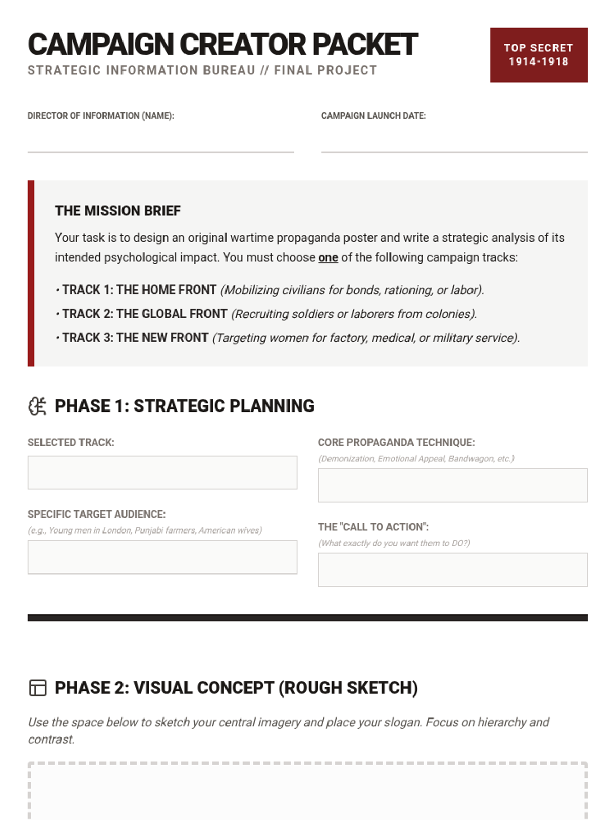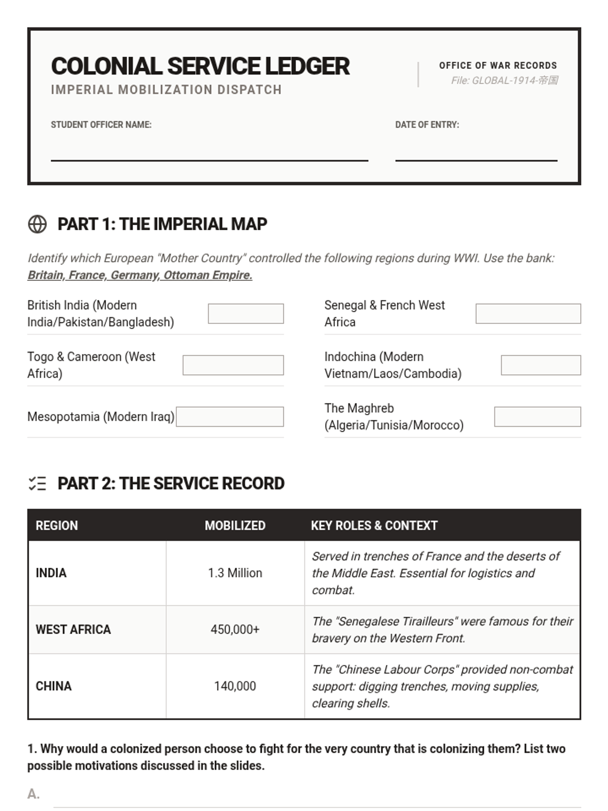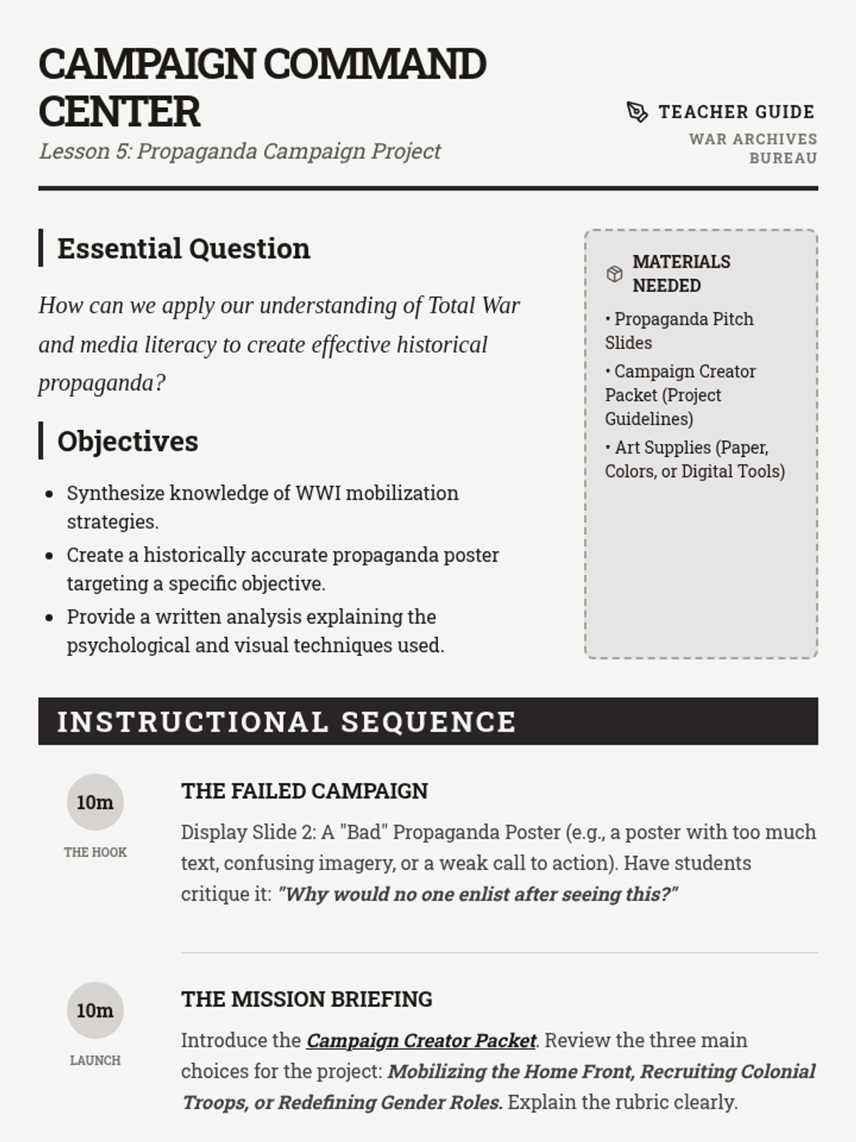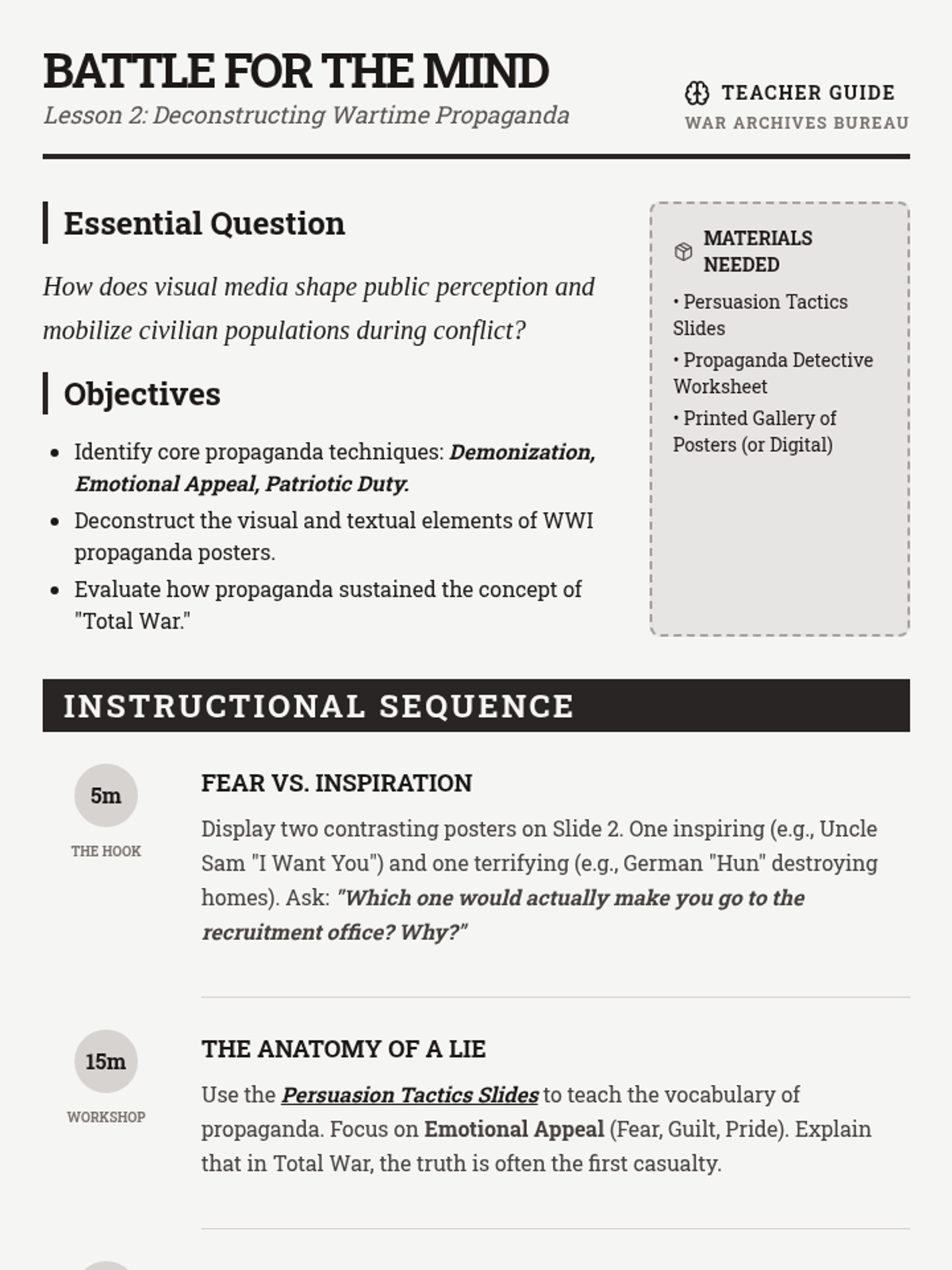 This sequence explores World War I through the lens of 'Total War', examining how the conflict mobilized entire societies, transformed the home front, and utilized propaganda to sustain the war effort globally. Students analyze economic shifts, social changes for women, and the crucial participation of colonial subjects.