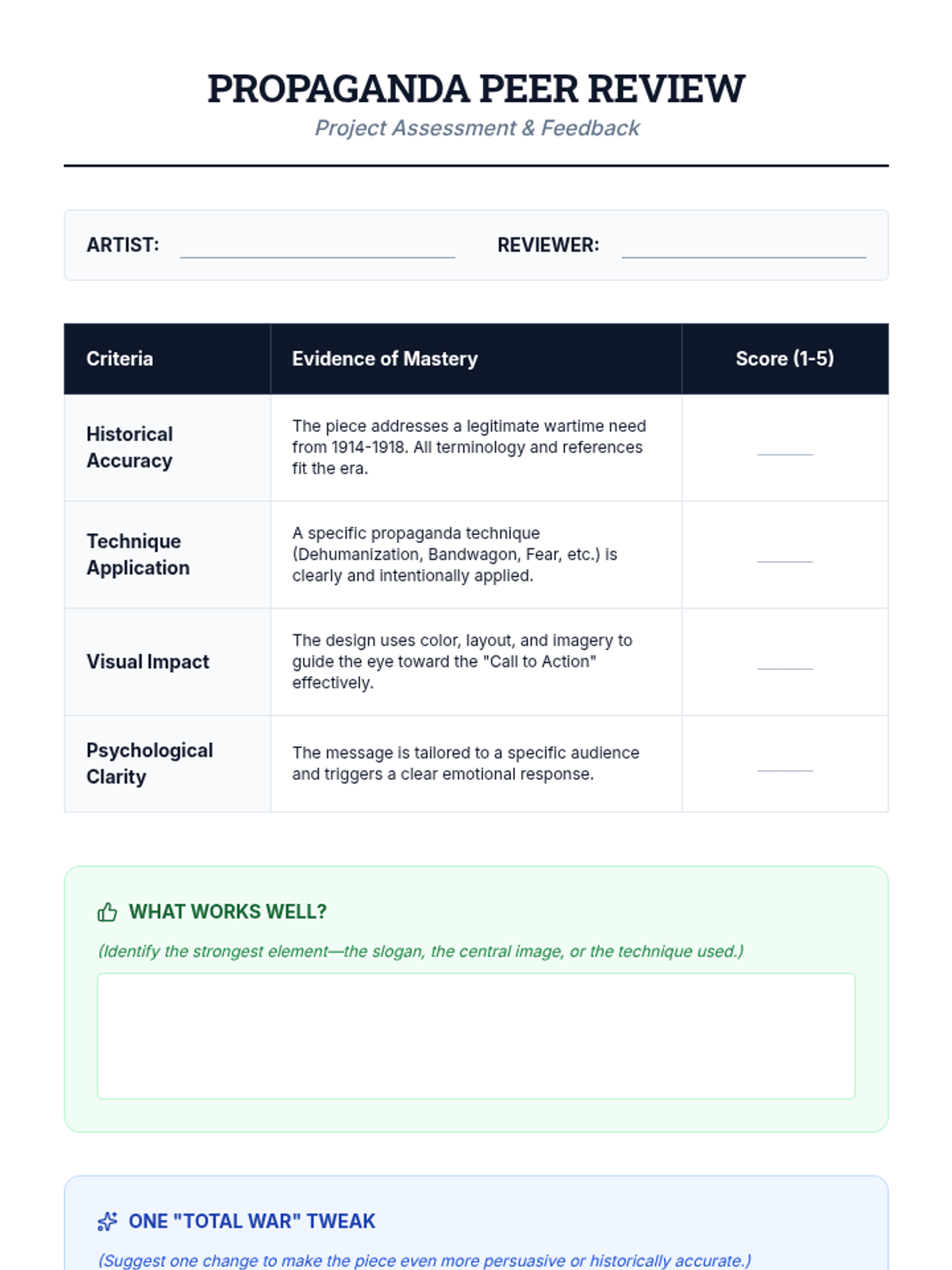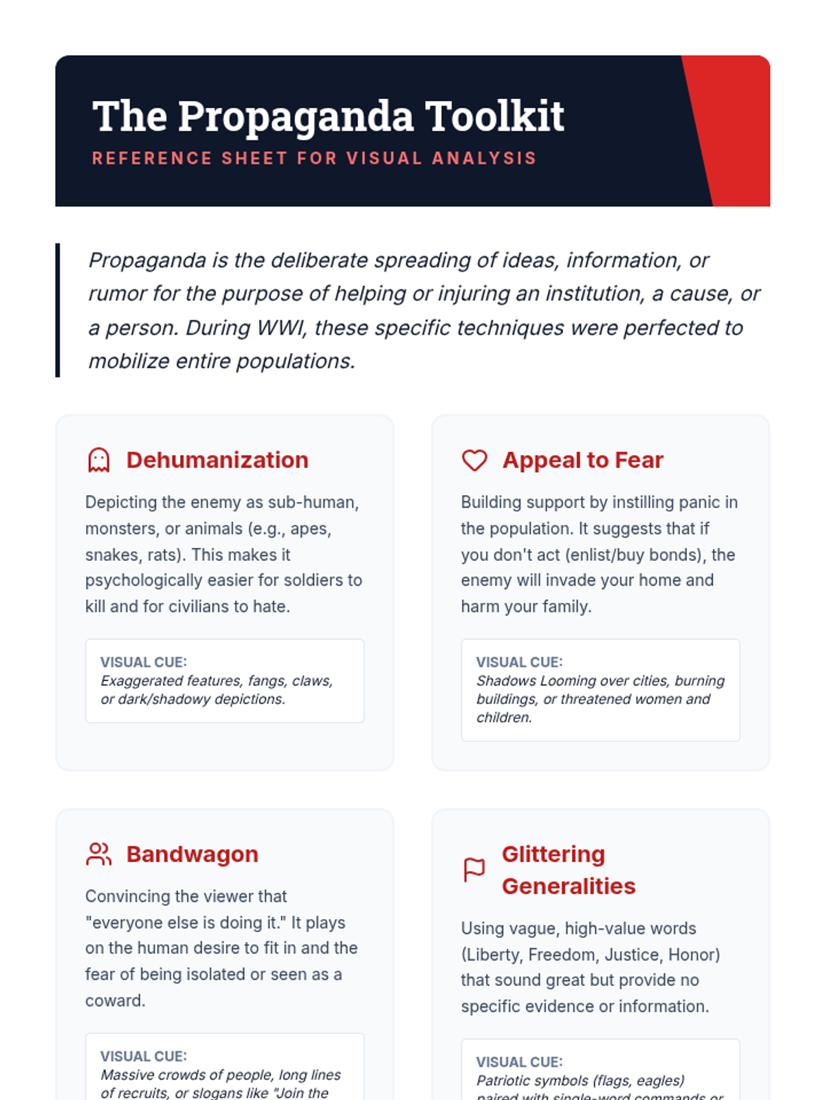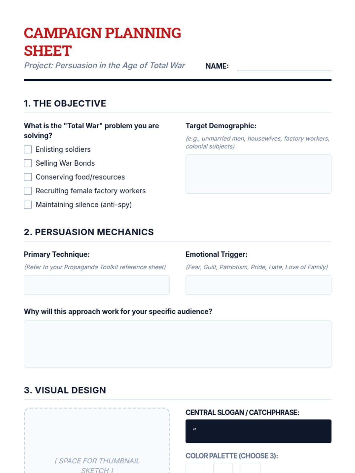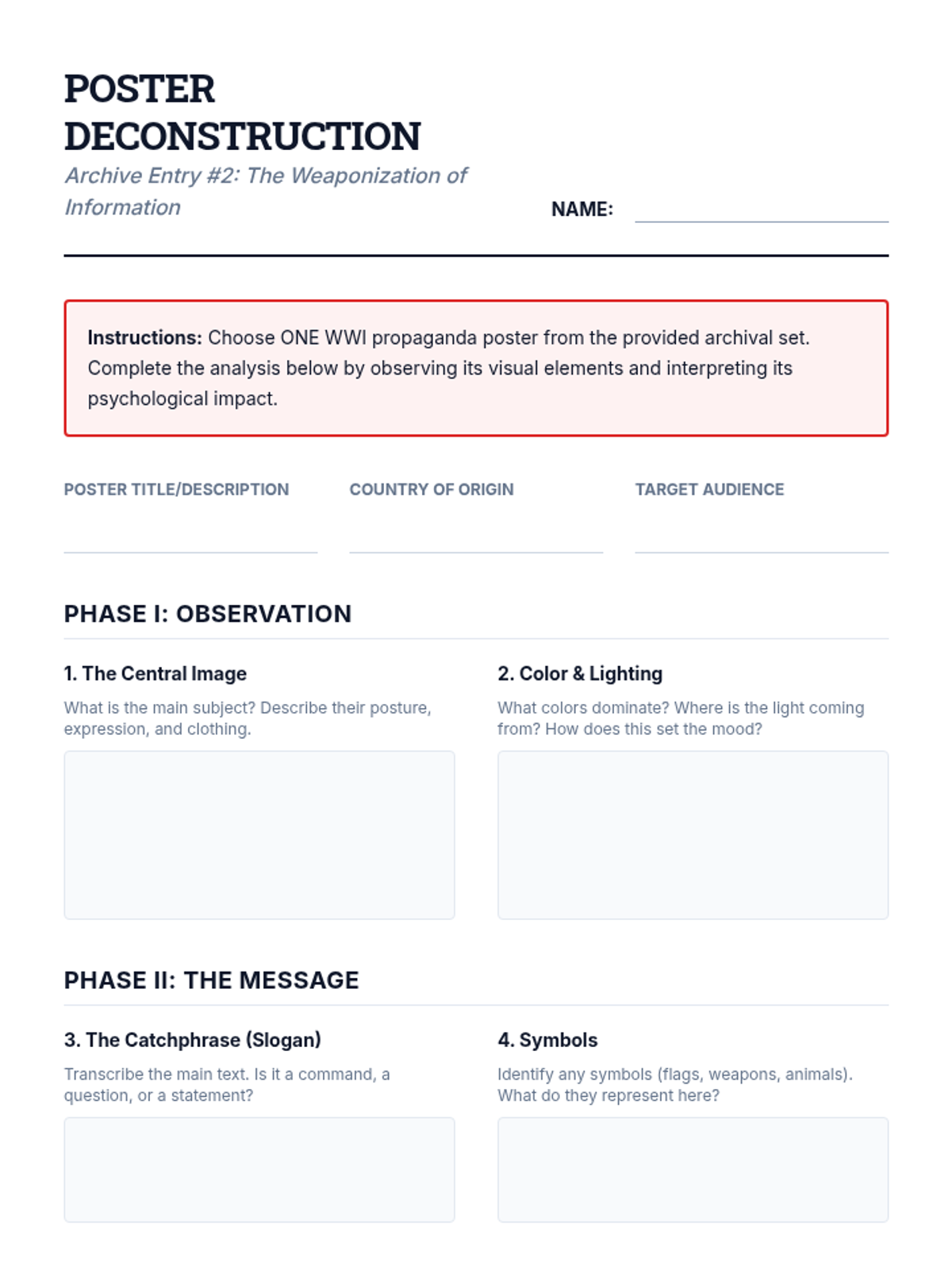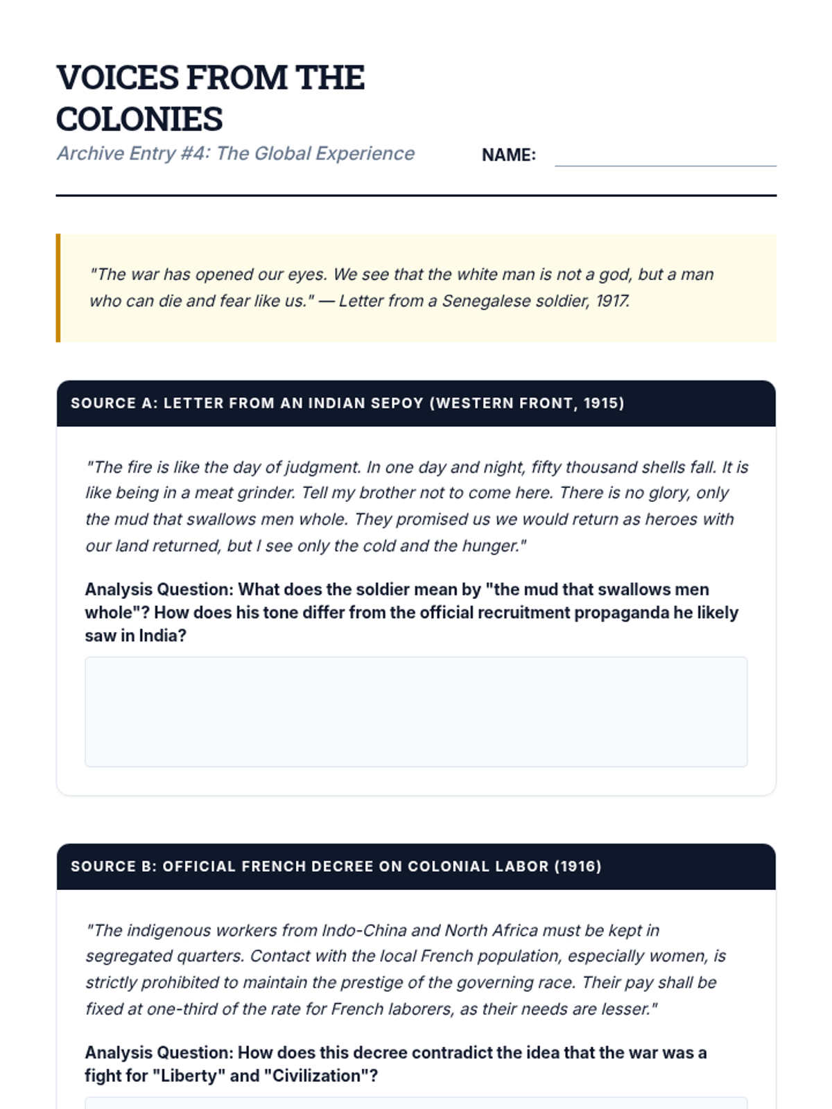 This high school history sequence explores the concept of 'Total War' during WWI, focusing on how governments mobilized entire populations through propaganda, economic shifts, and global colonial involvement. Students will analyze primary sources, data, and visual media to understand the blurring lines between civilian and combatant.