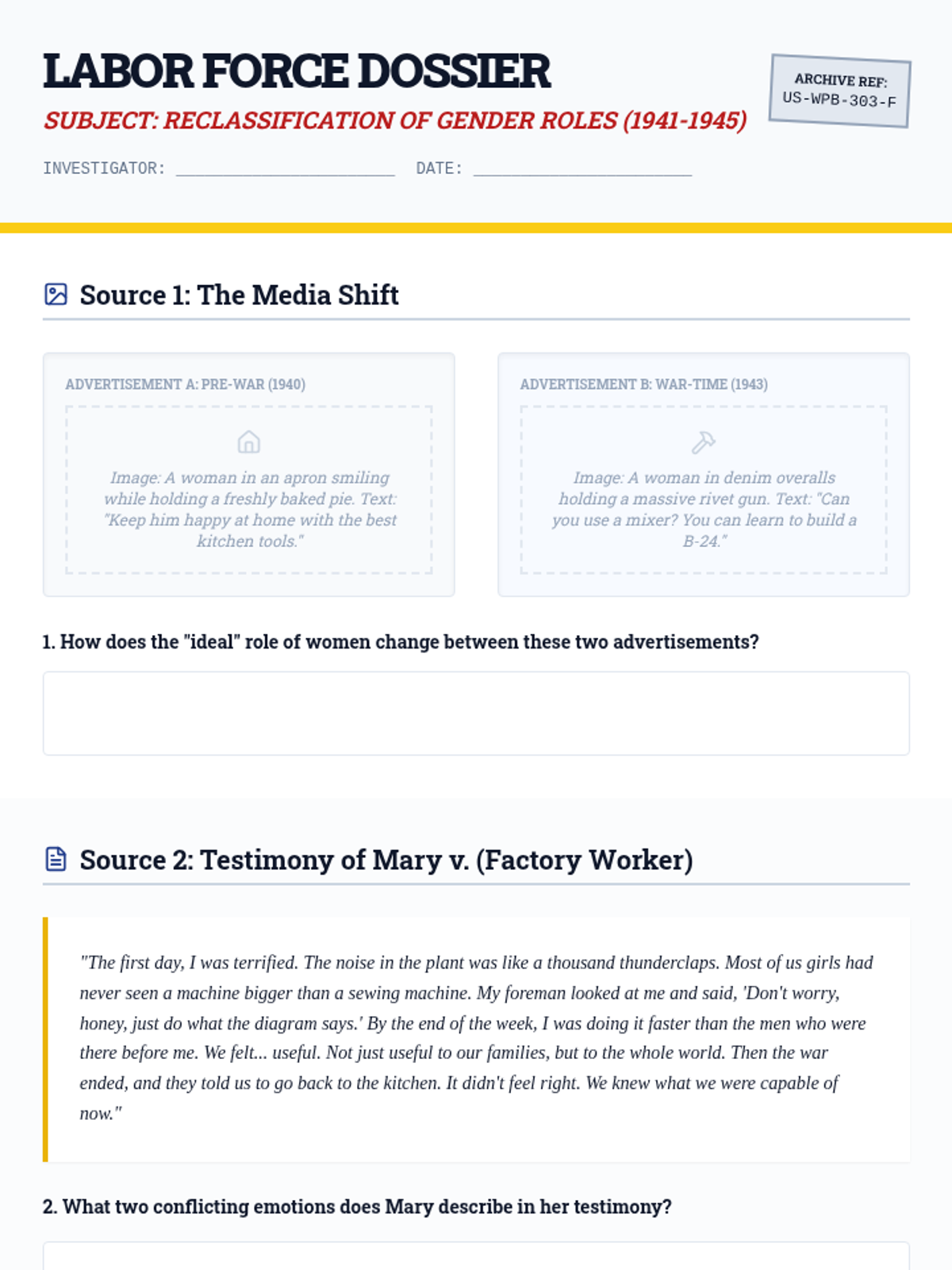 This sequence explores the domestic impact of World War II in the United States, focusing on industrial mobilization, propaganda, shifting social roles for women and minorities, and the tension between national security and civil liberties. Students will analyze primary sources and data to evaluate how 'total war' reshaped the American social and economic landscape.
