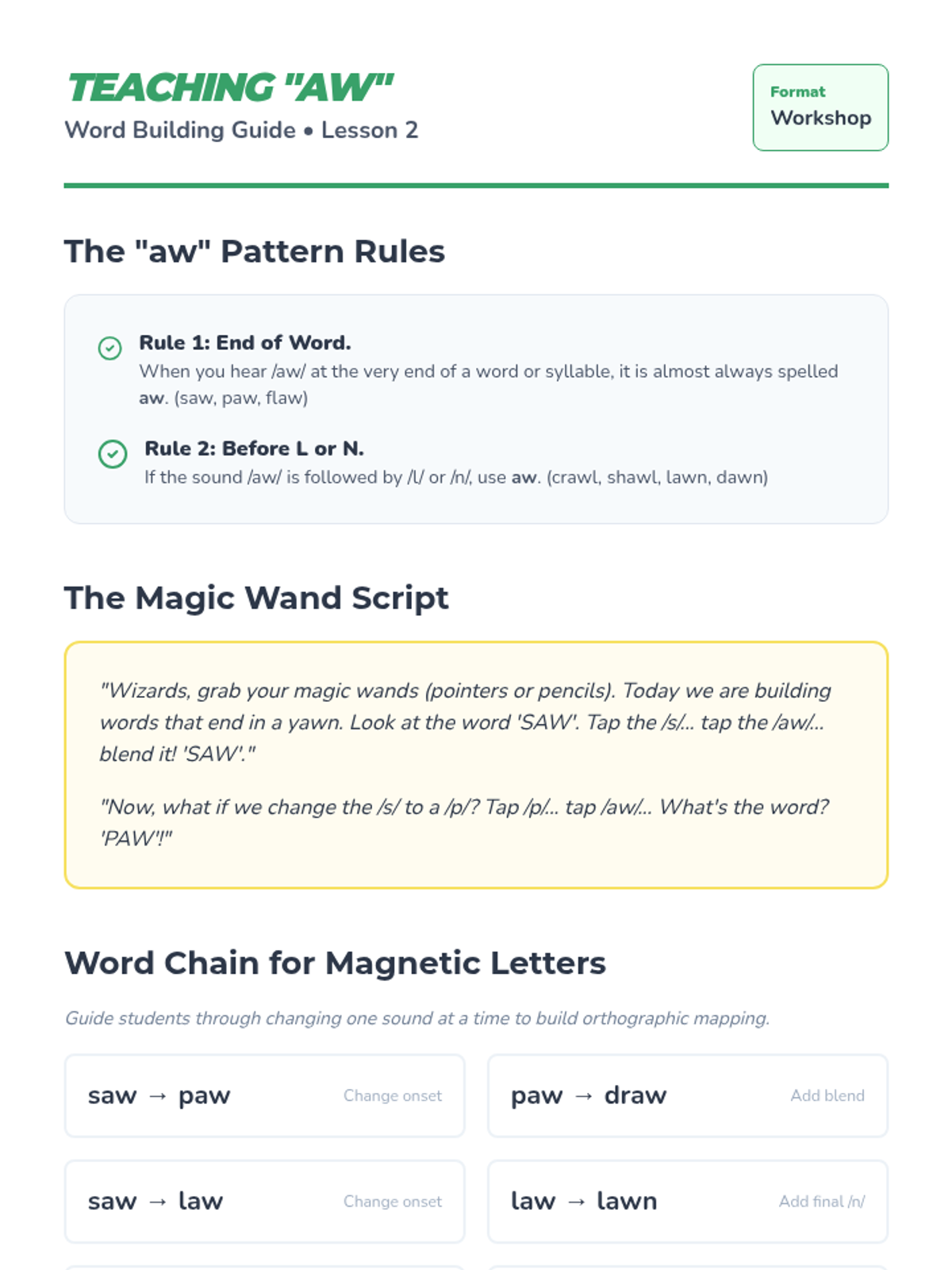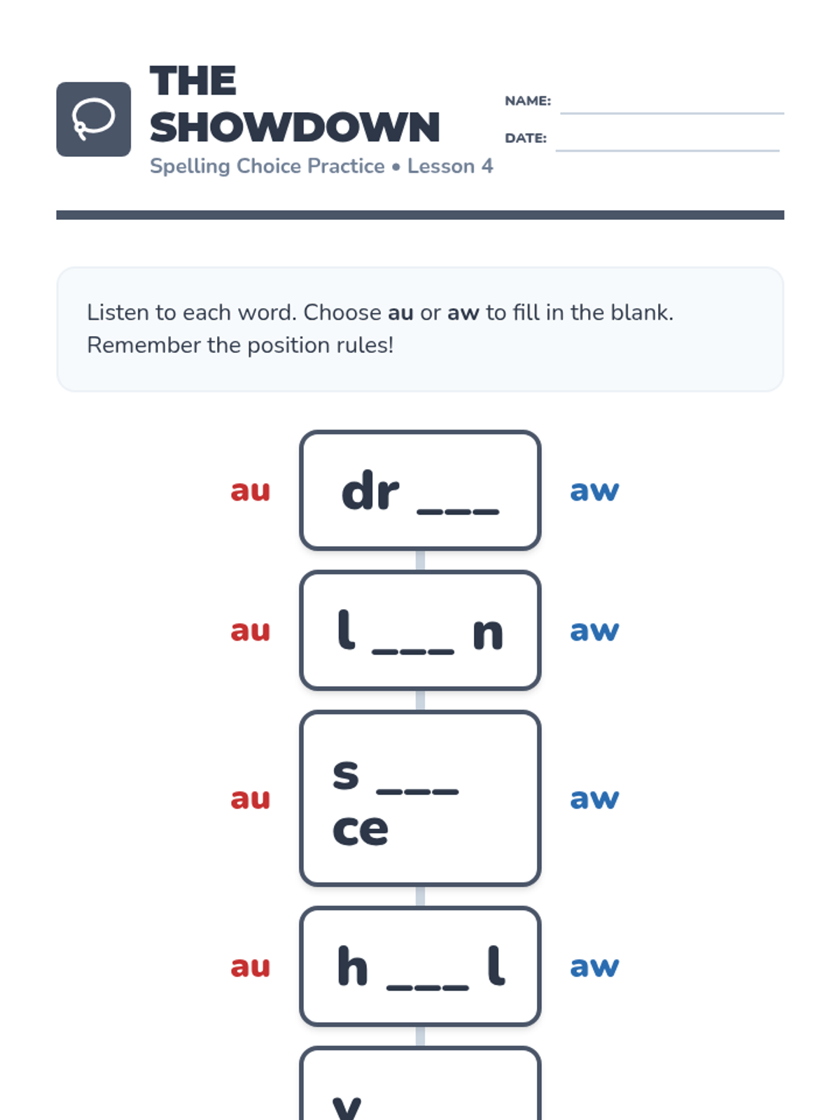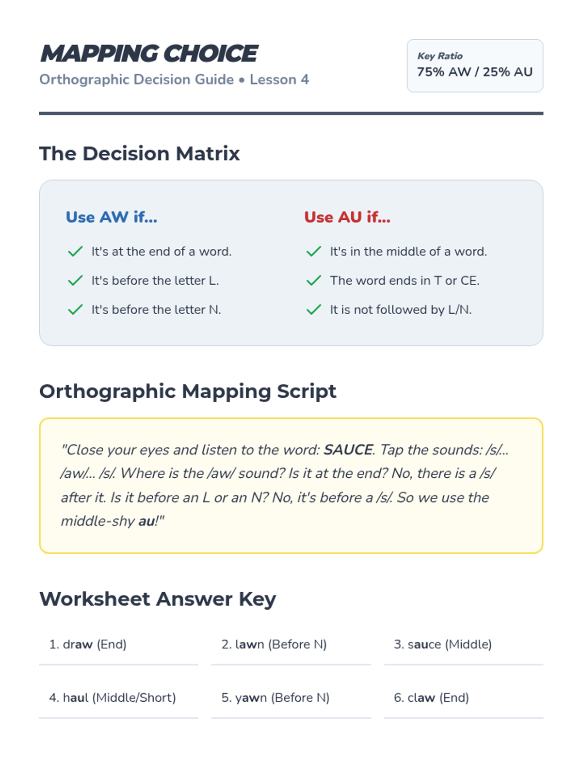 A comprehensive 1st Grade sequence focusing on the /au/ and /aw/ variant vowel sounds through explicit phonics instruction, word building, and fluency practice. Students explore the 'Yawning Vowel' theme to master decoding and spelling these complex patterns.