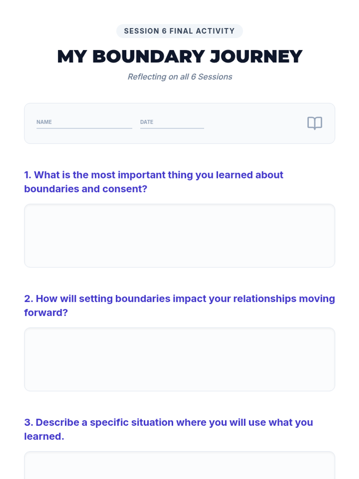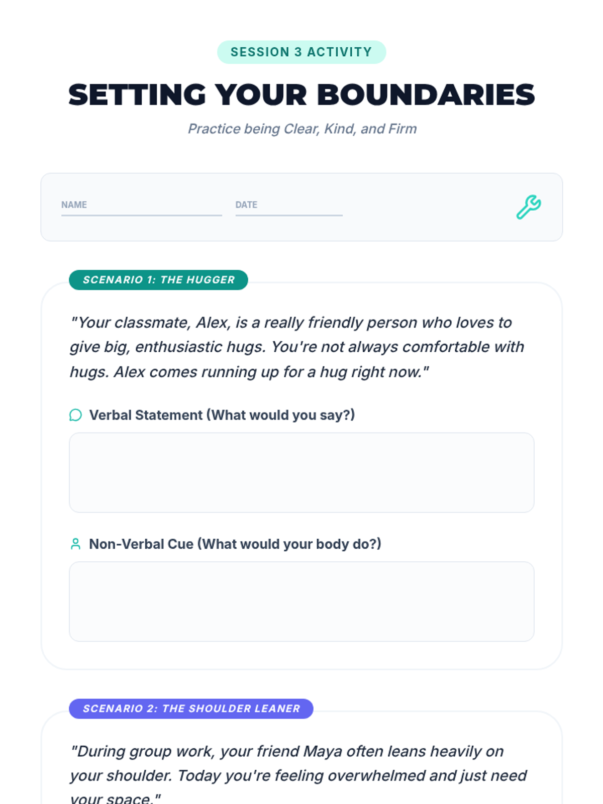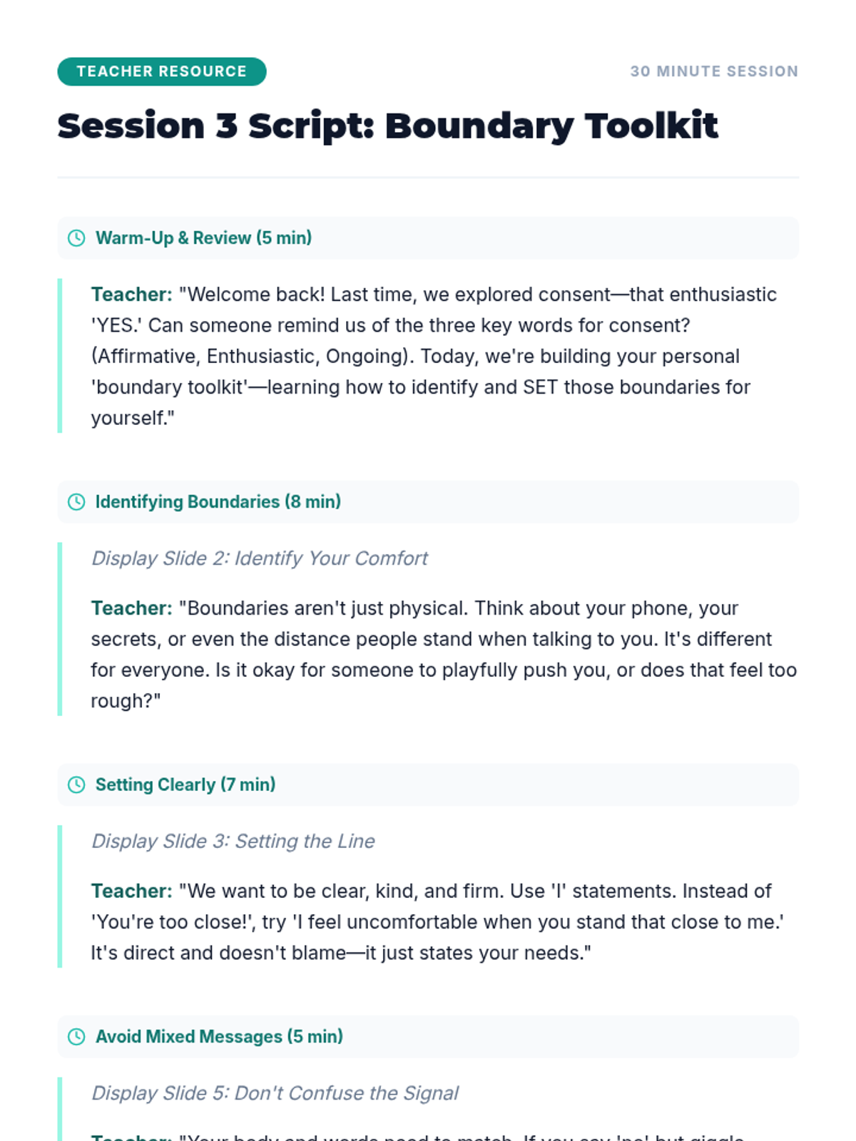 A 6-session unit for 8th-grade girls focused on physical boundaries, consent, and healthy relationships. Students learn to set and respect boundaries, understand 'No Means No', and navigate social interactions with clarity and empathy.