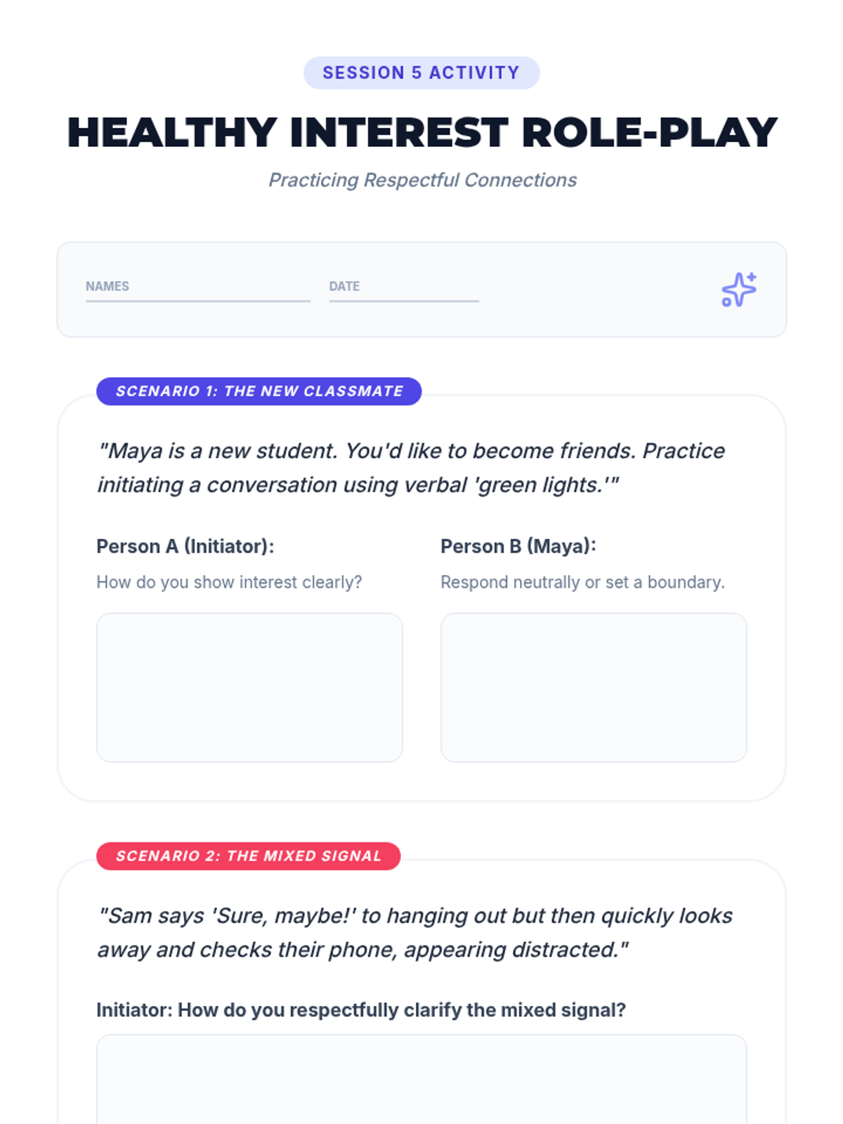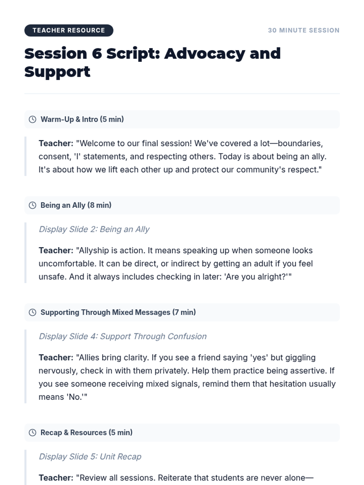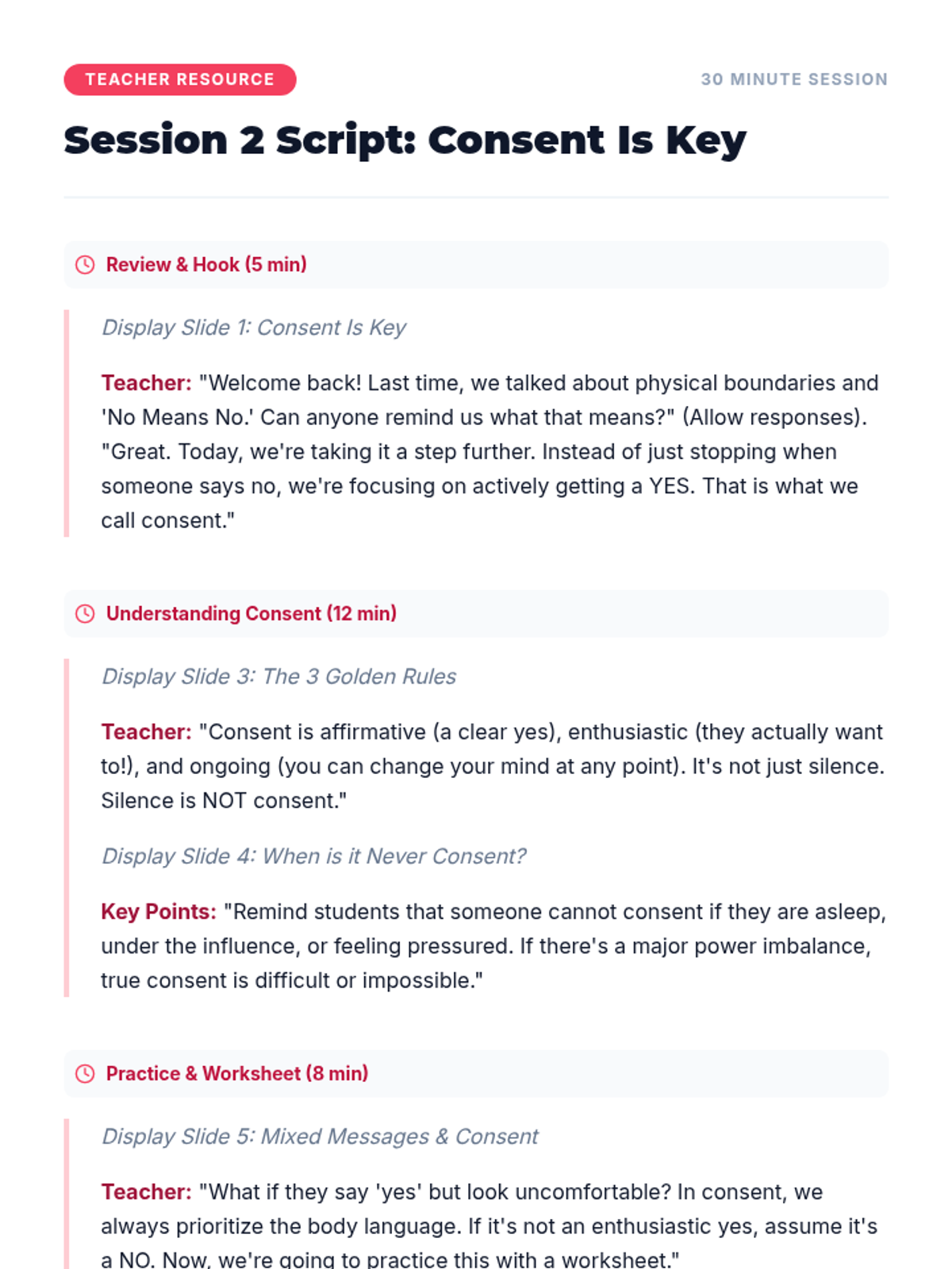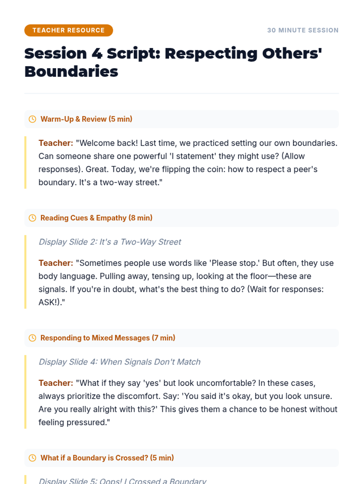 A 6-session unit for 8th-grade girls focused on physical boundaries, consent, and healthy relationships. Students learn to set and respect boundaries, understand 'No Means No', and navigate social interactions with clarity and empathy.