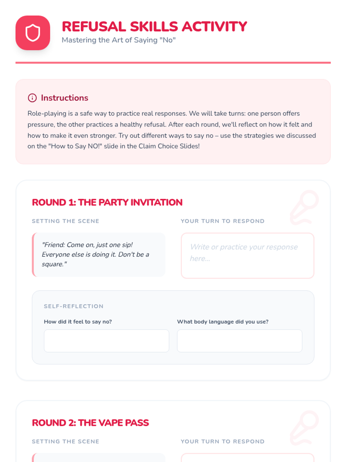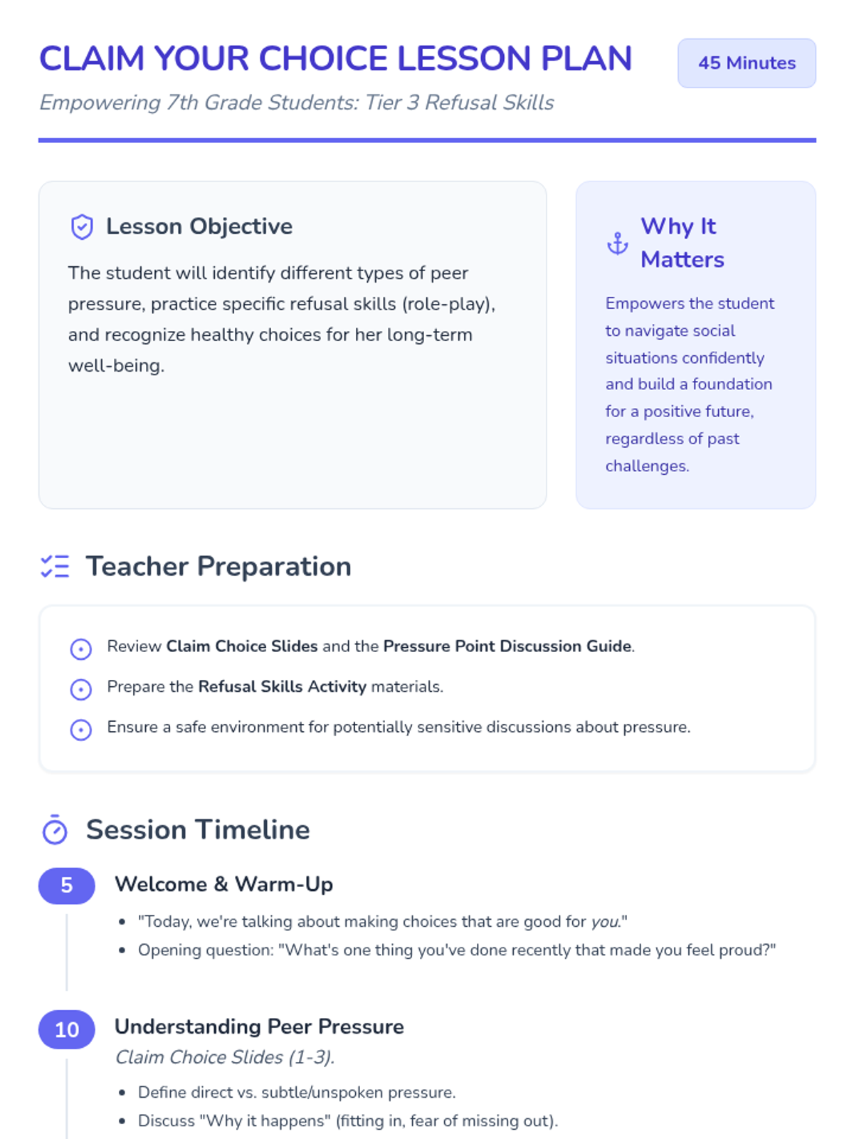 A transformative two-part sequence designed for a 7th-grade student to build self-esteem, recognize personal strengths, and develop resilient refusal skills against peer pressure.