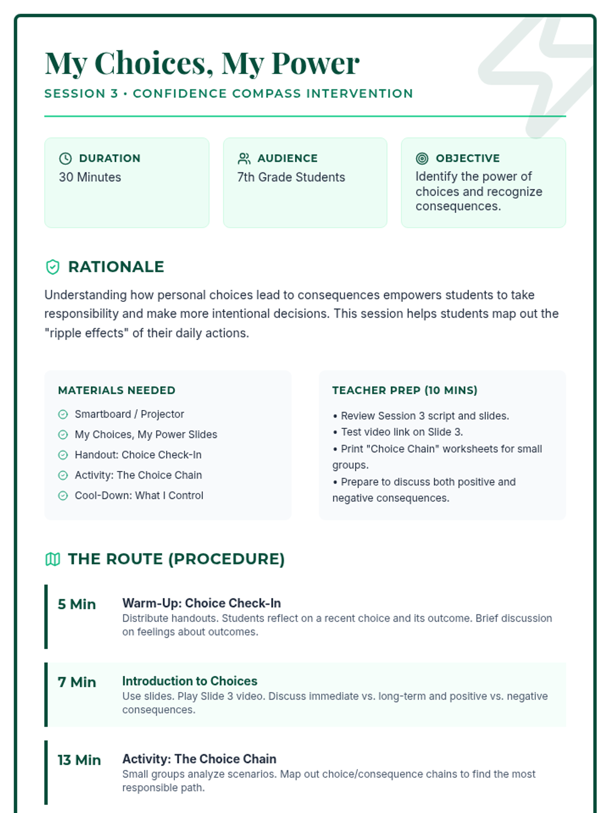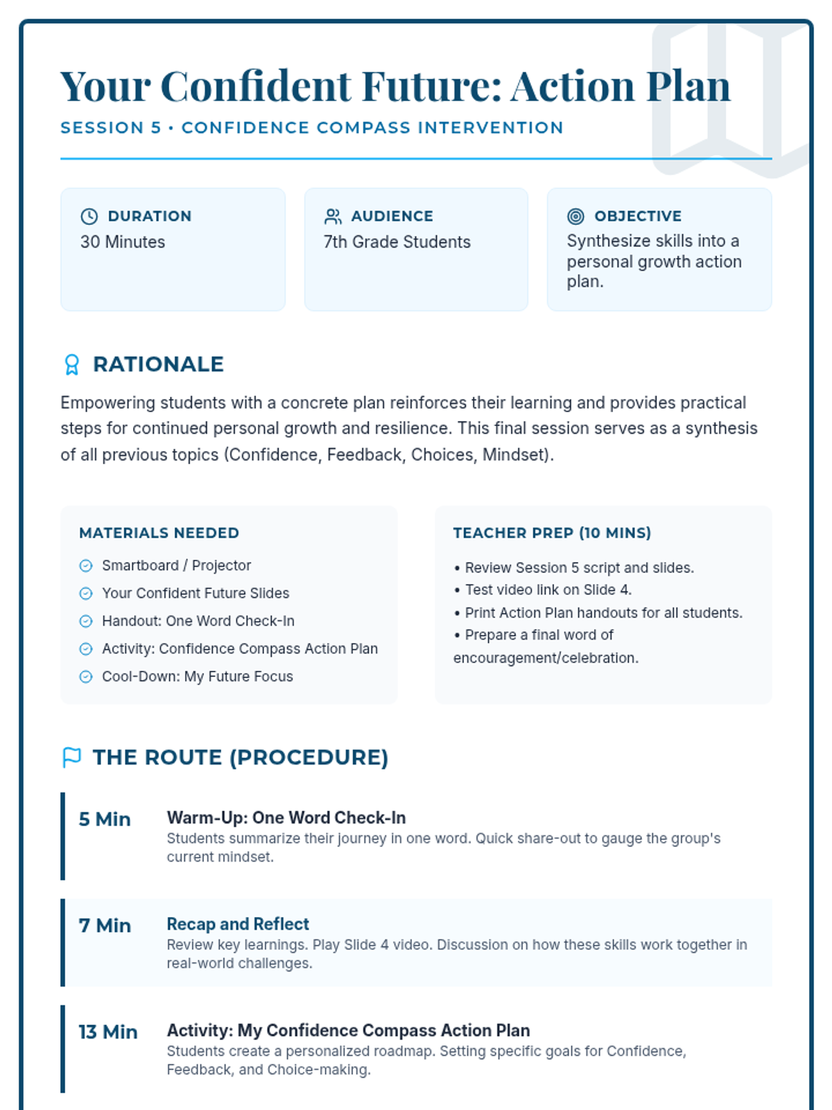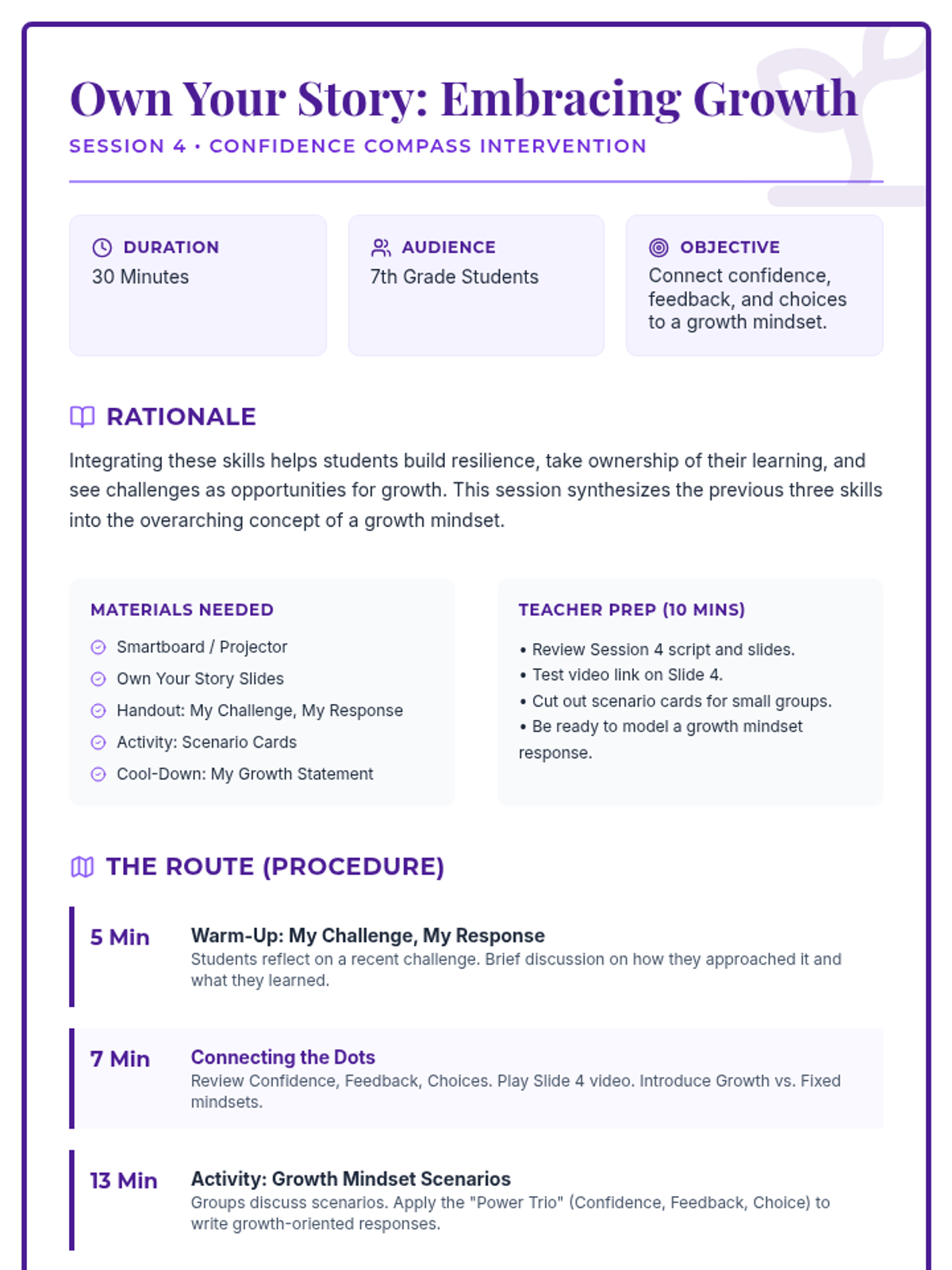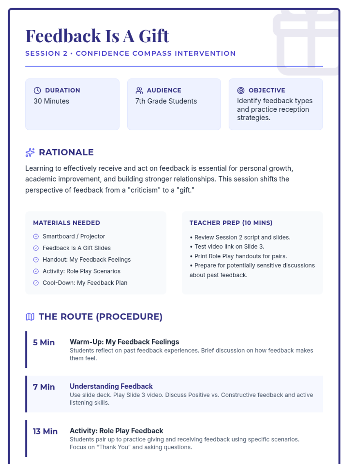 A 5-session Tier 2 intervention program for 7th-grade students designed to build self-confidence, improve feedback reception, and empower students through intentional choice-making. Students navigate their personal growth using the 'Confidence Compass' framework.