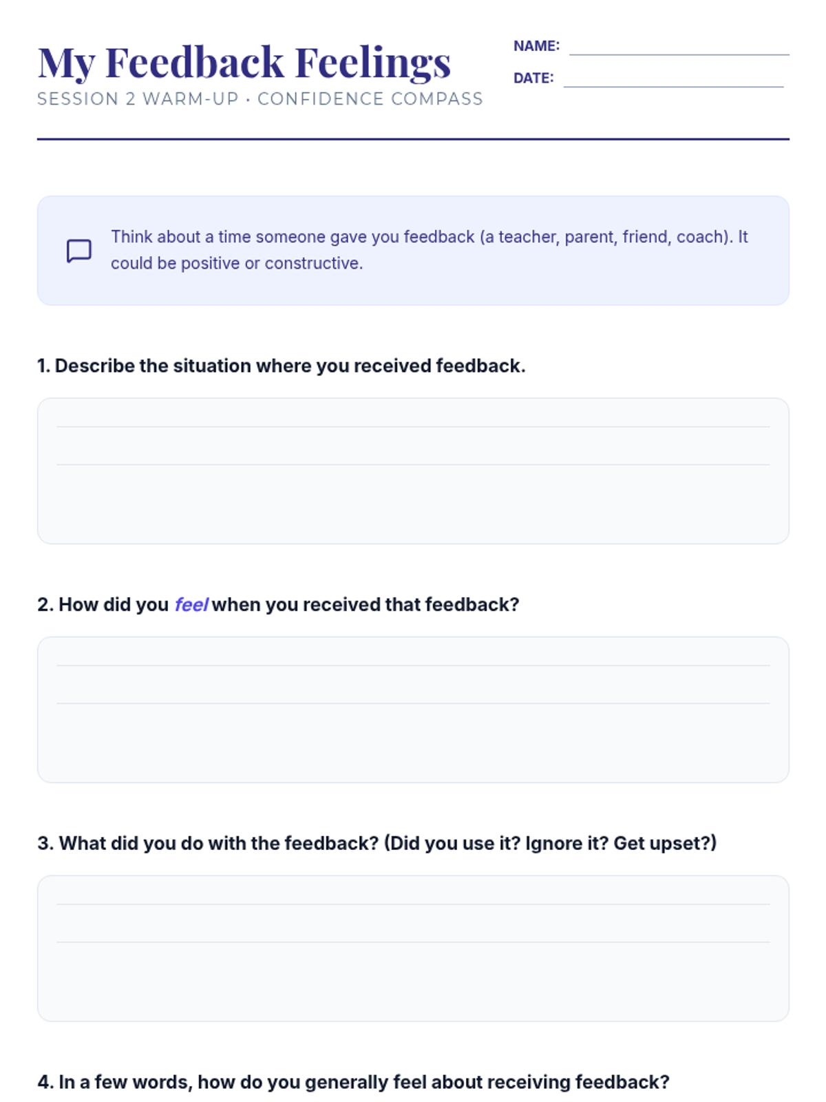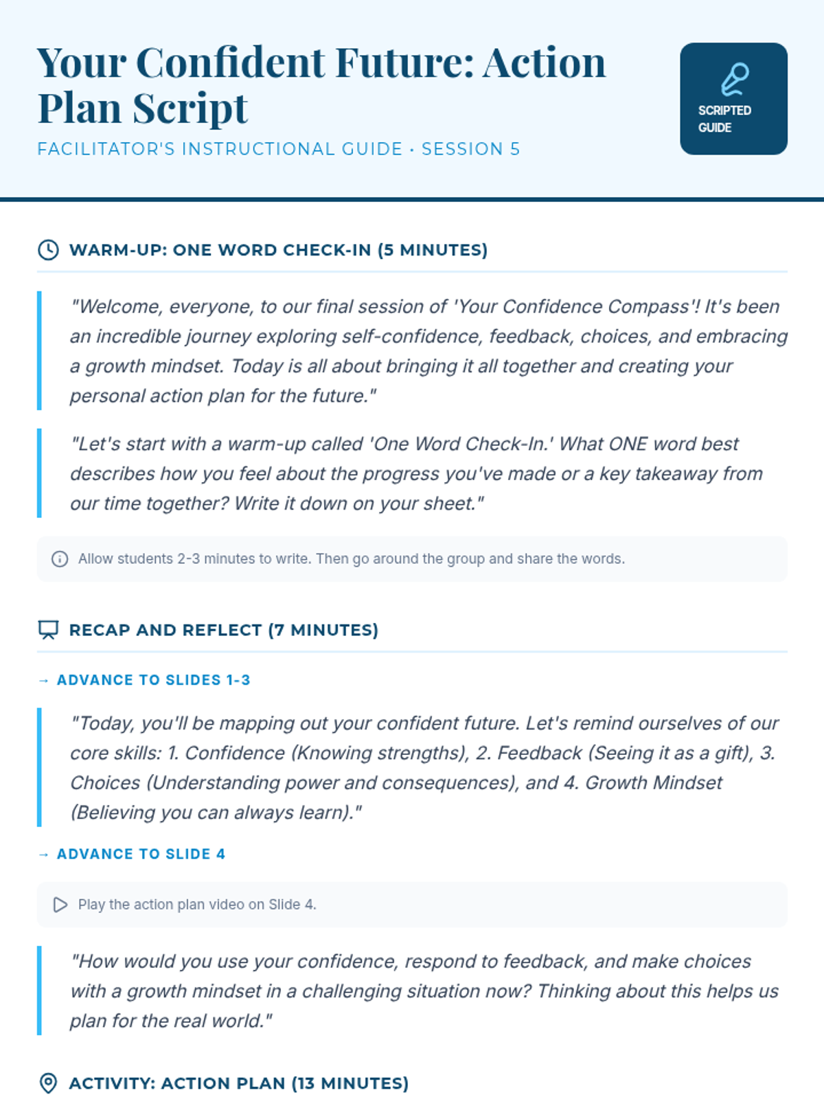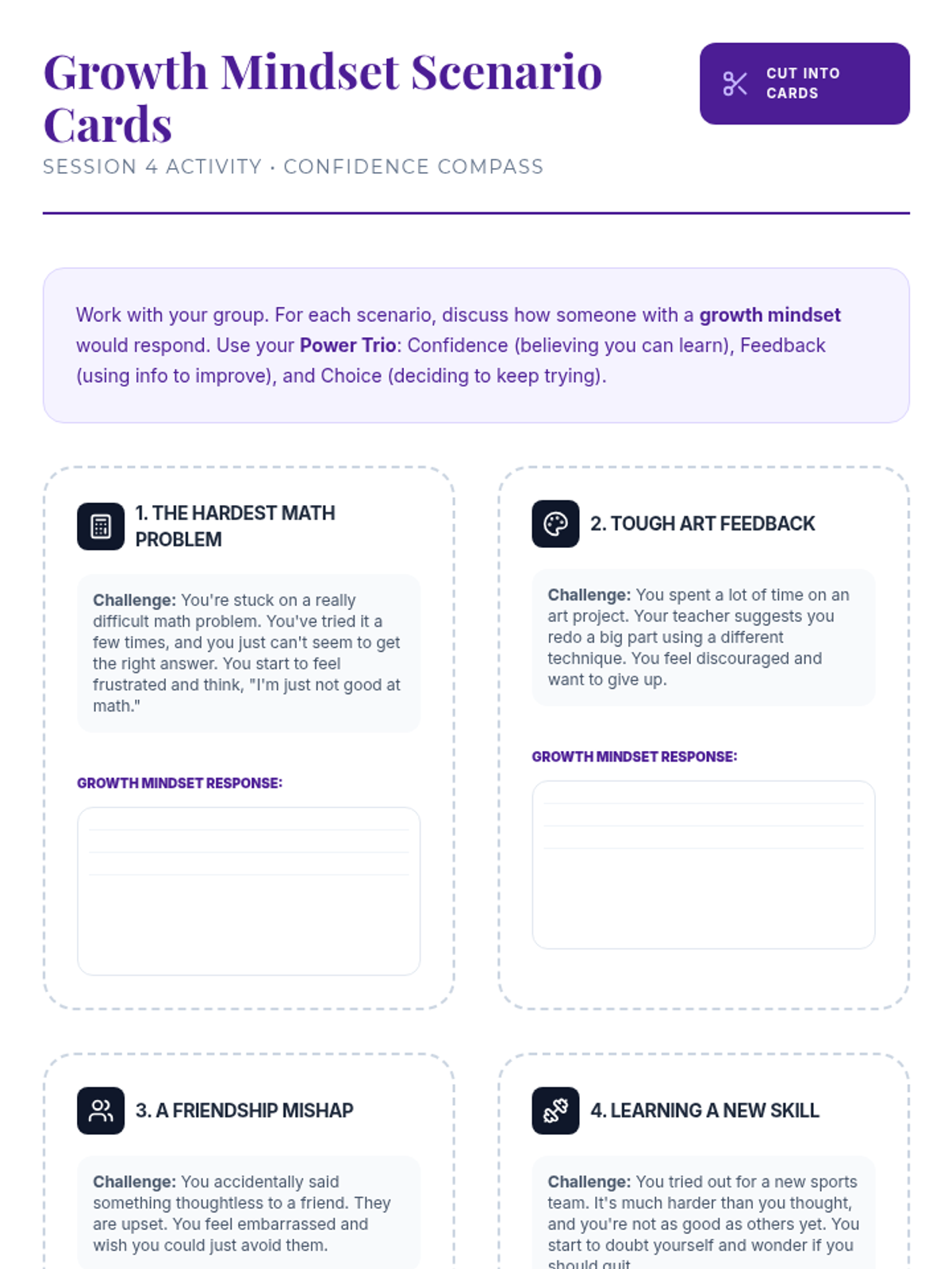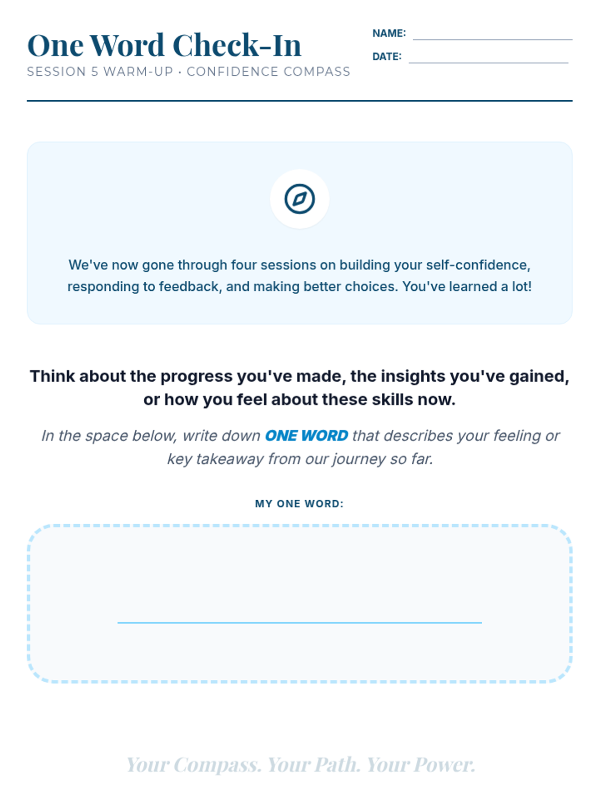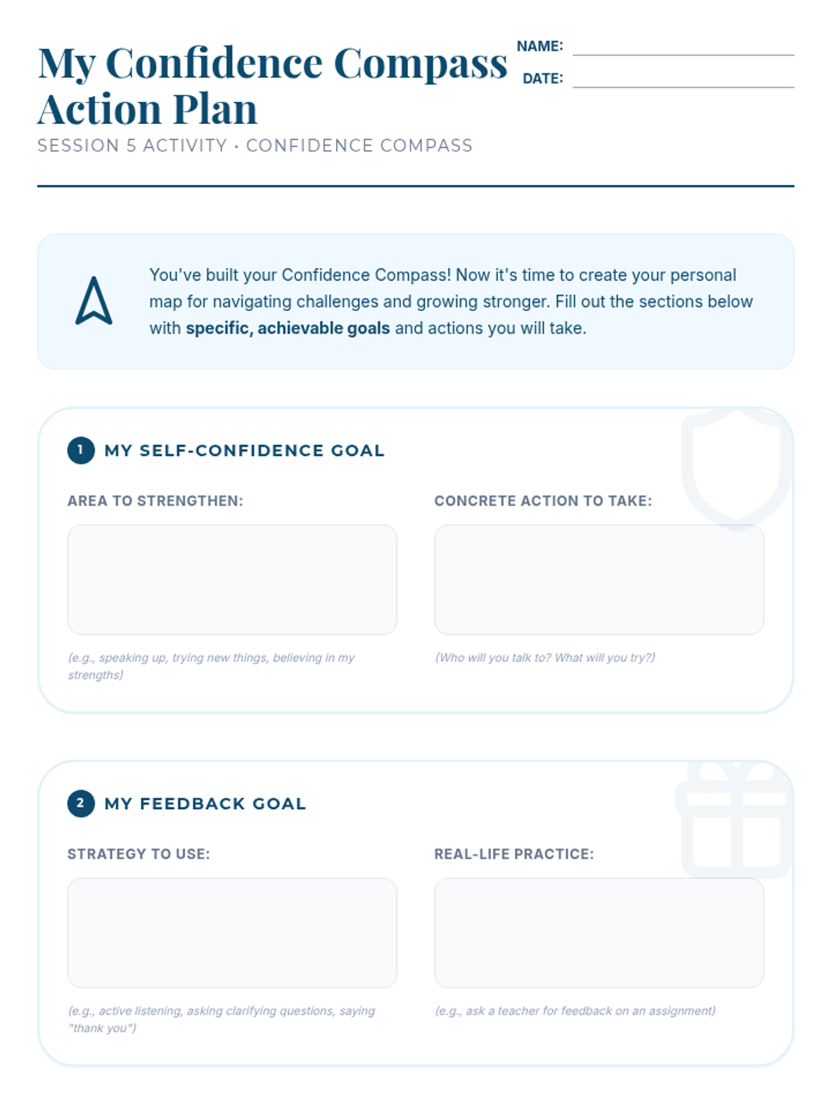 A 5-session Tier 2 intervention program for 7th-grade students designed to build self-confidence, improve feedback reception, and empower students through intentional choice-making. Students navigate their personal growth using the 'Confidence Compass' framework.