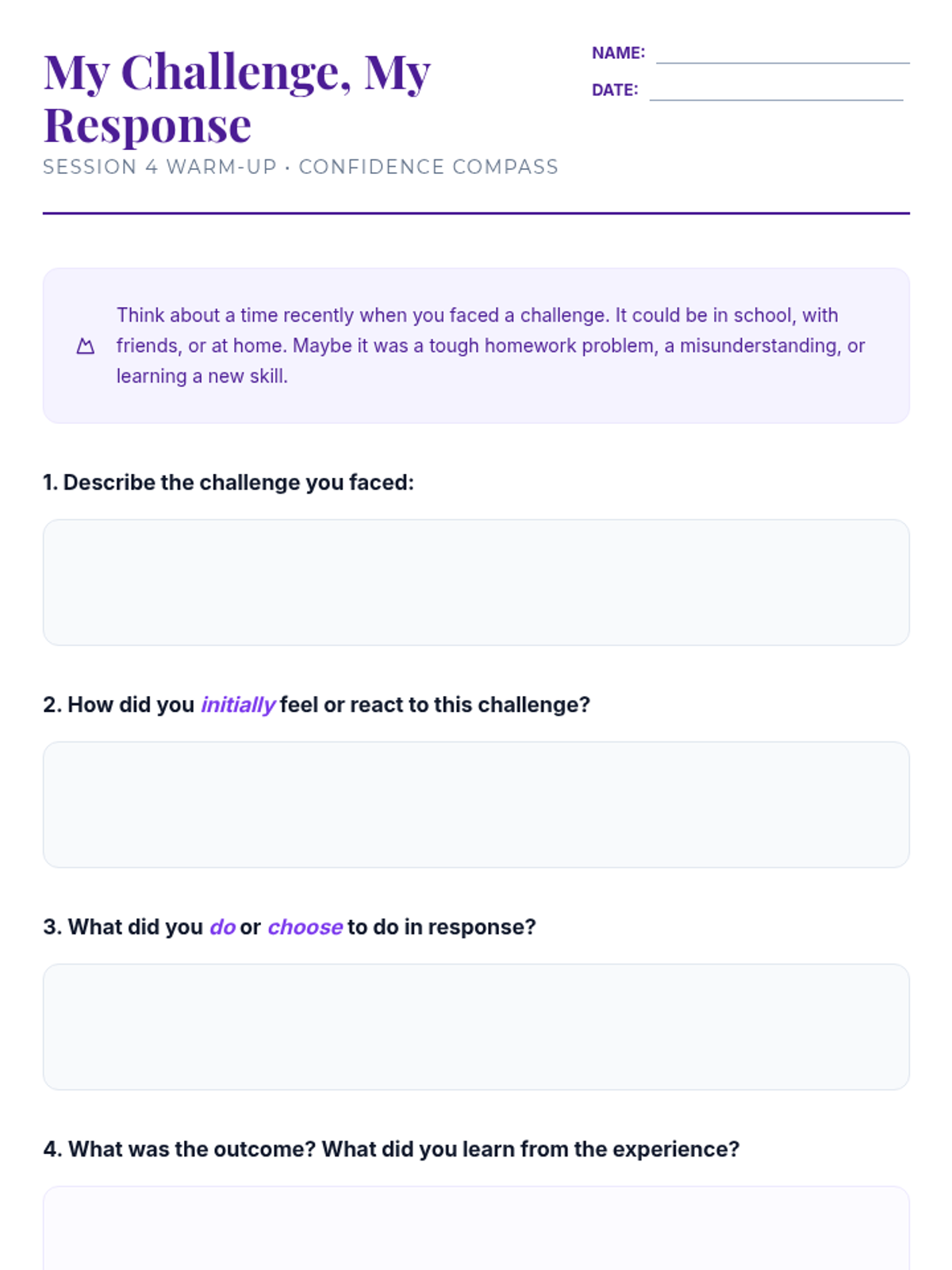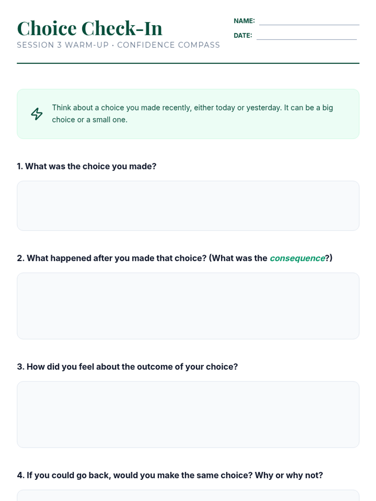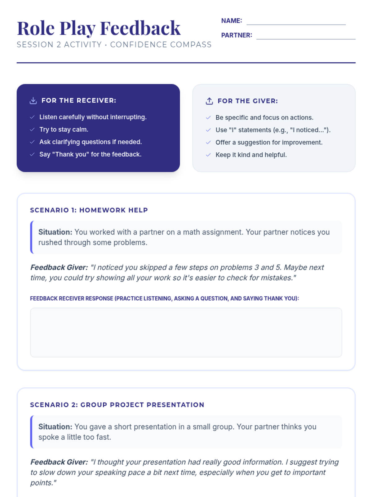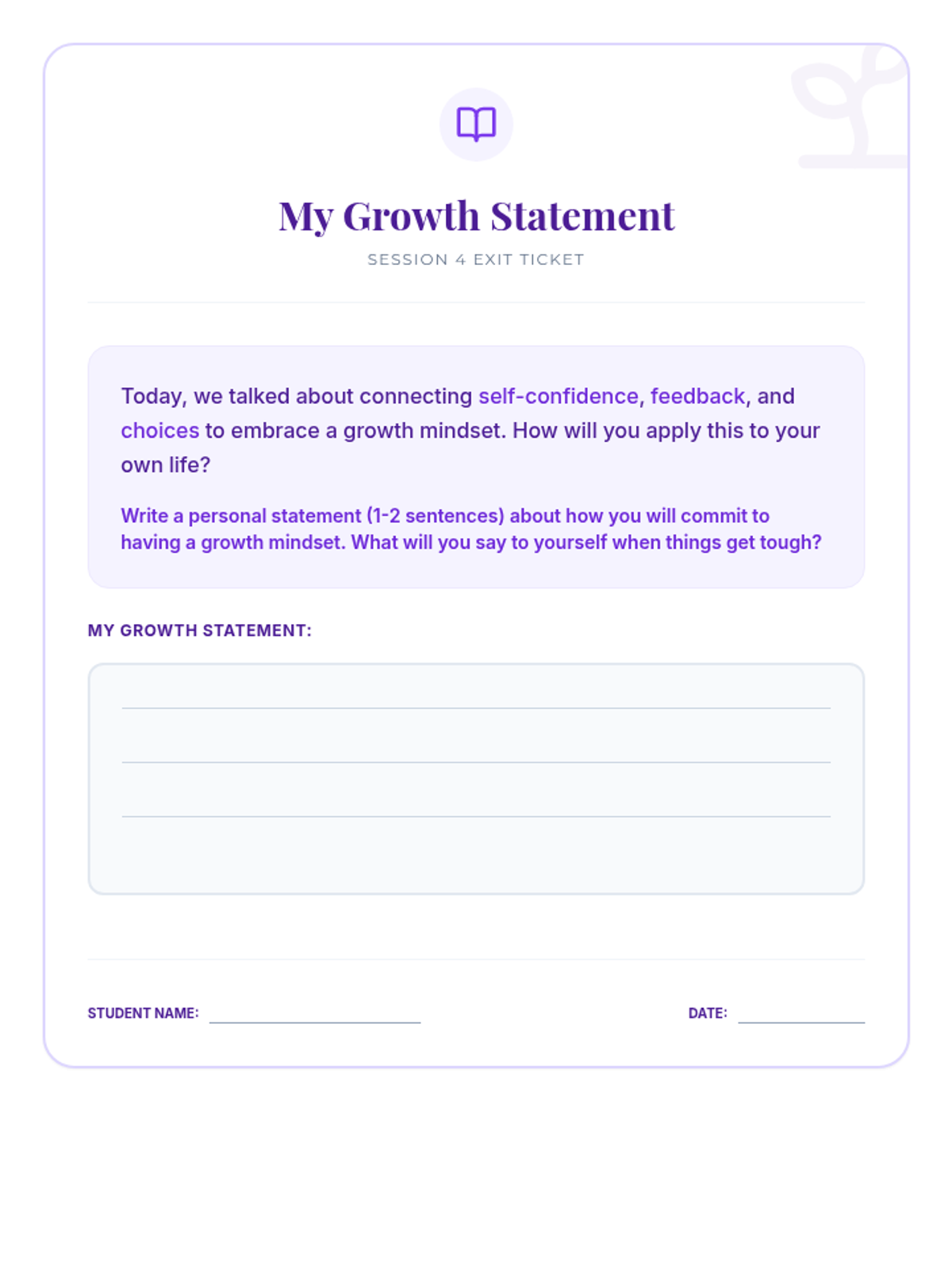 A 5-session Tier 2 intervention program for 7th-grade students designed to build self-confidence, improve feedback reception, and empower students through intentional choice-making. Students navigate their personal growth using the 'Confidence Compass' framework.
