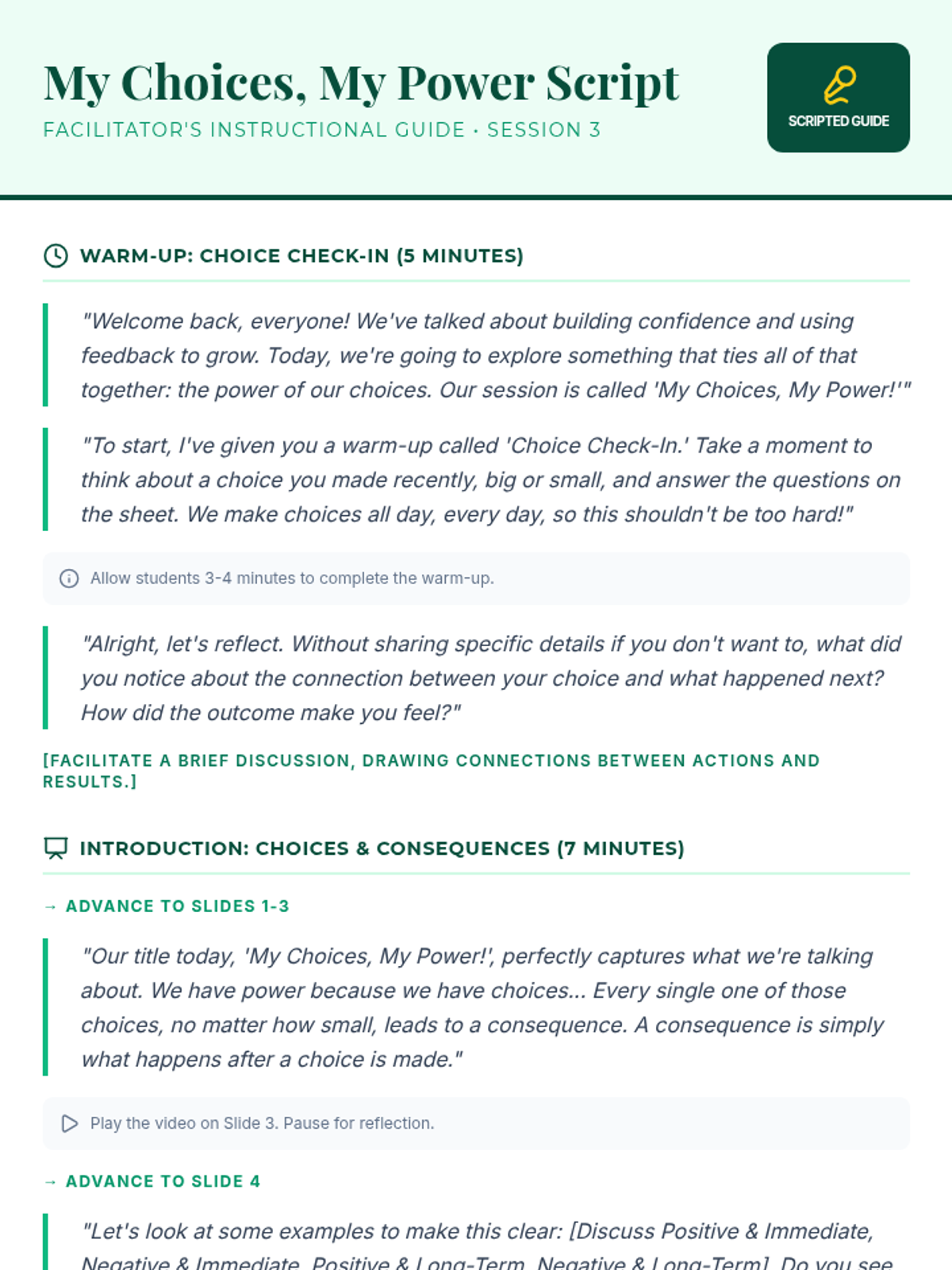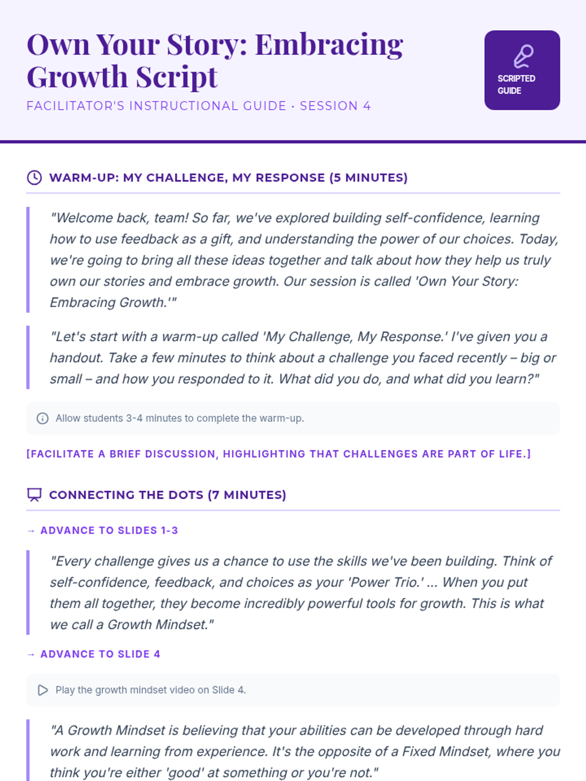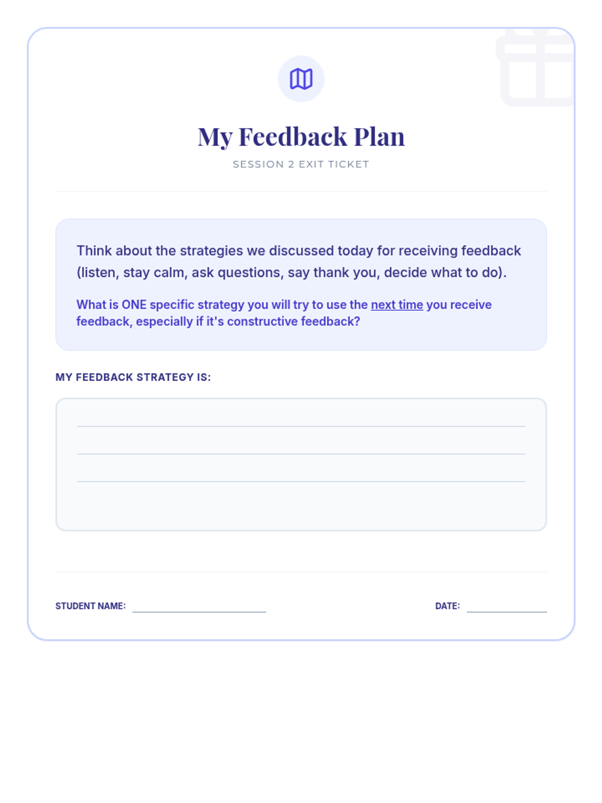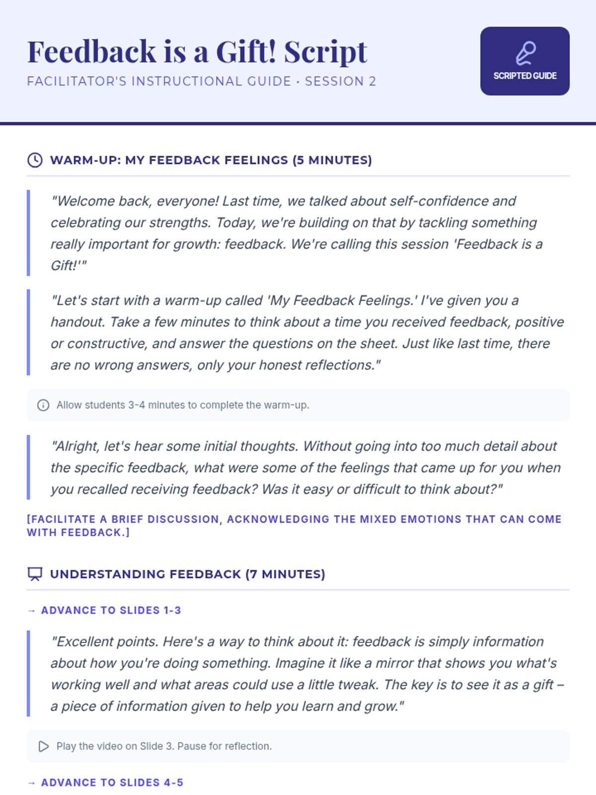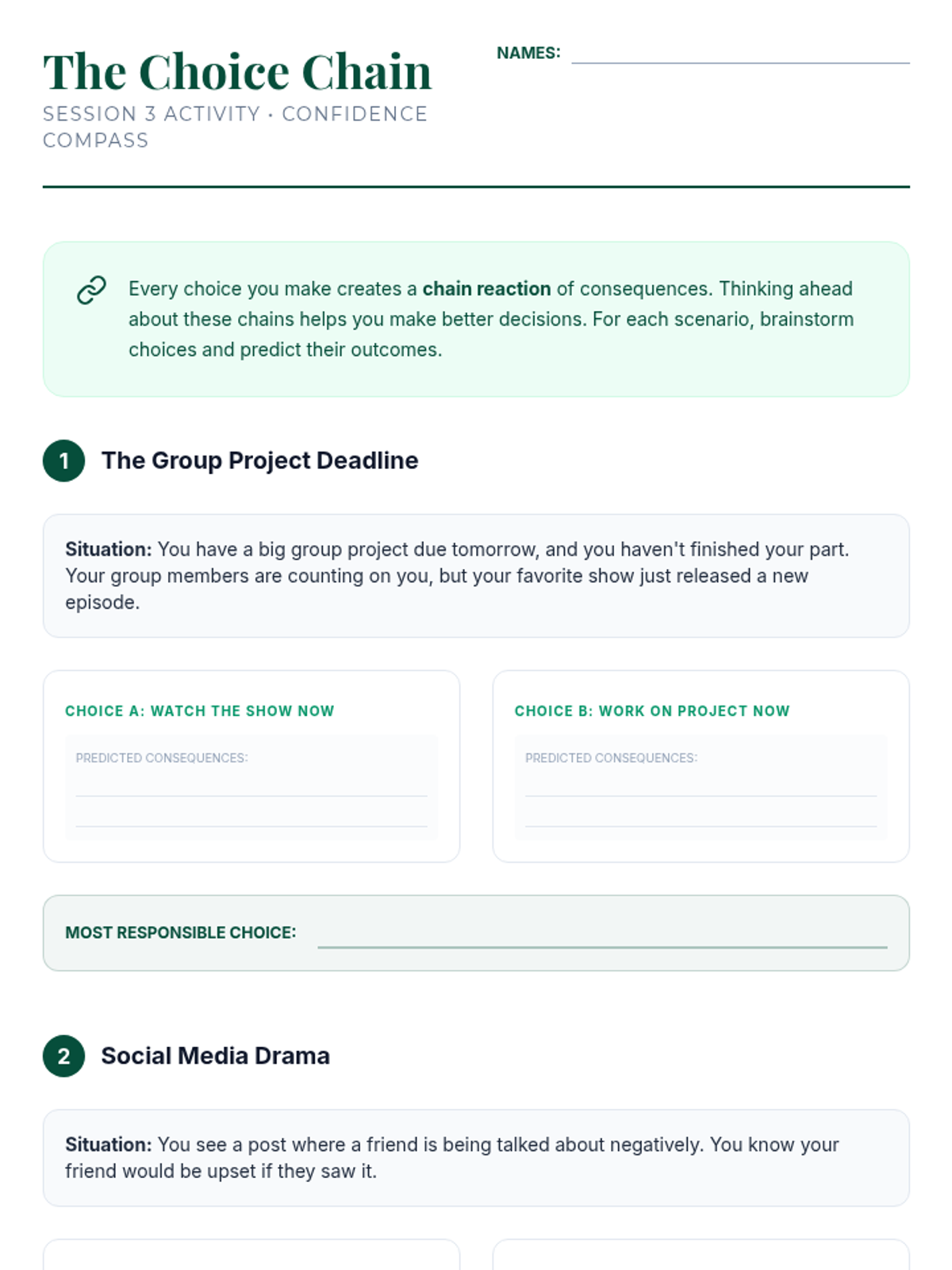A 5-session Tier 2 intervention program for 7th-grade students designed to build self-confidence, improve feedback reception, and empower students through intentional choice-making. Students navigate their personal growth using the 'Confidence Compass' framework.