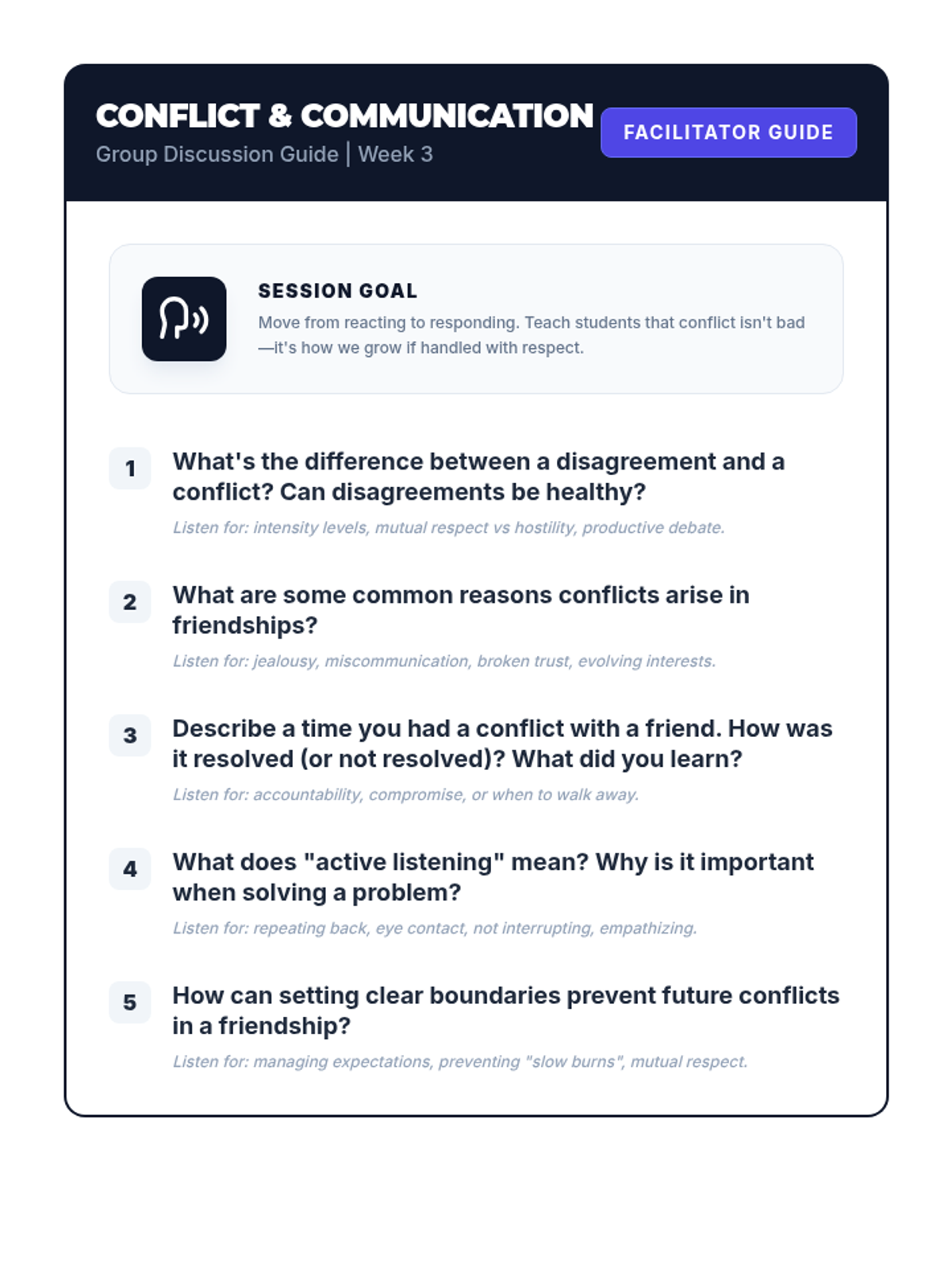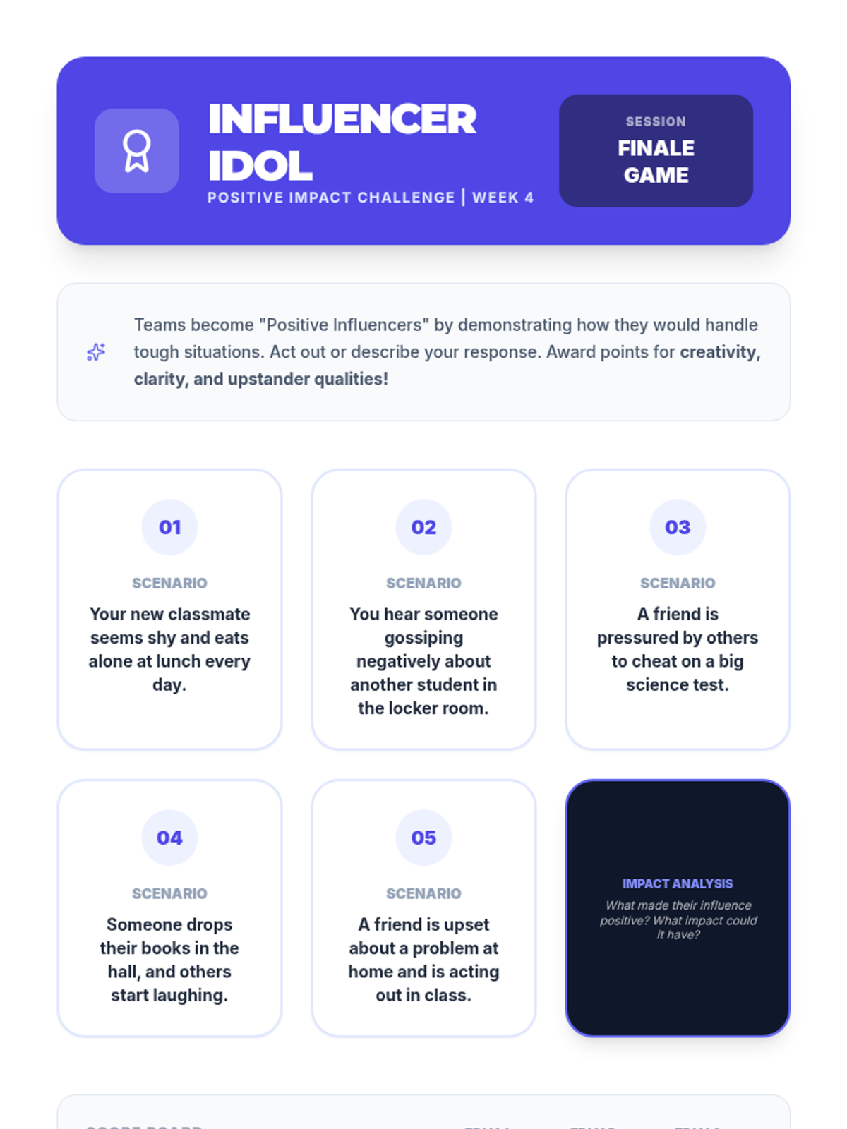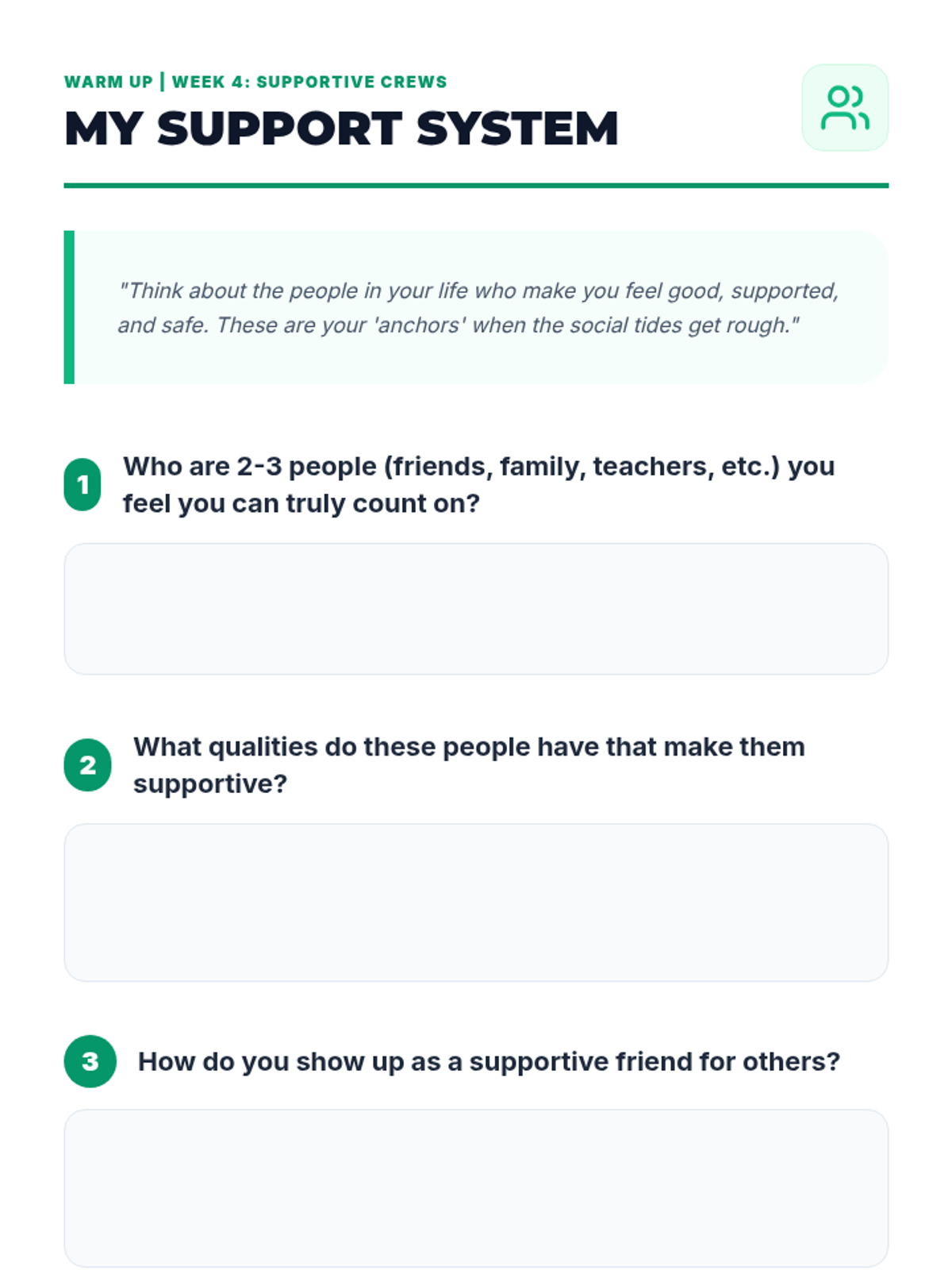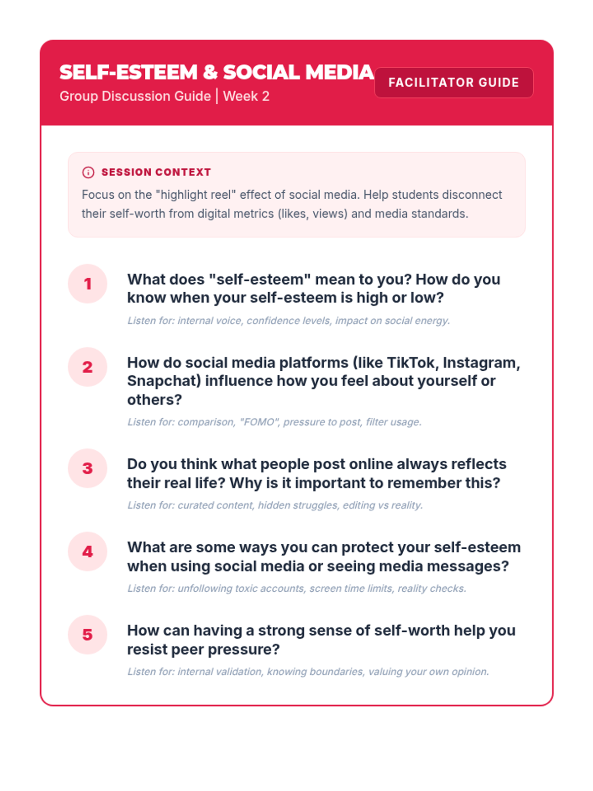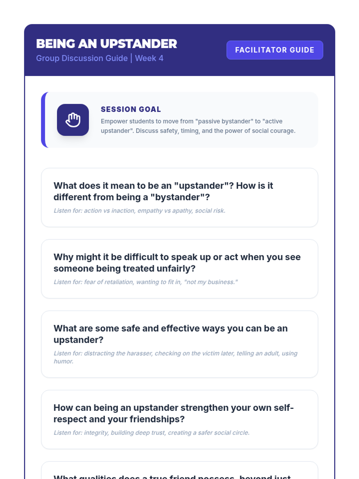 A 4-week Tier 2 intervention for 8th-grade students to navigate peer pressure, understand social dynamics, and build healthy relationships through interactive sessions and self-reflection.