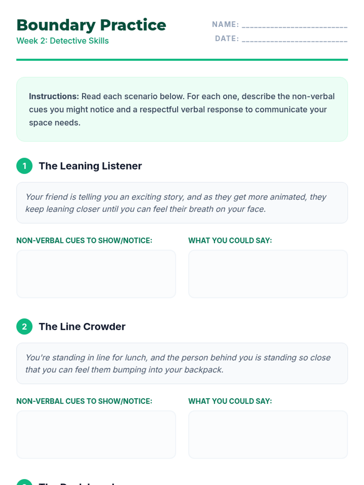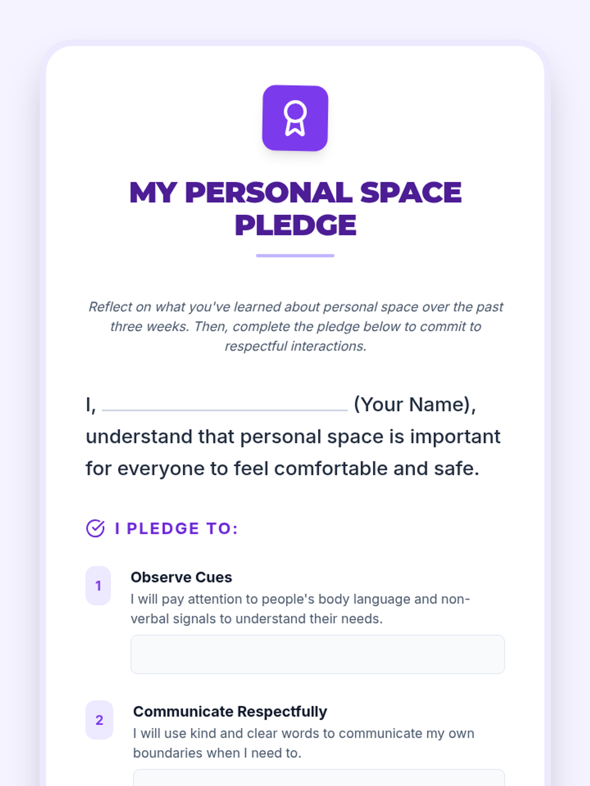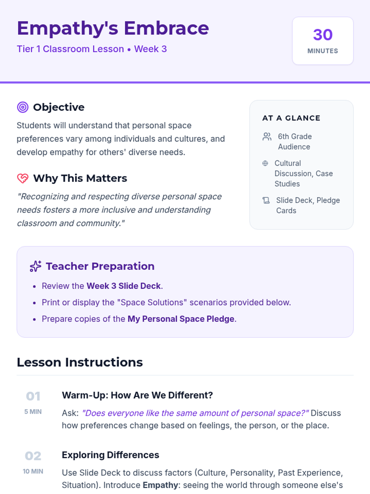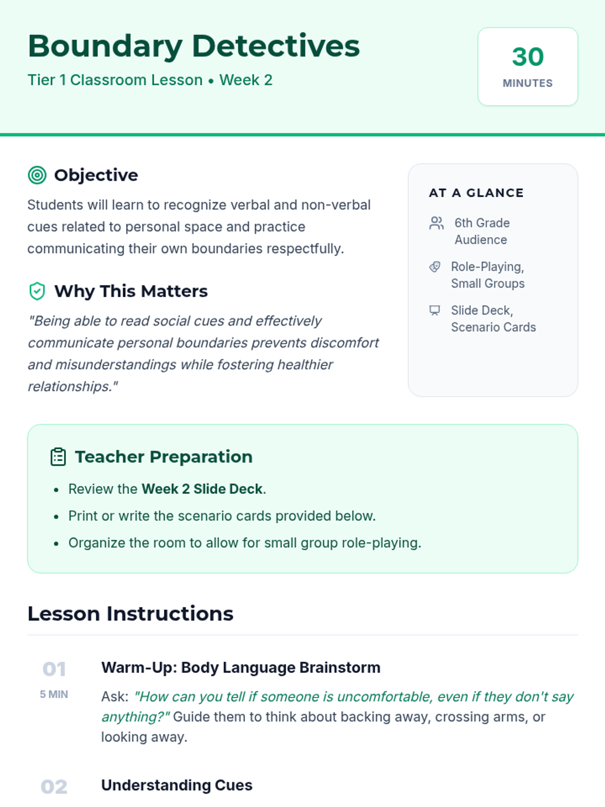 A 3-week unit for 6th-grade students focused on understanding personal space, recognizing boundaries, and practicing empathy through interactive lessons and reflection.