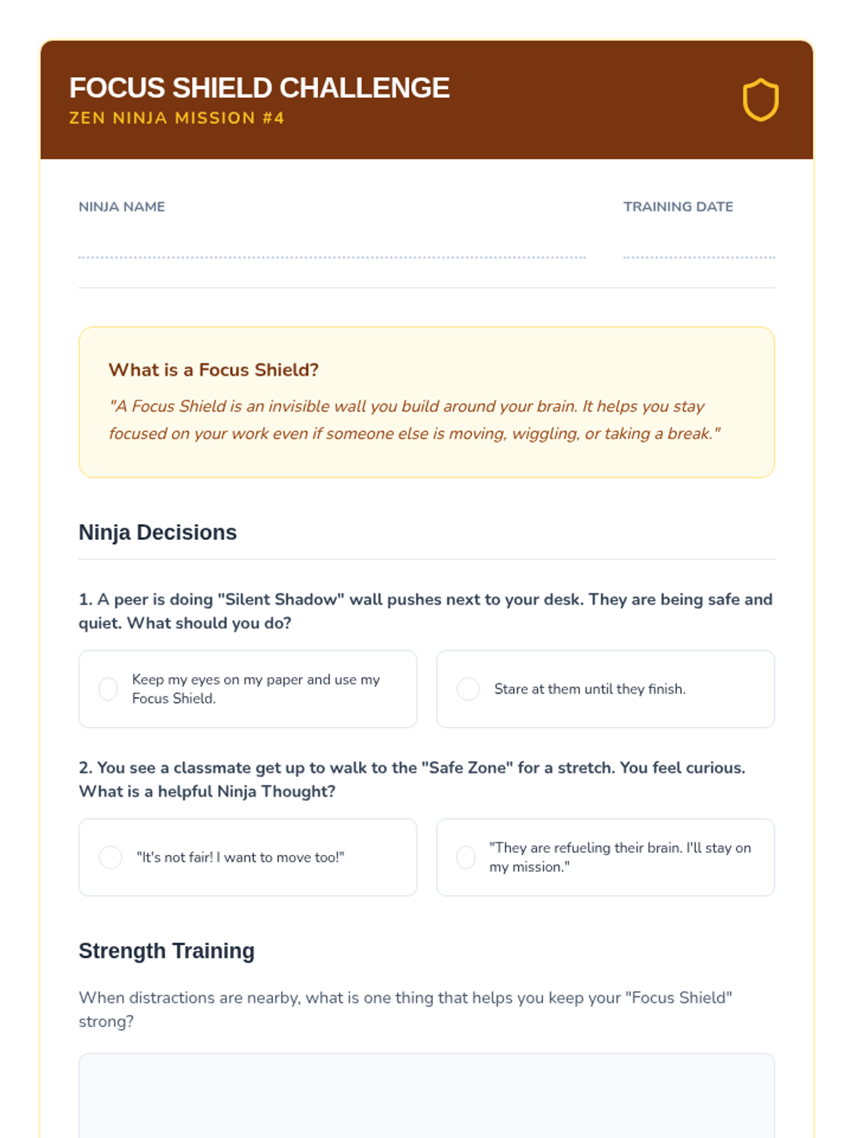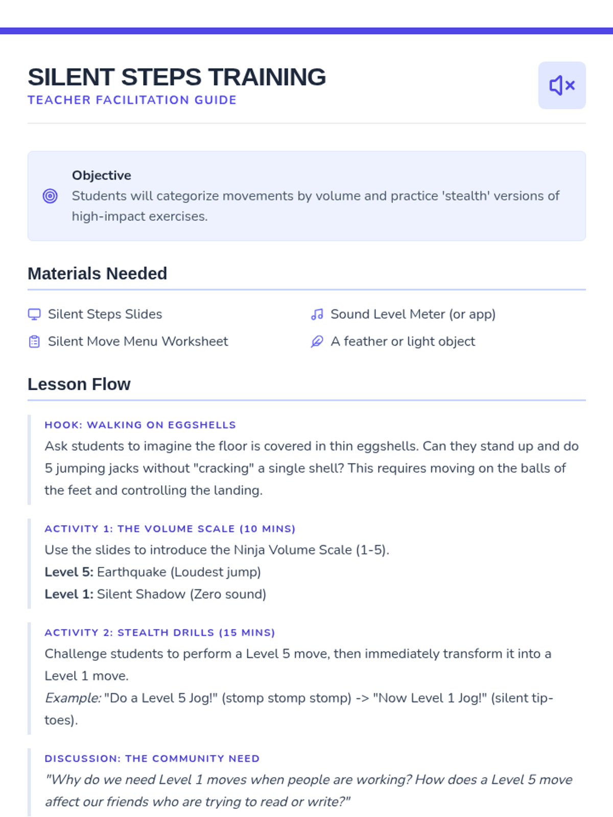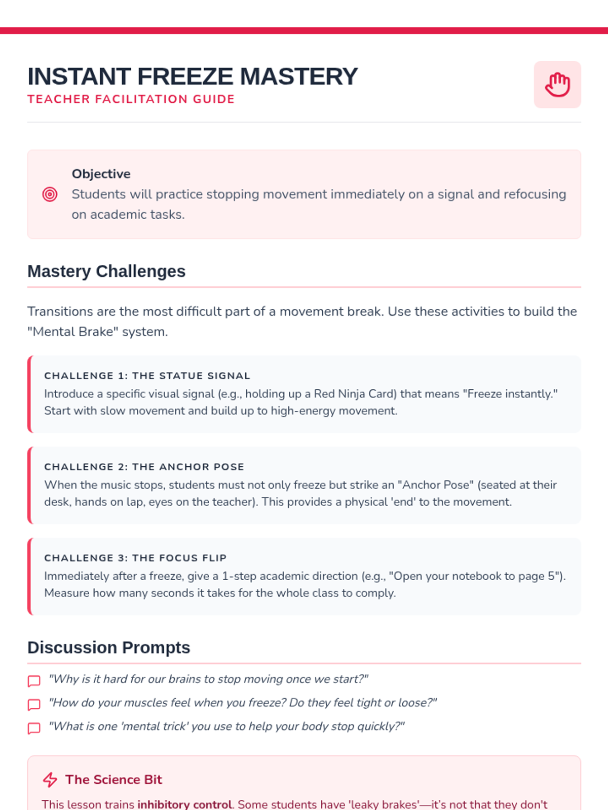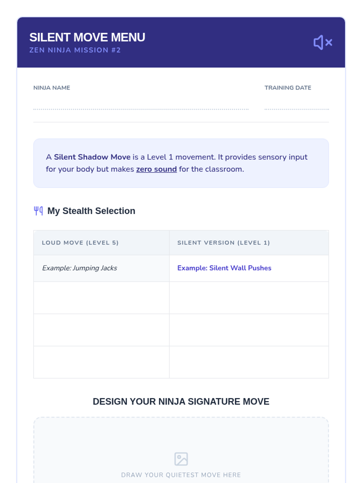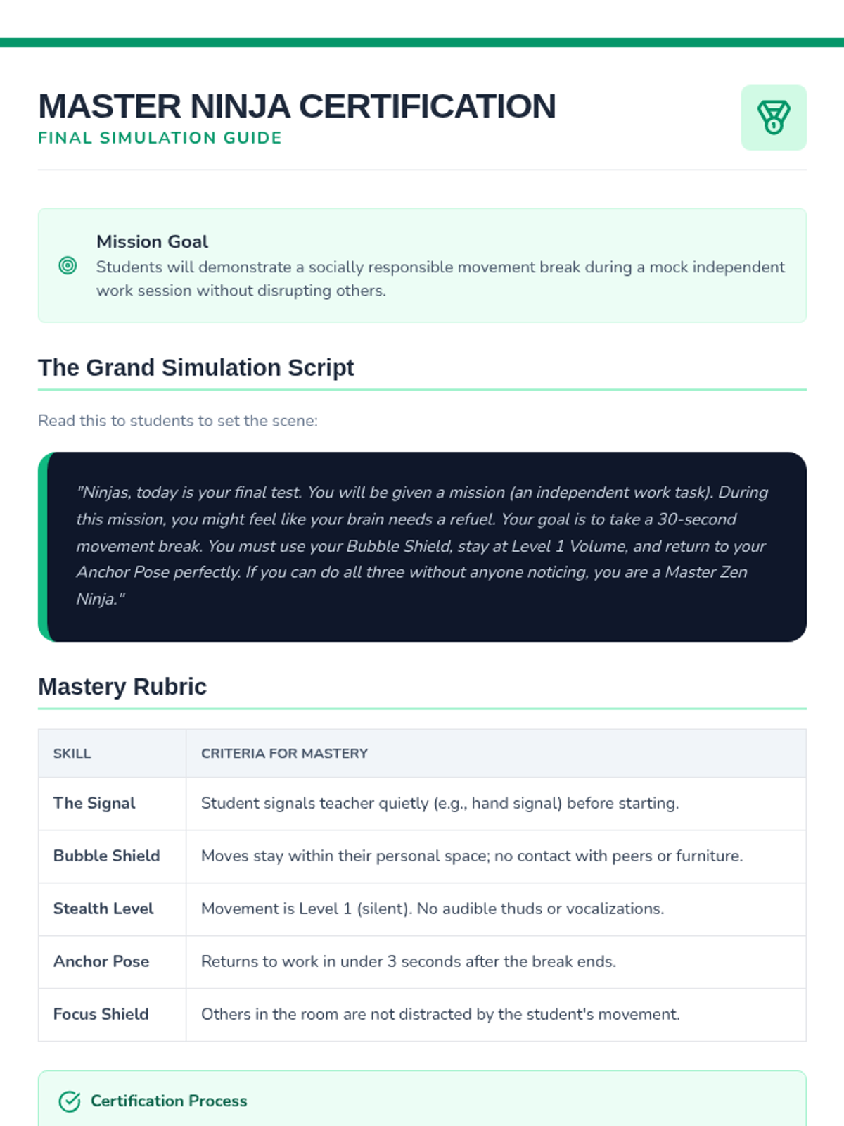 This sequence teaches 3rd-grade students how to utilize movement breaks socially and responsibly. Students learn spatial awareness, auditory control, and focus-shifting to regulate their sensory needs without disrupting the classroom community.