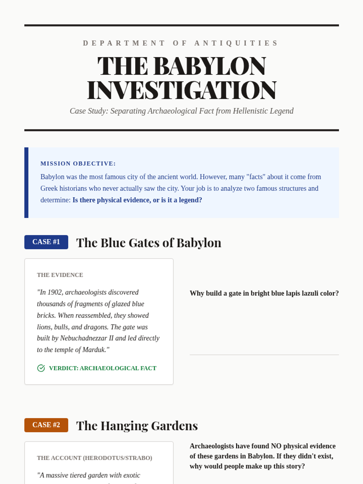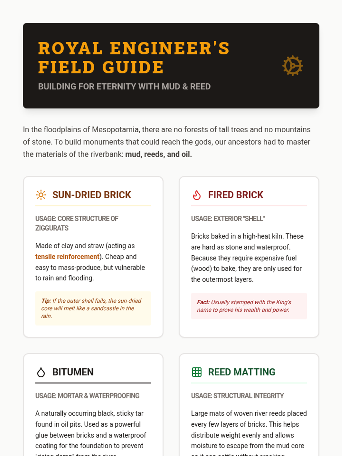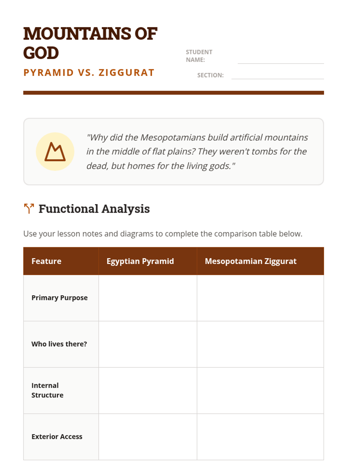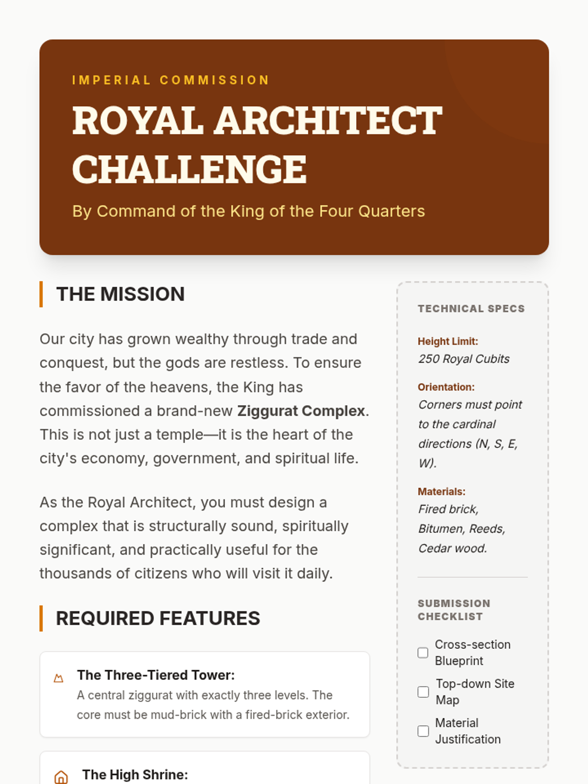 This project-based sequence explores how the religion and engineering of Ancient Mesopotamia converged in the construction of ziggurats. Students investigate polytheistic beliefs, materials science of mud-bricks, and the design of complex temple cities.