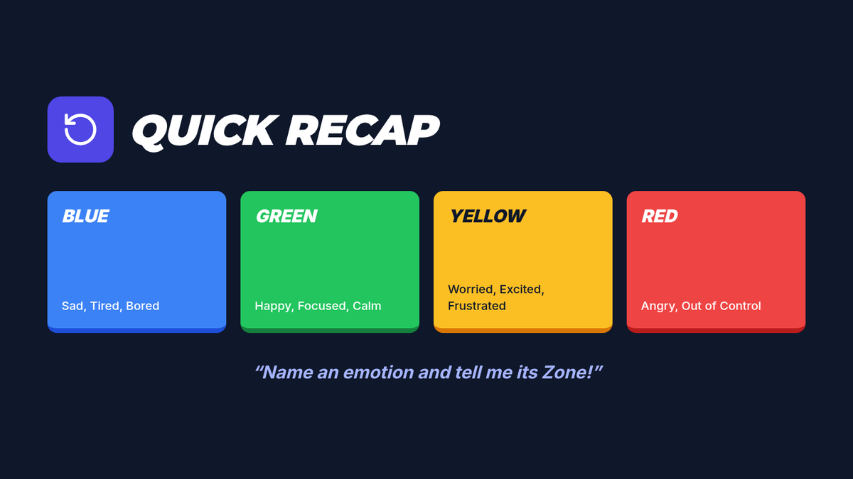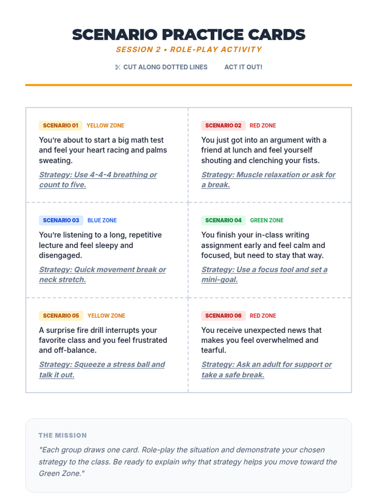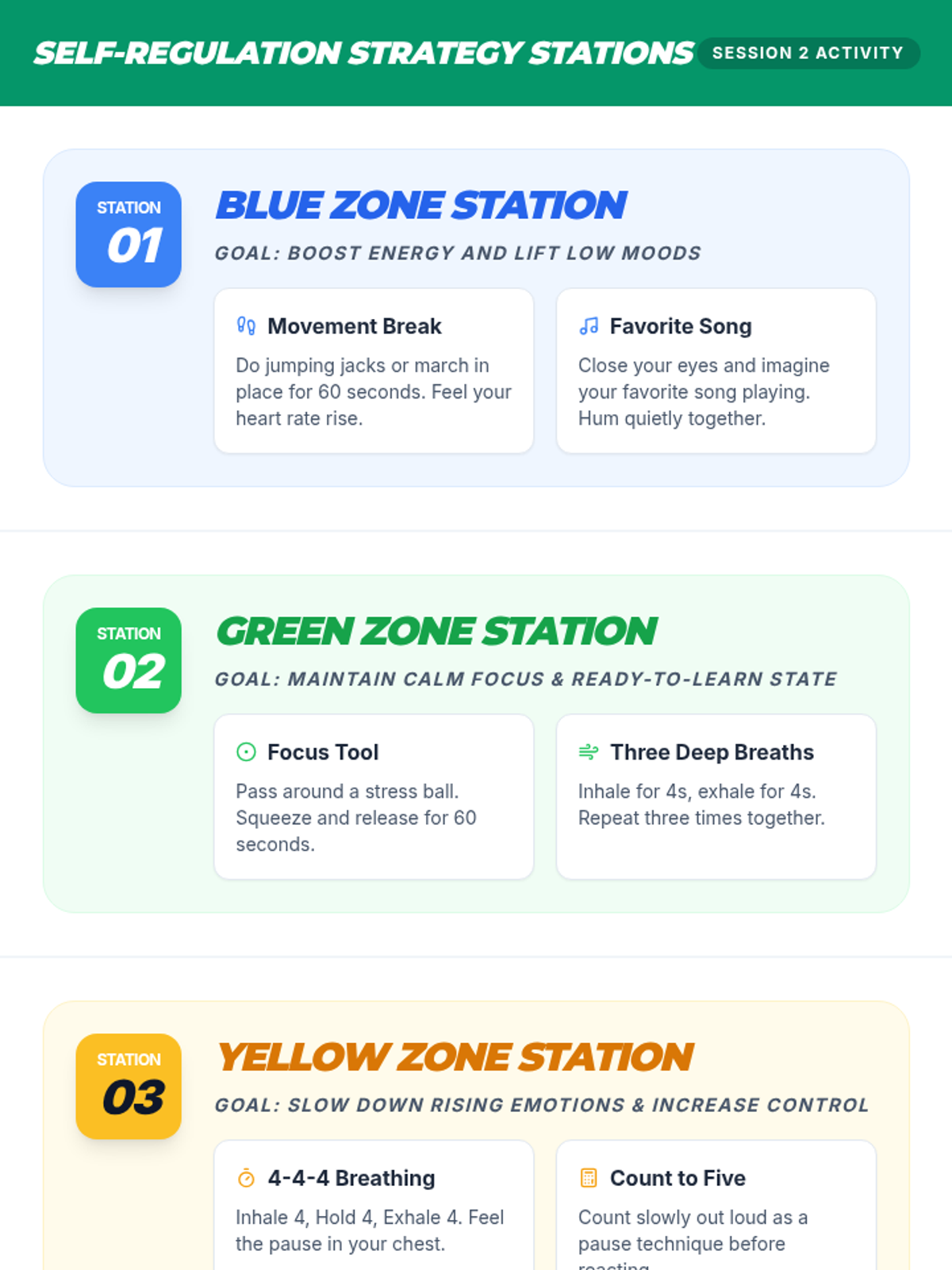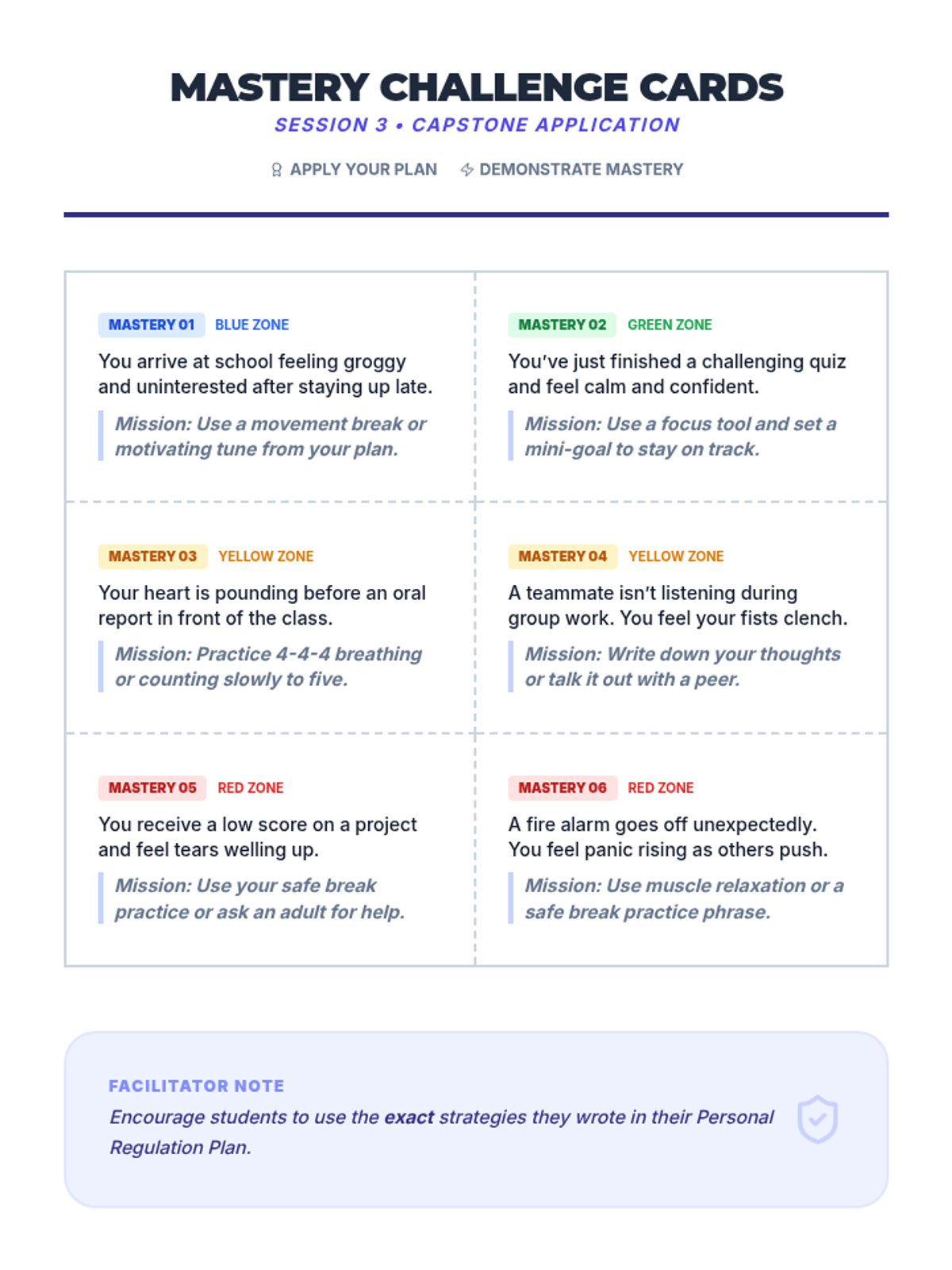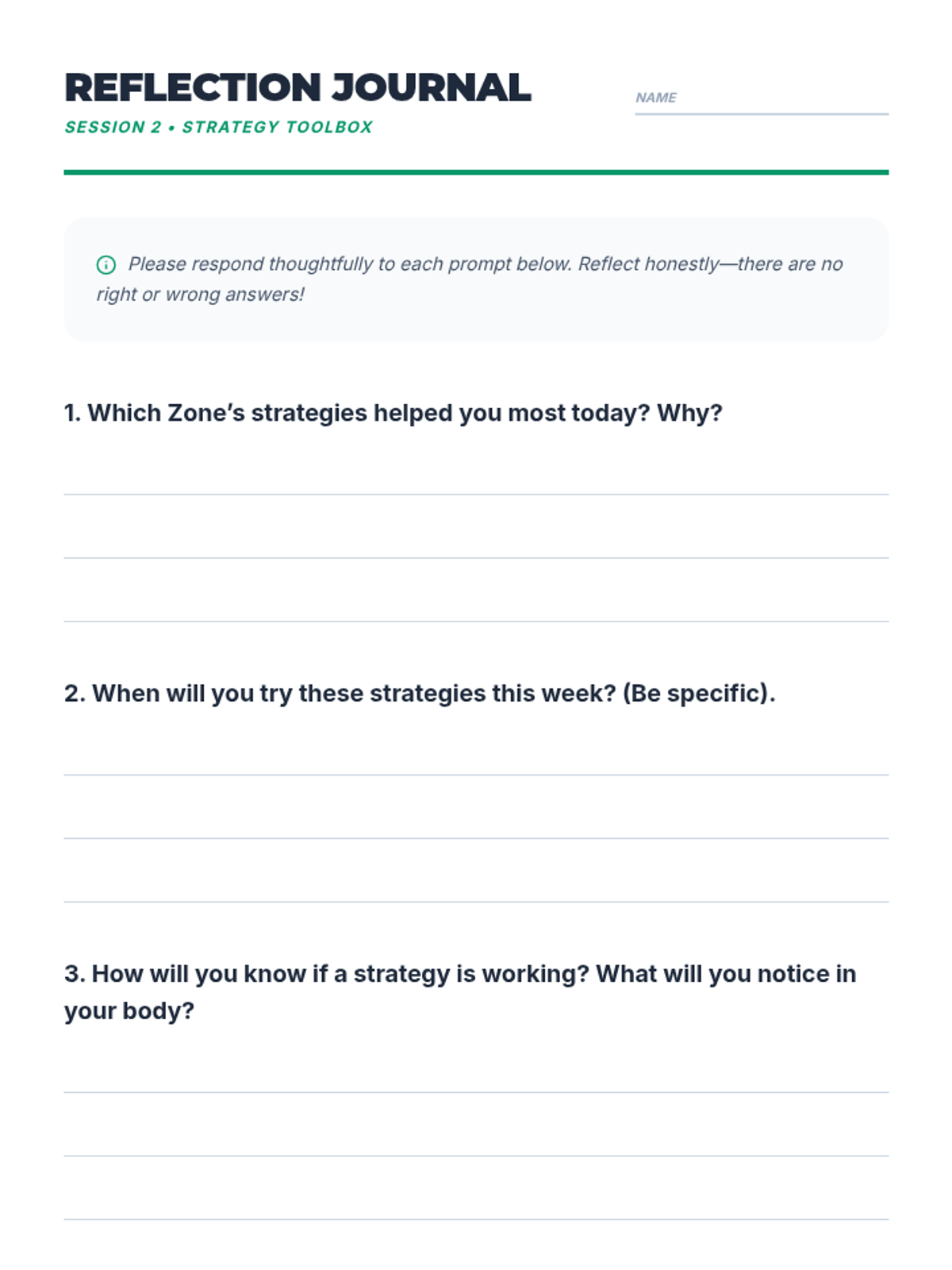 A 3-session emotional intelligence program for middle schoolers to identify, understand, and manage their emotions using the Zones of Regulation framework. Students move from basic identification to personalized self-regulation planning.
