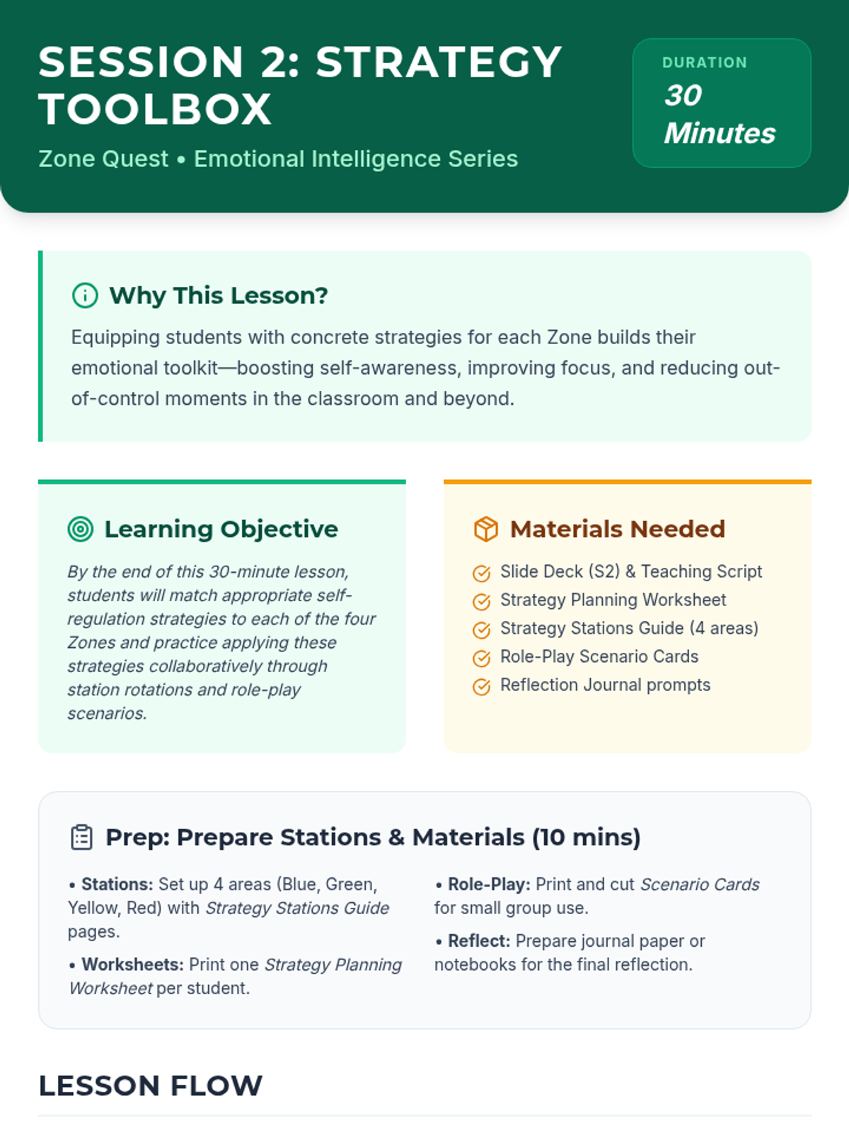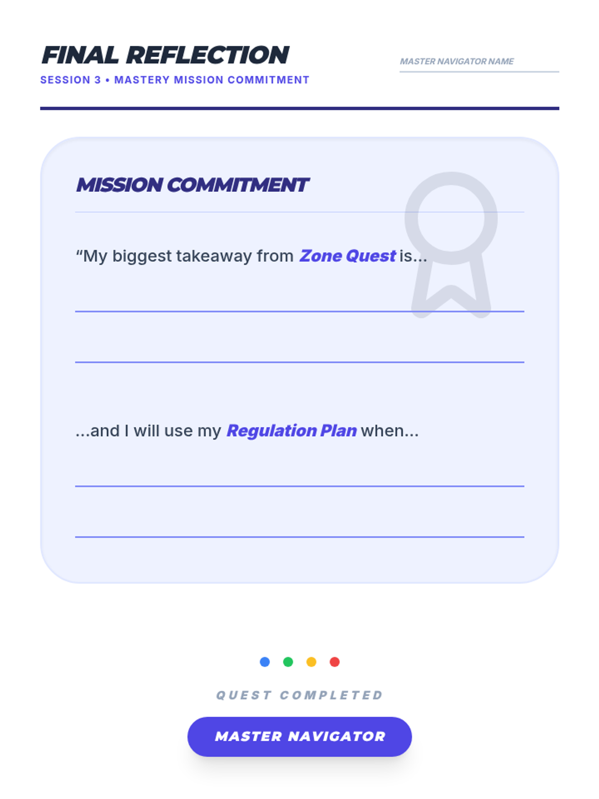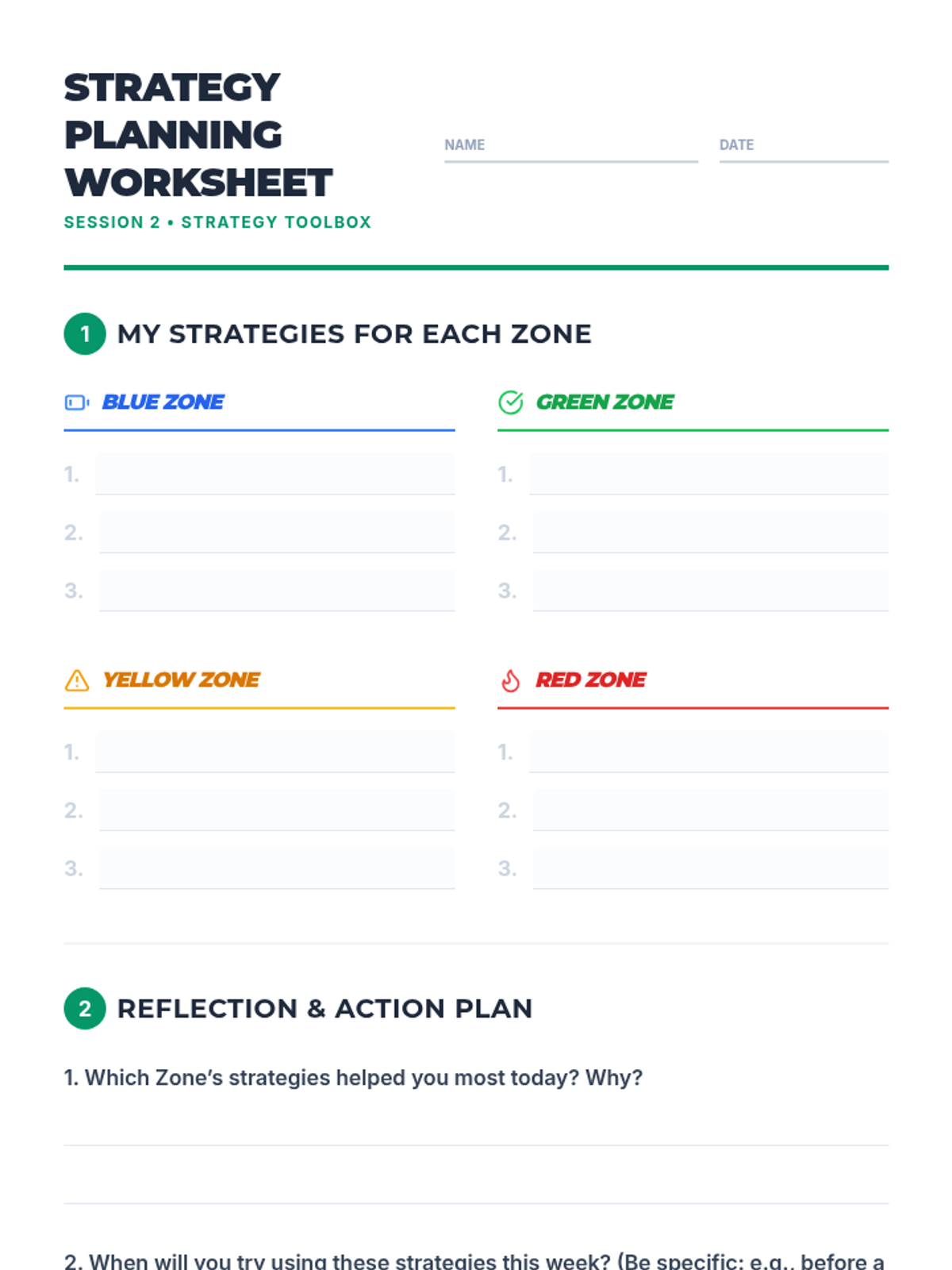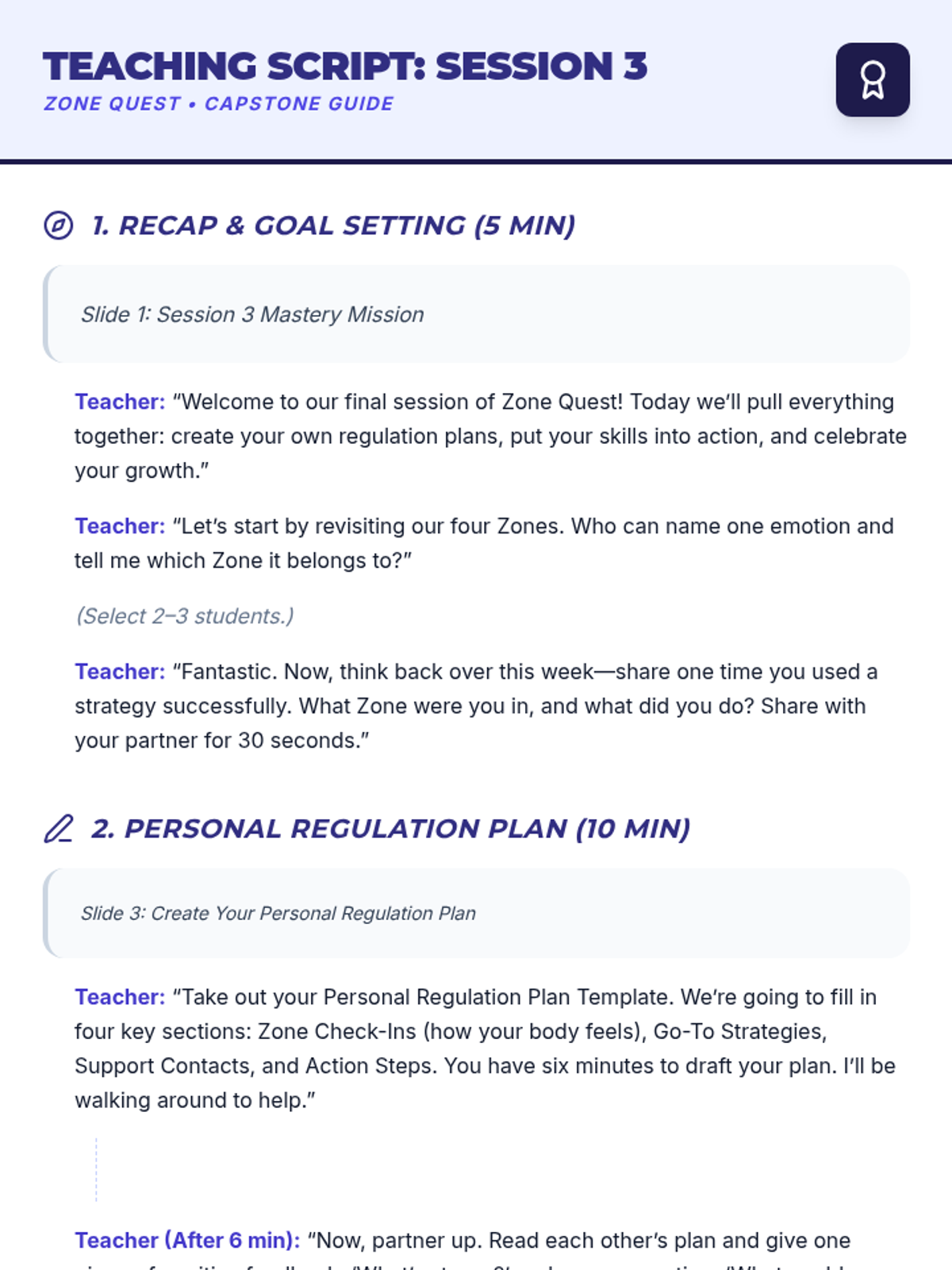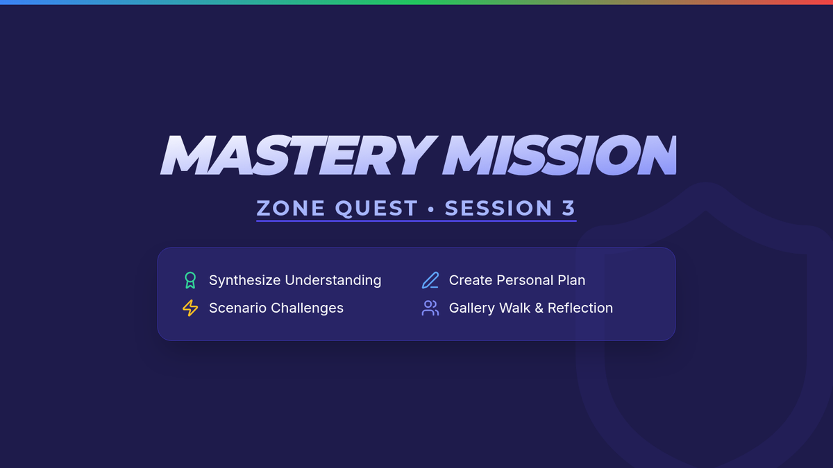 A 3-session emotional intelligence program for middle schoolers to identify, understand, and manage their emotions using the Zones of Regulation framework. Students move from basic identification to personalized self-regulation planning.