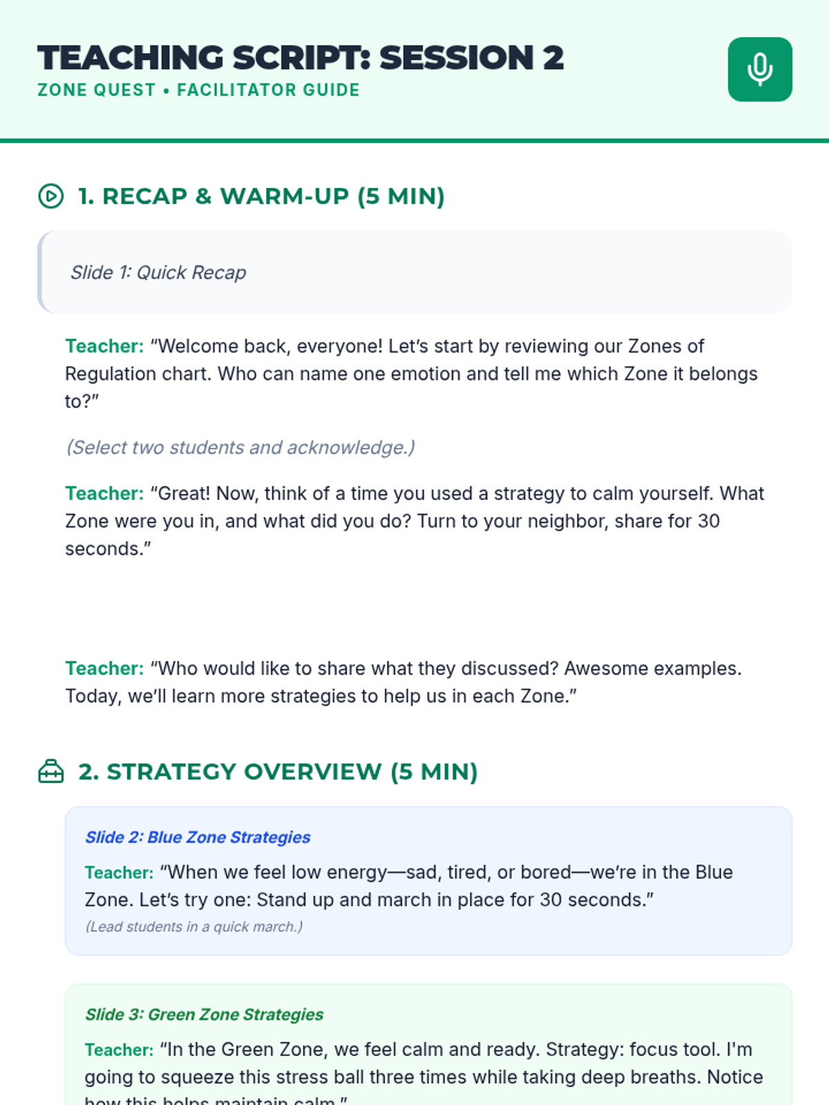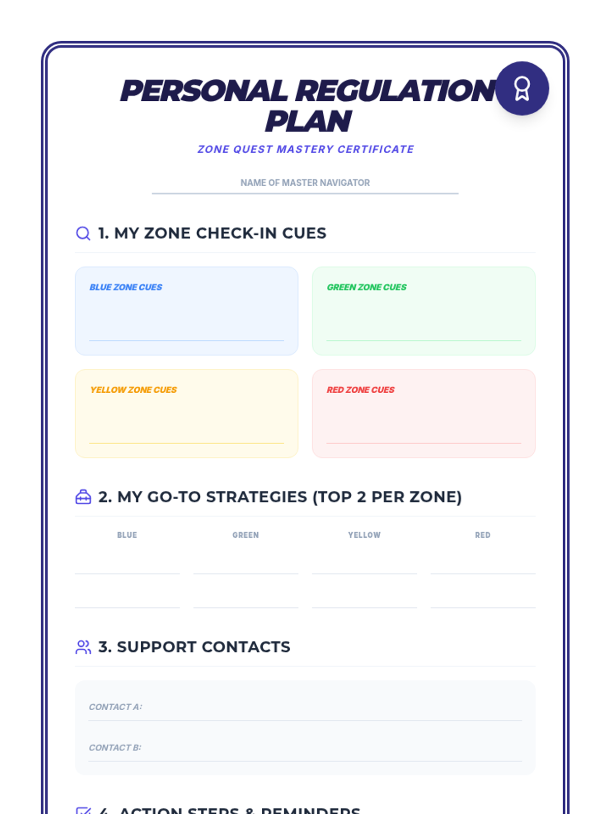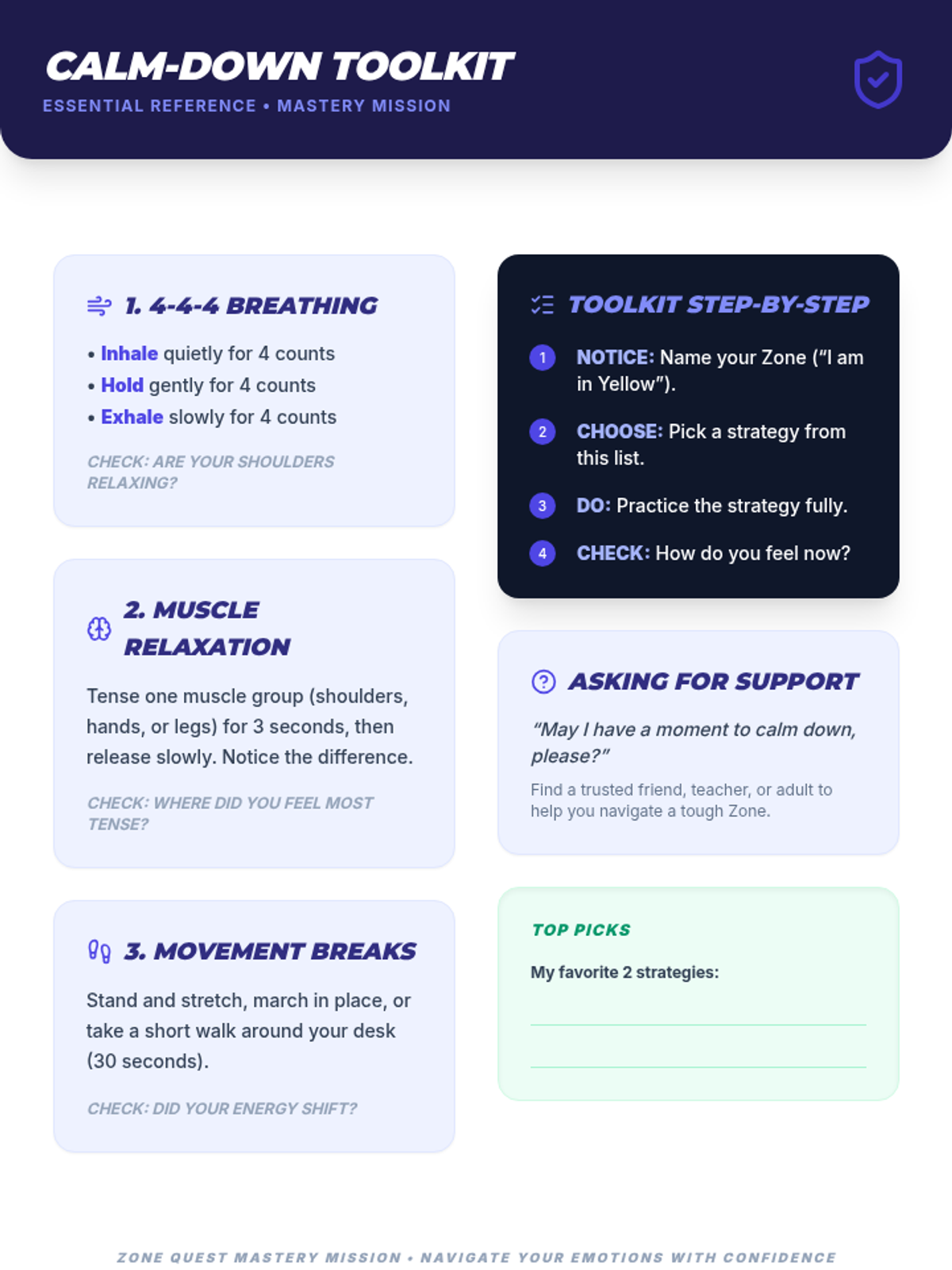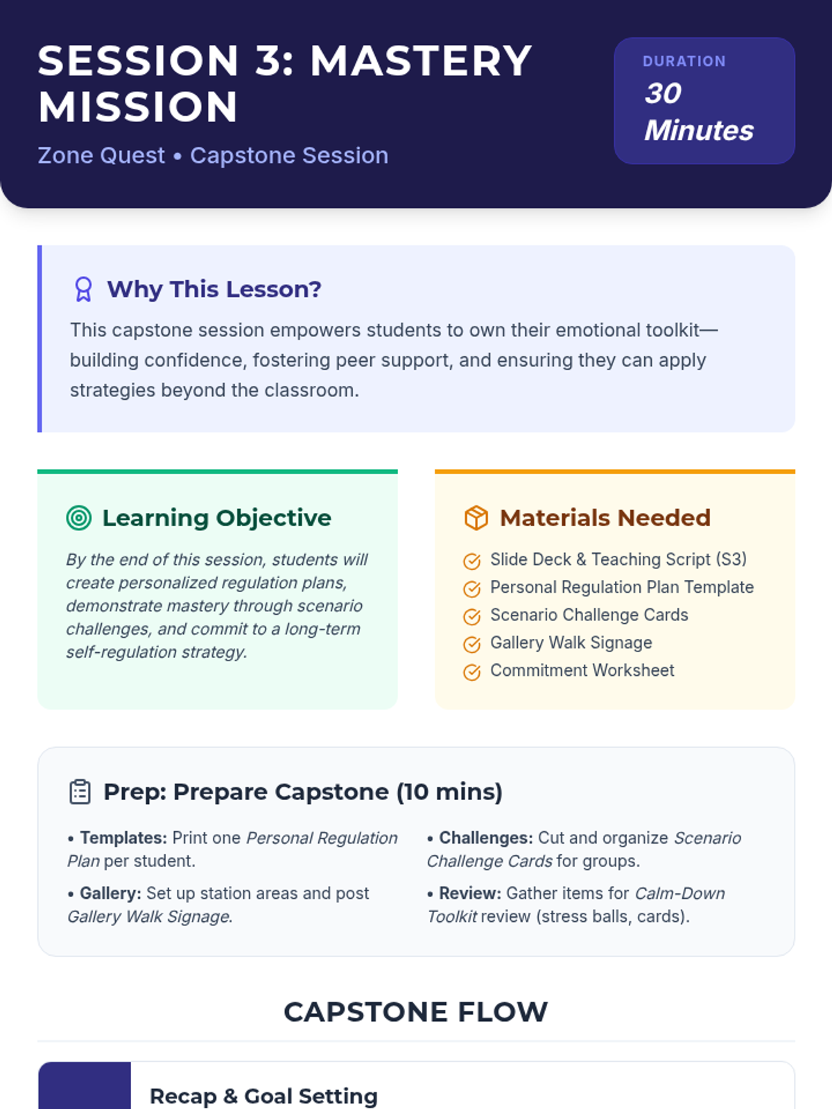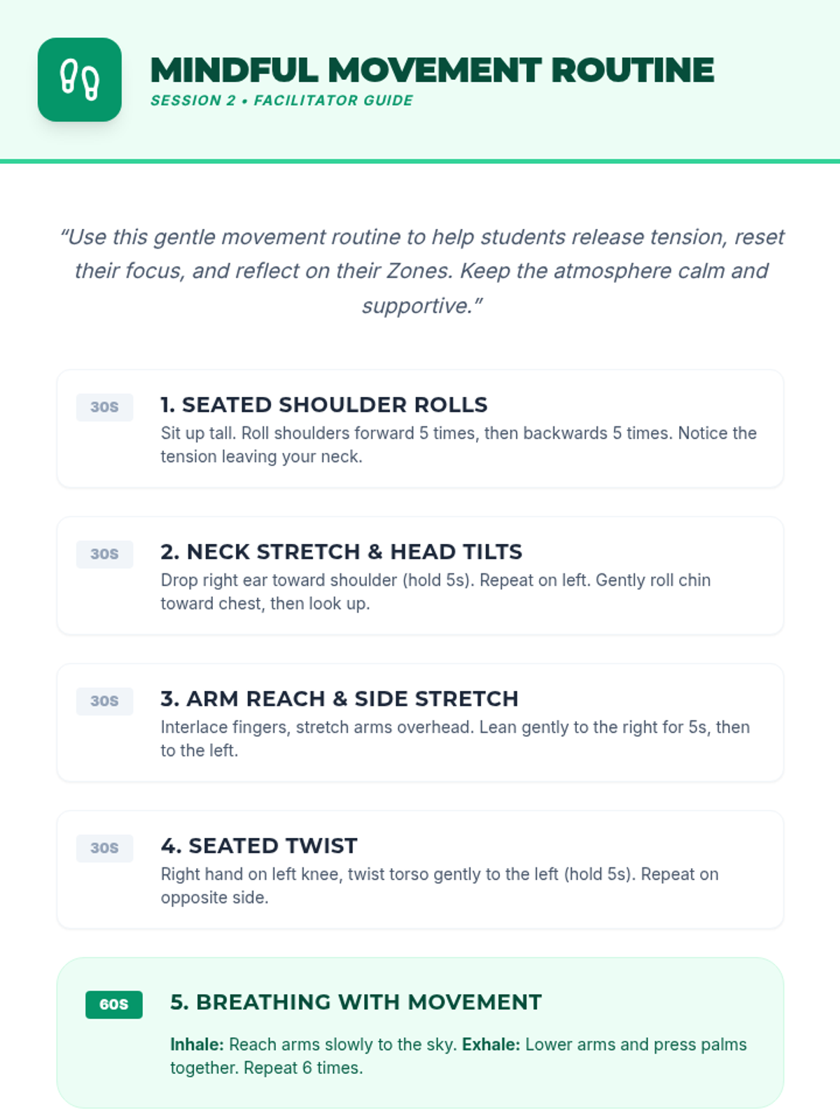 A 3-session emotional intelligence program for middle schoolers to identify, understand, and manage their emotions using the Zones of Regulation framework. Students move from basic identification to personalized self-regulation planning.