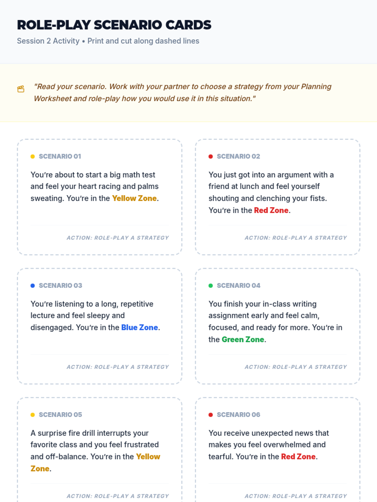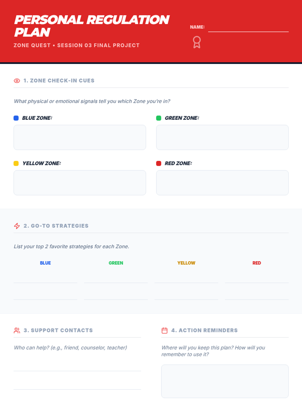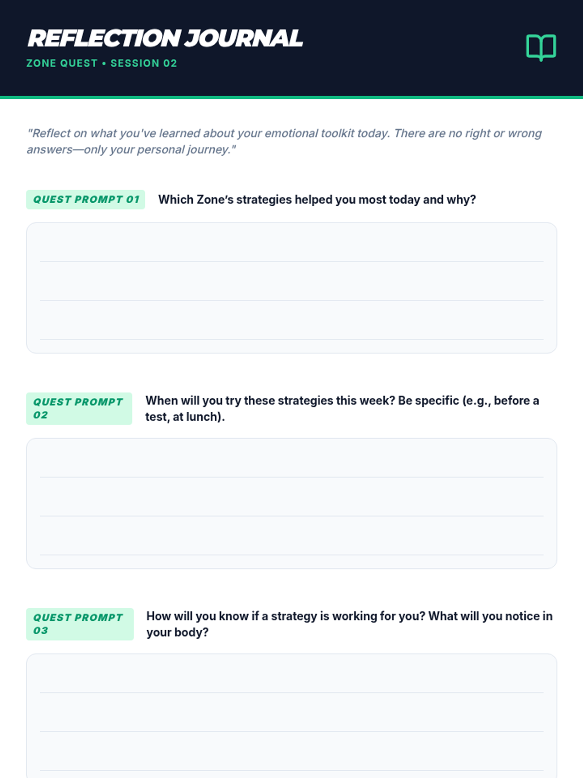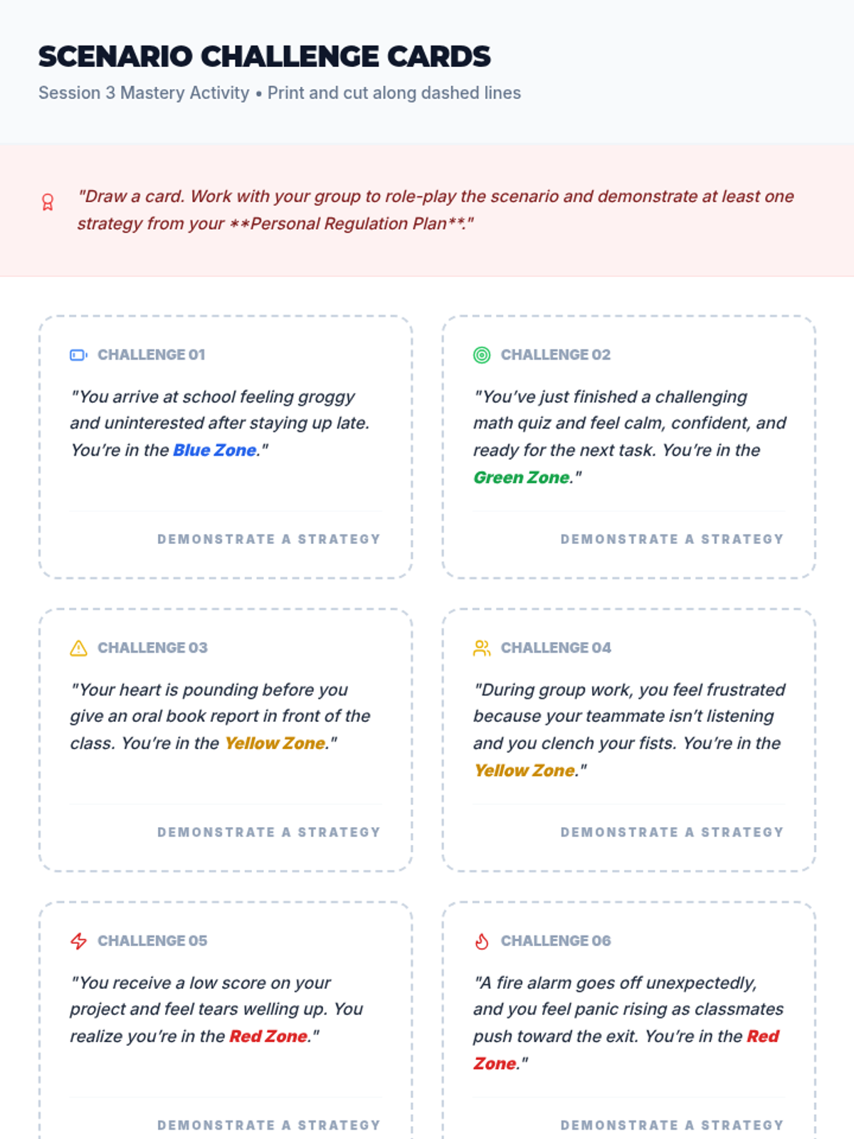 A 3-session journey for middle schoolers to understand and master the Zones of Regulation, building self-awareness and emotional management skills through interactive activities, games, and personal planning.