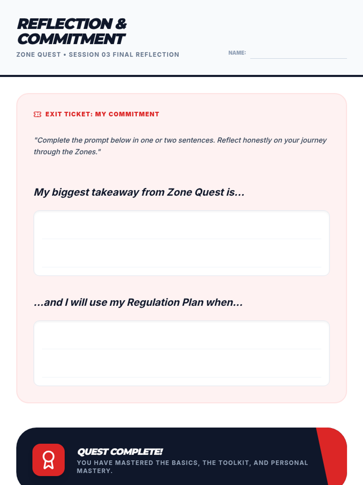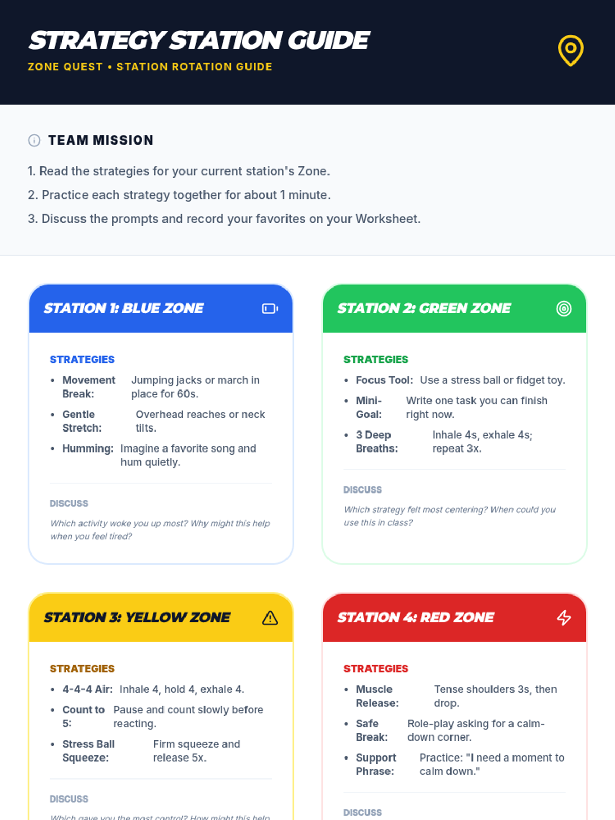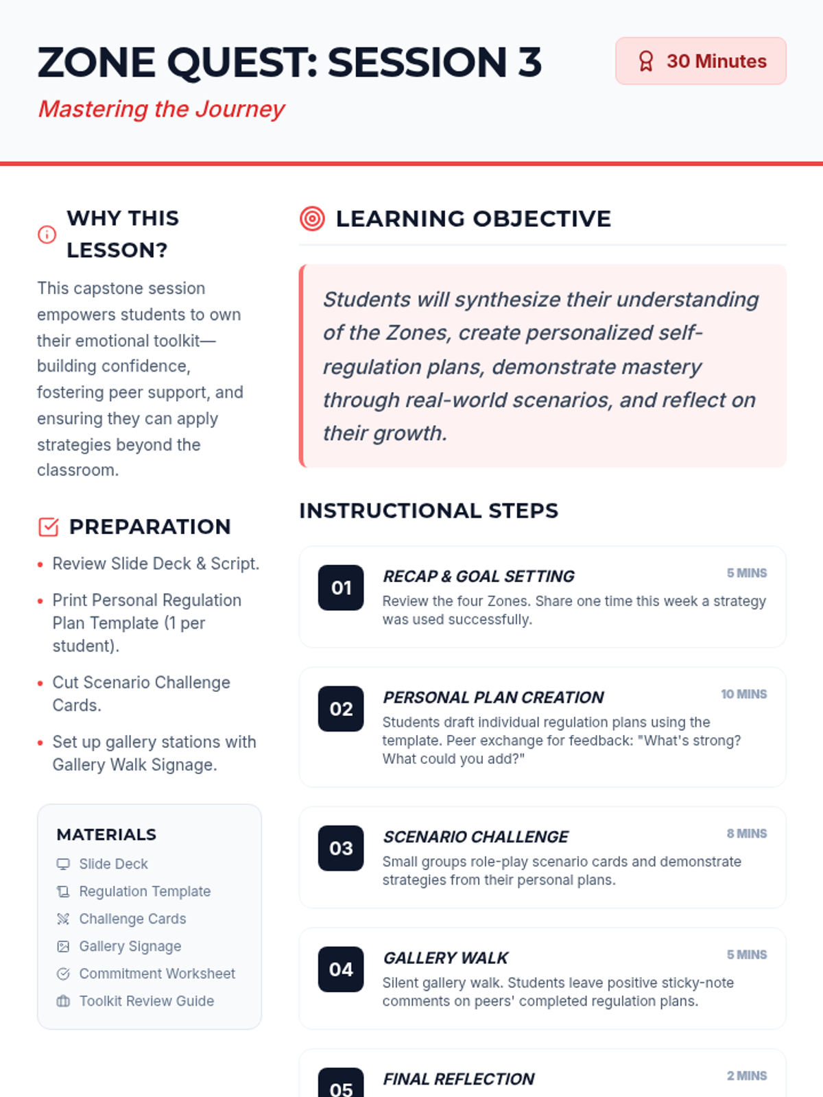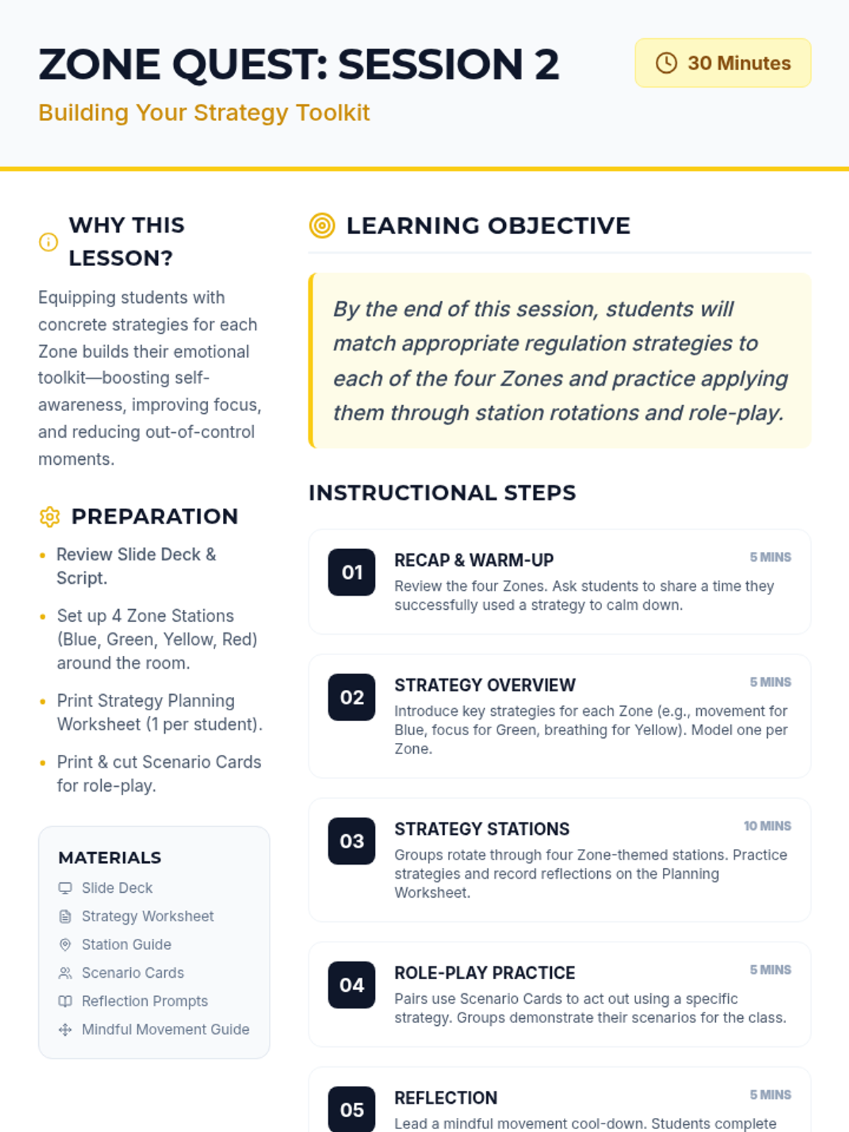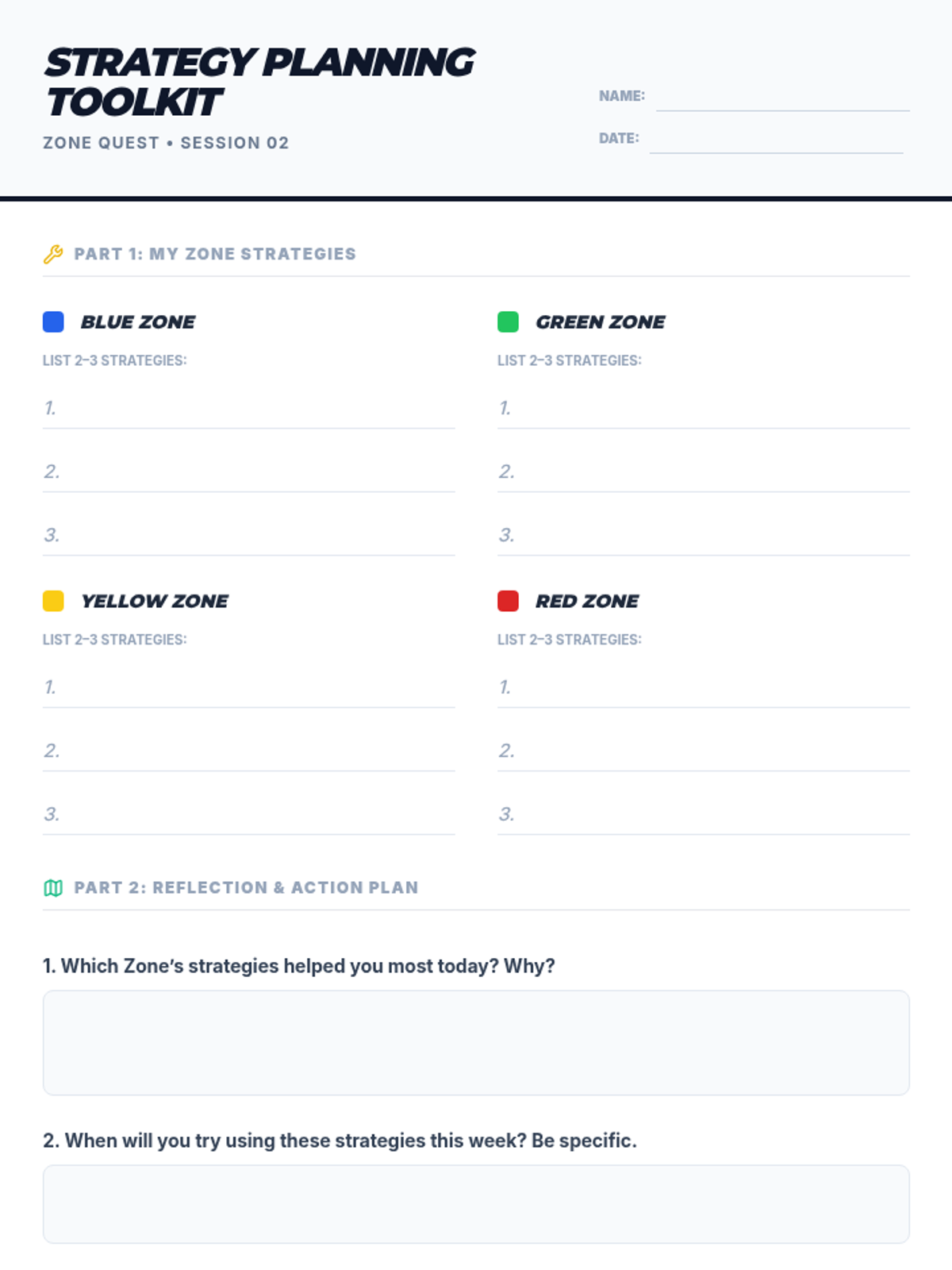 A 3-session journey for middle schoolers to understand and master the Zones of Regulation, building self-awareness and emotional management skills through interactive activities, games, and personal planning.