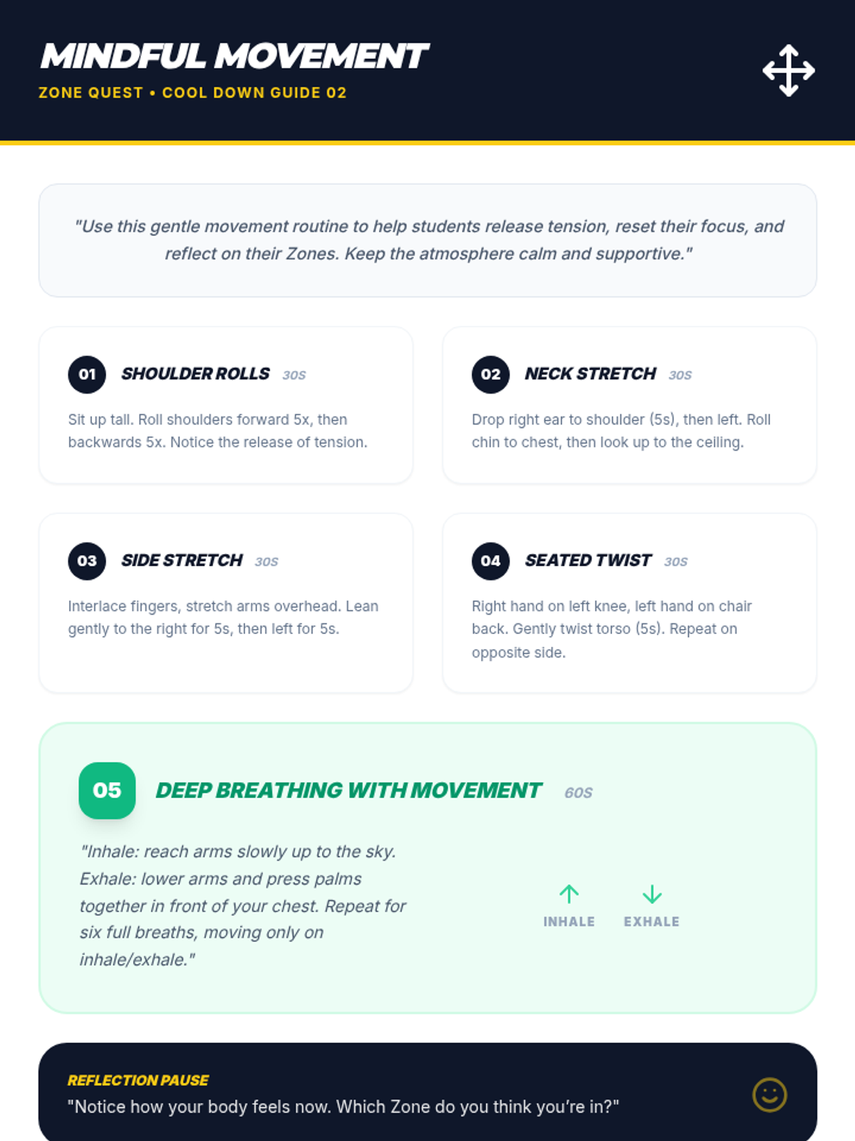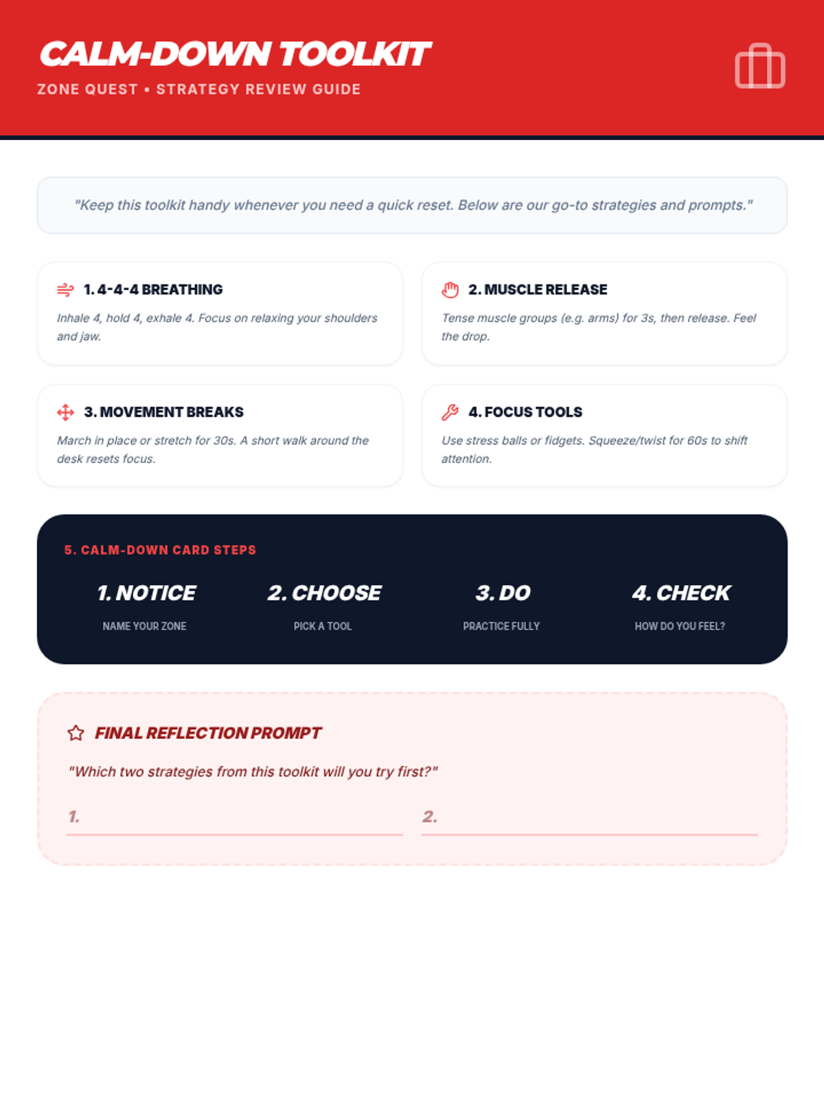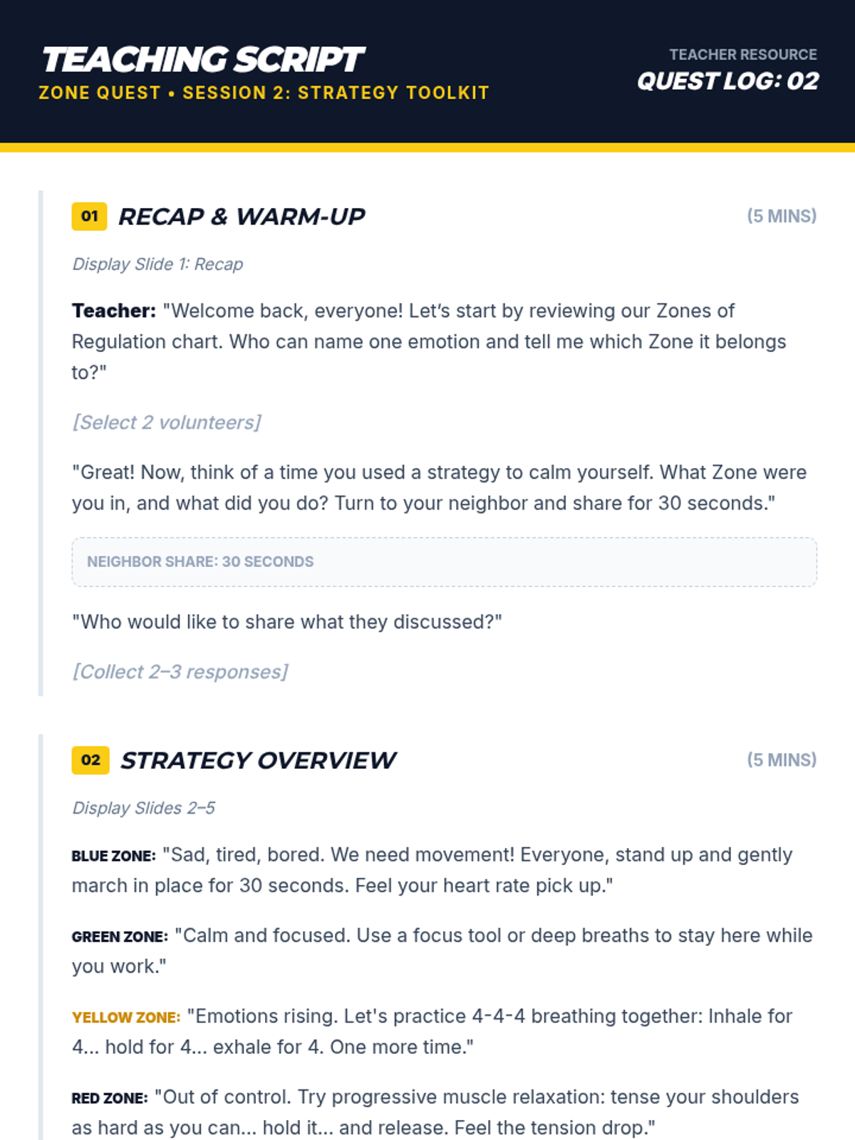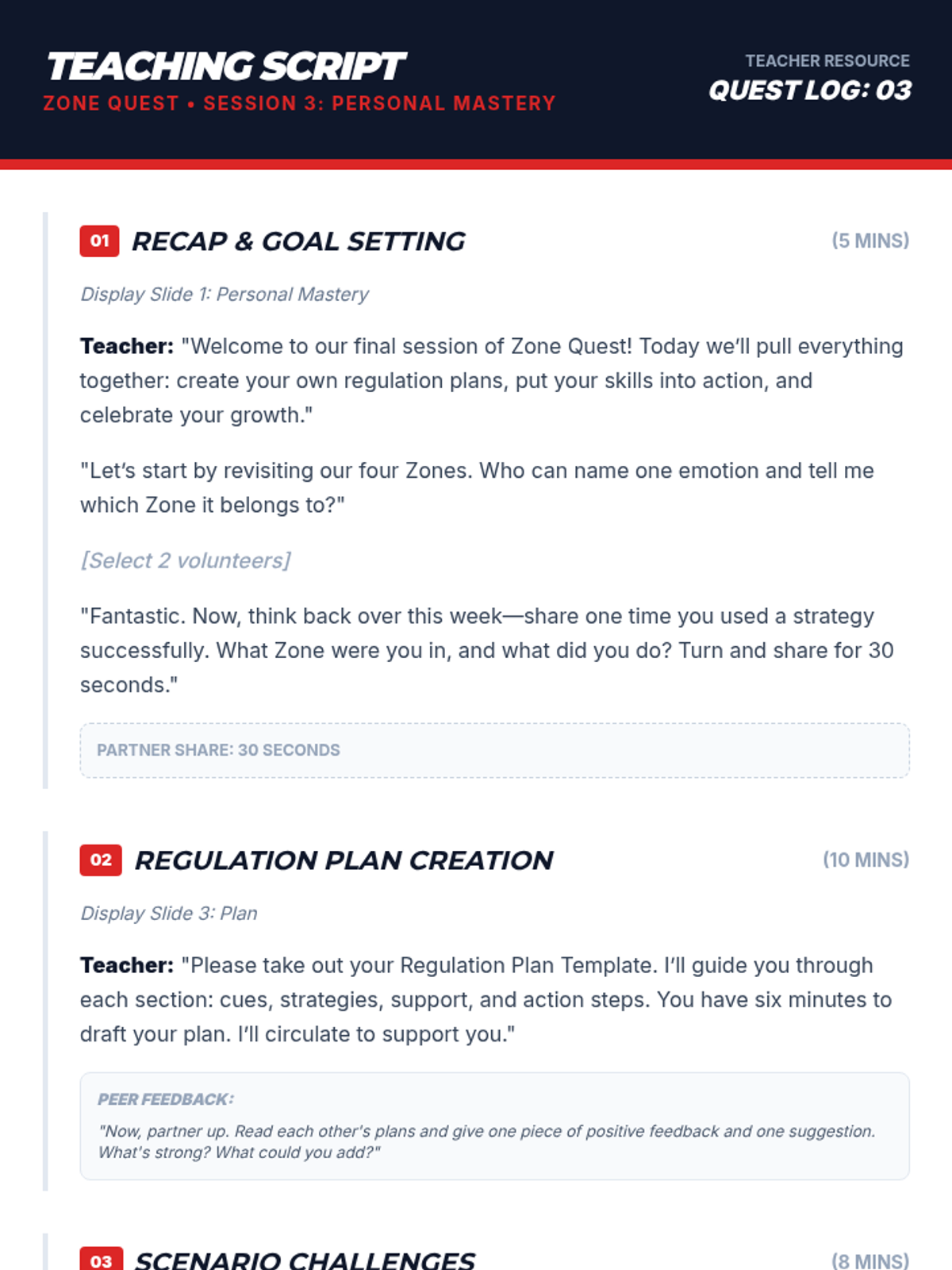 A 3-session journey for middle schoolers to understand and master the Zones of Regulation, building self-awareness and emotional management skills through interactive activities, games, and personal planning.