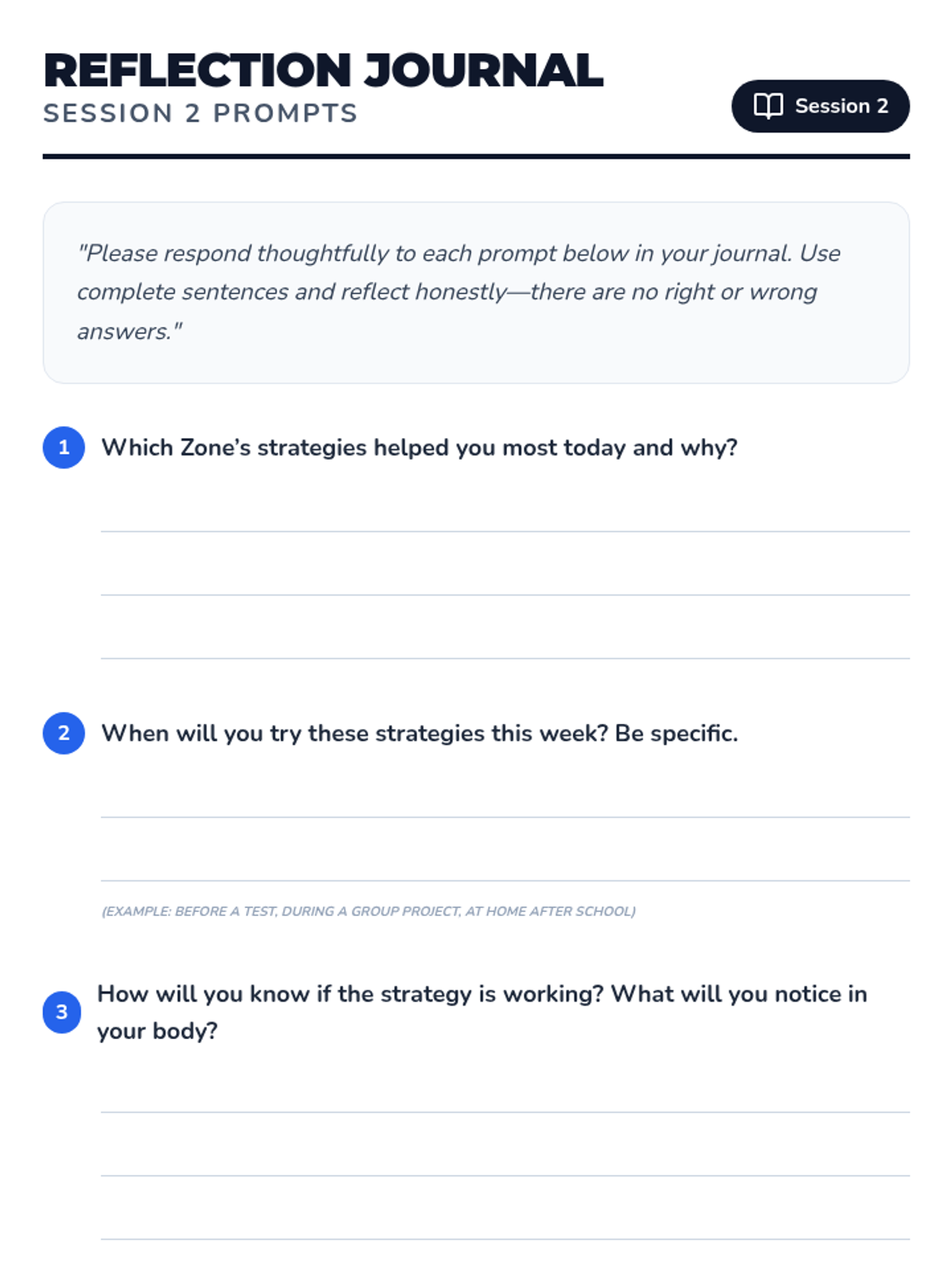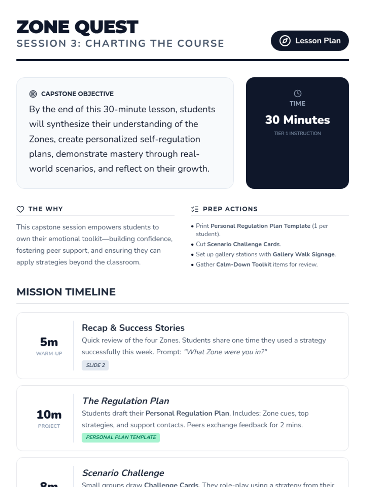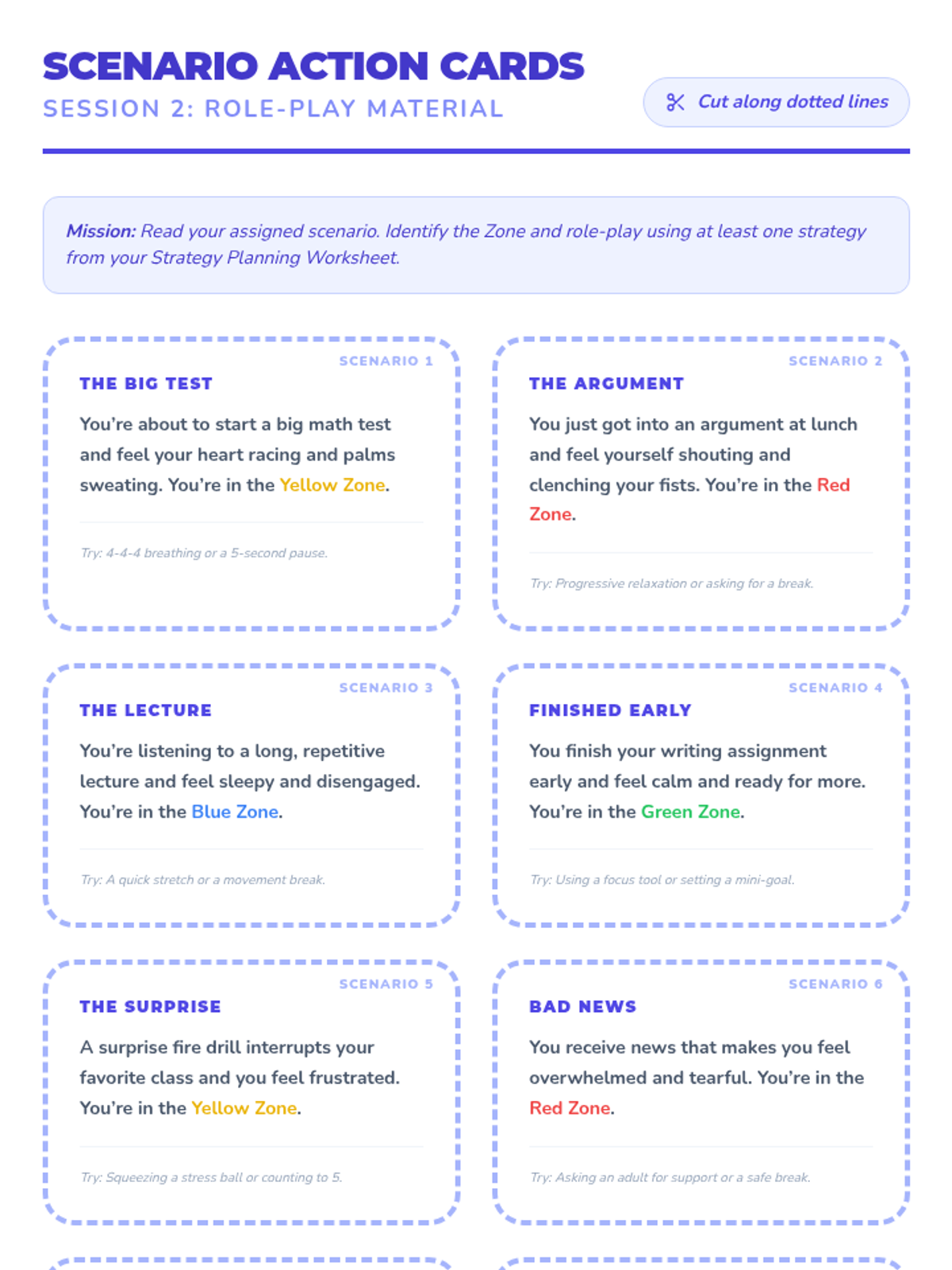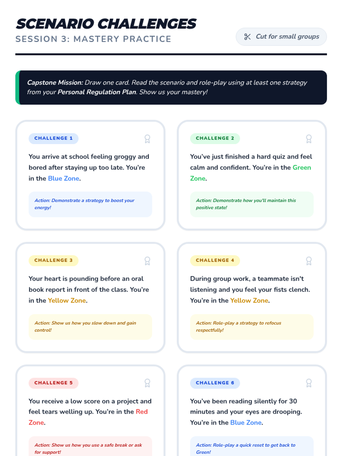 A 3-session Social-Emotional Learning sequence for middle schoolers to identify, understand, and manage emotions using the Zones of Regulation framework. Students move from basic identification to mastering specific self-regulation strategies and creating a personal action plan.