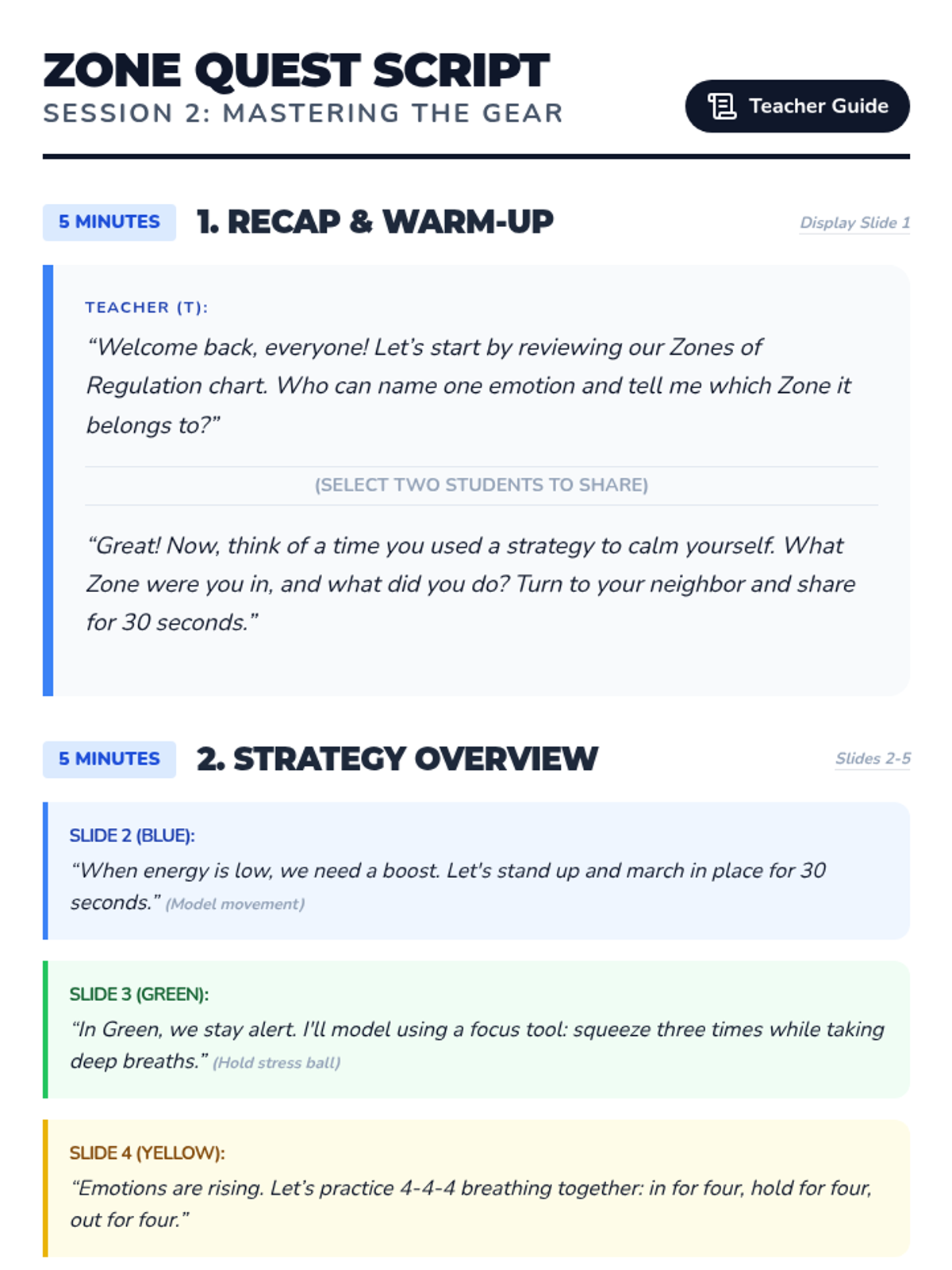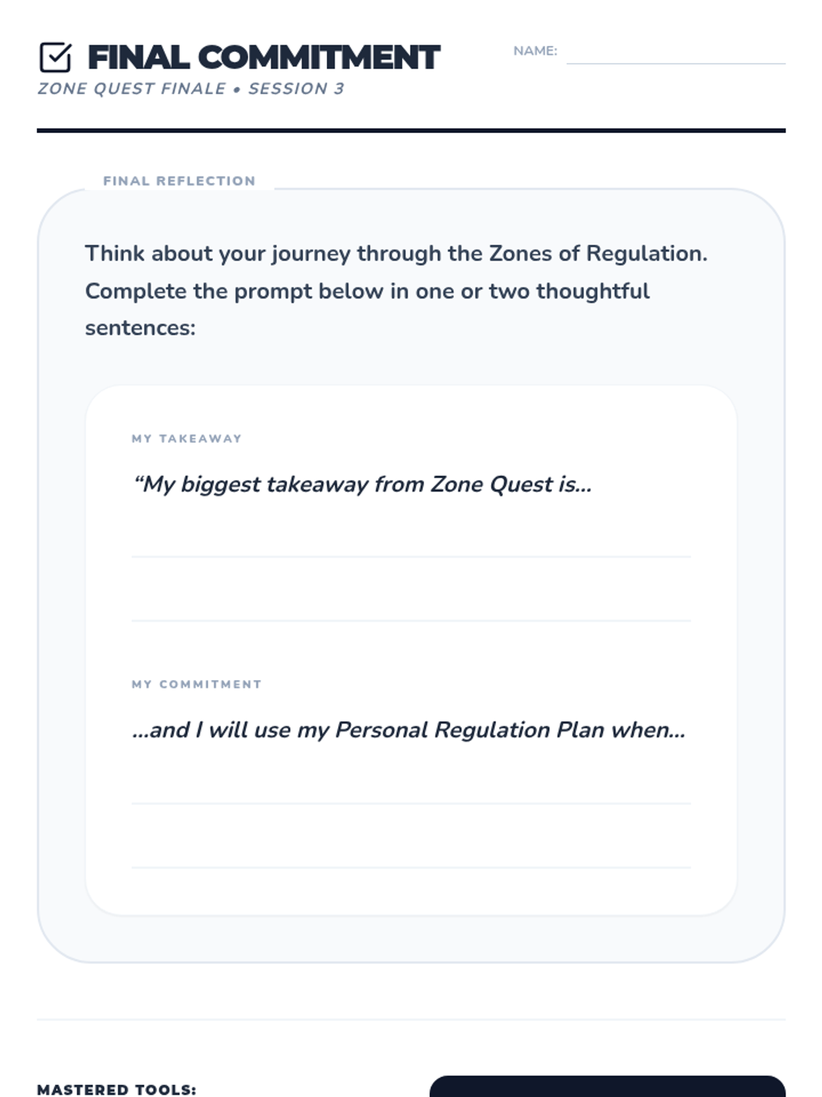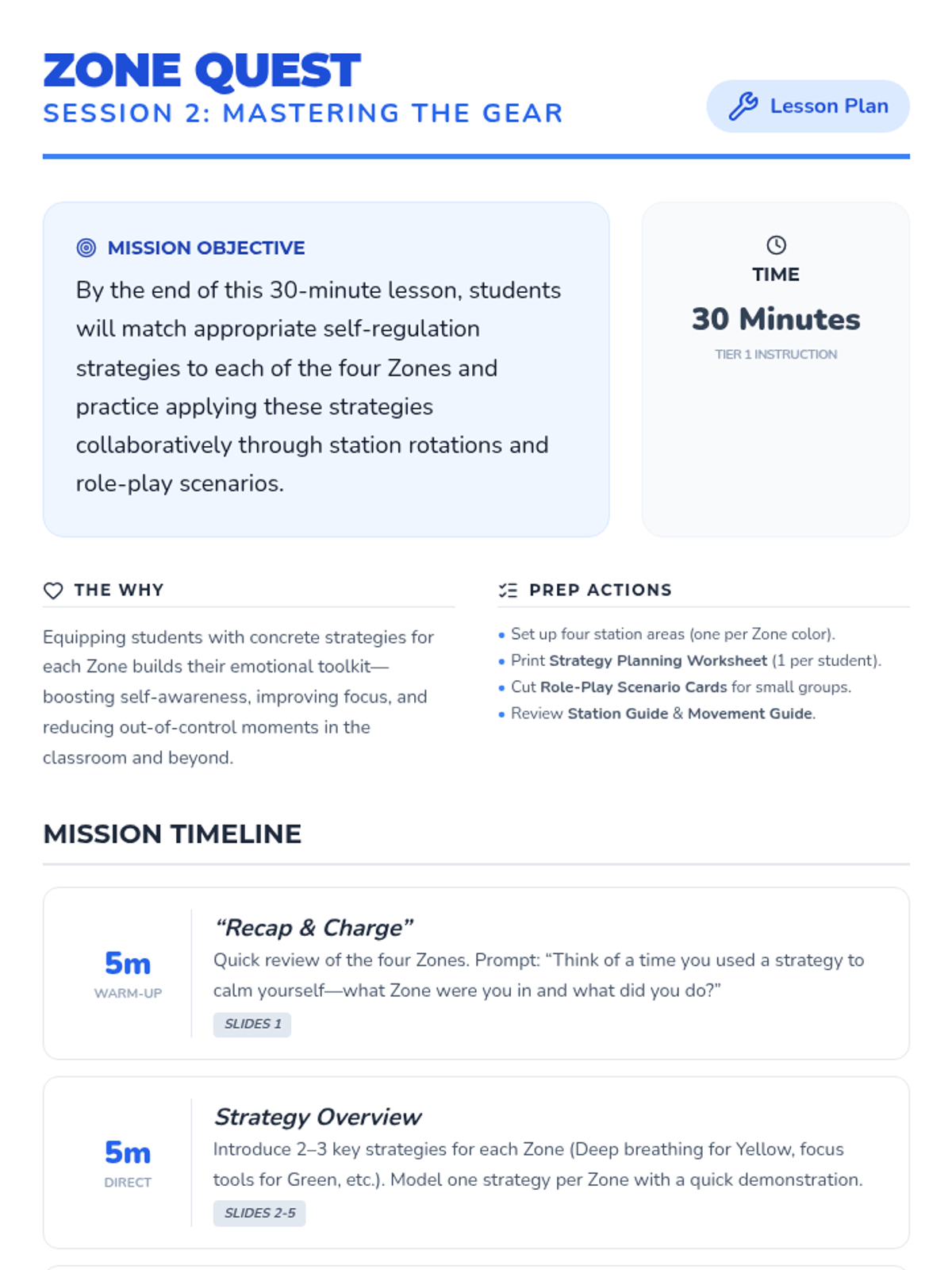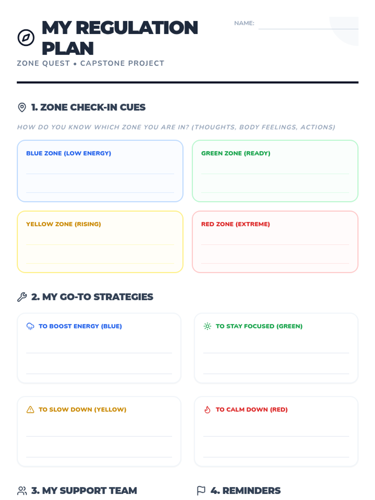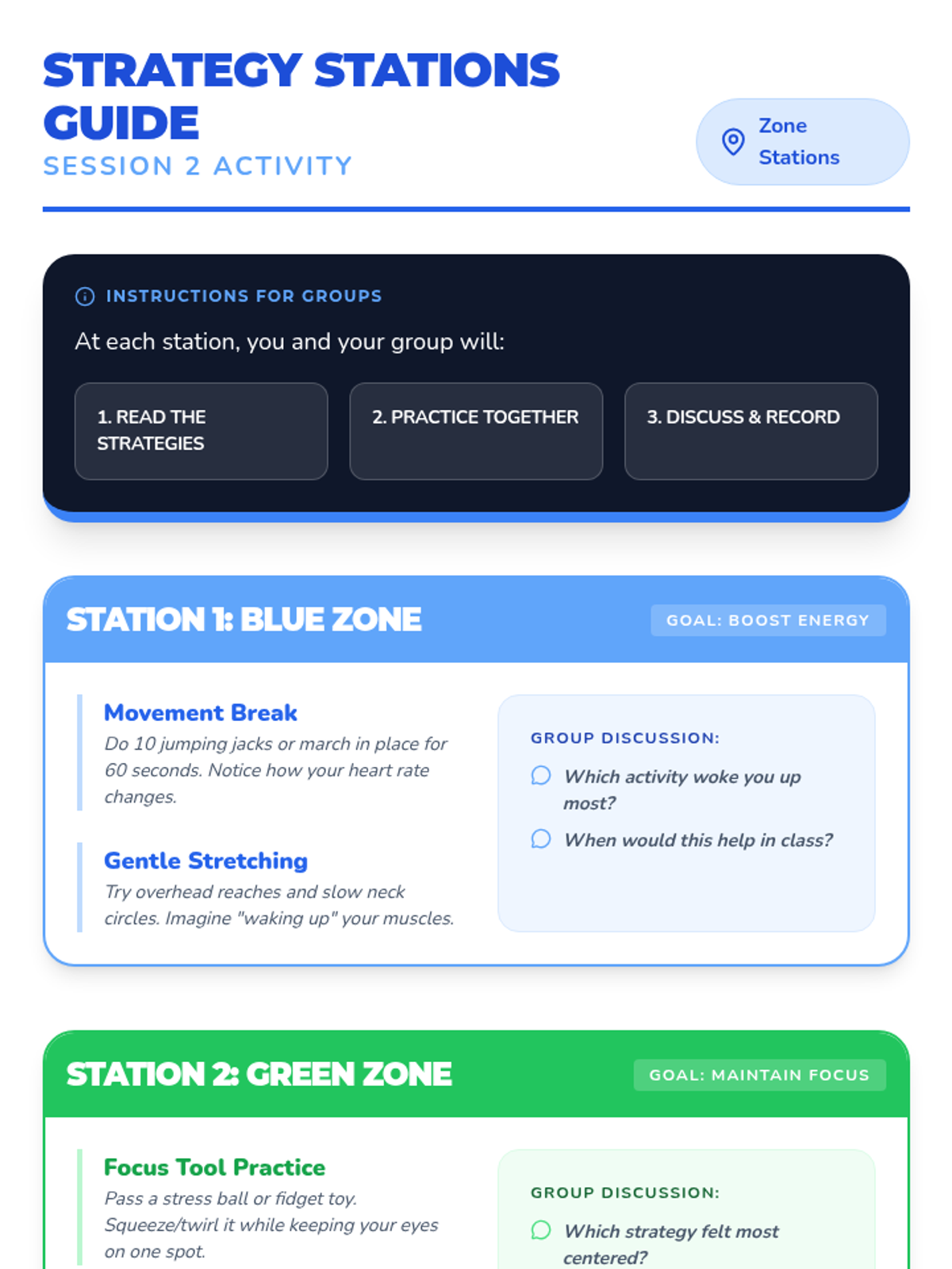 A 3-session Social-Emotional Learning sequence for middle schoolers to identify, understand, and manage emotions using the Zones of Regulation framework. Students move from basic identification to mastering specific self-regulation strategies and creating a personal action plan.