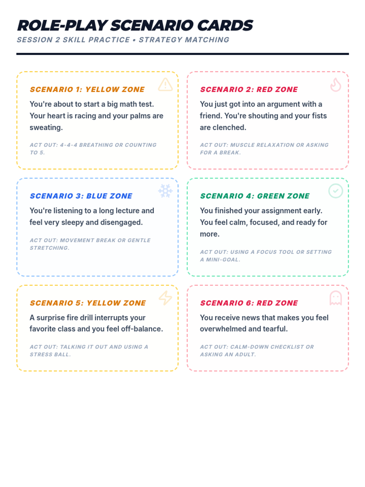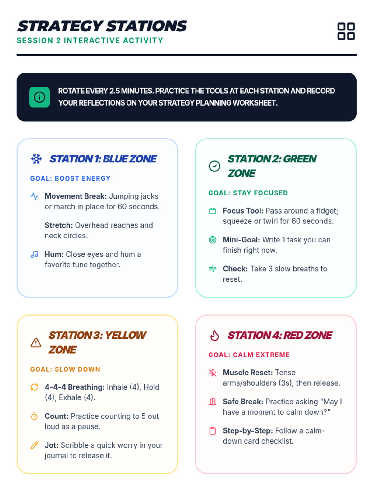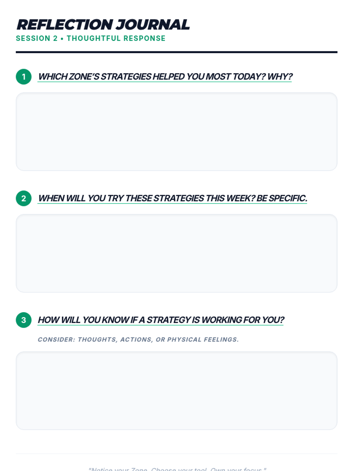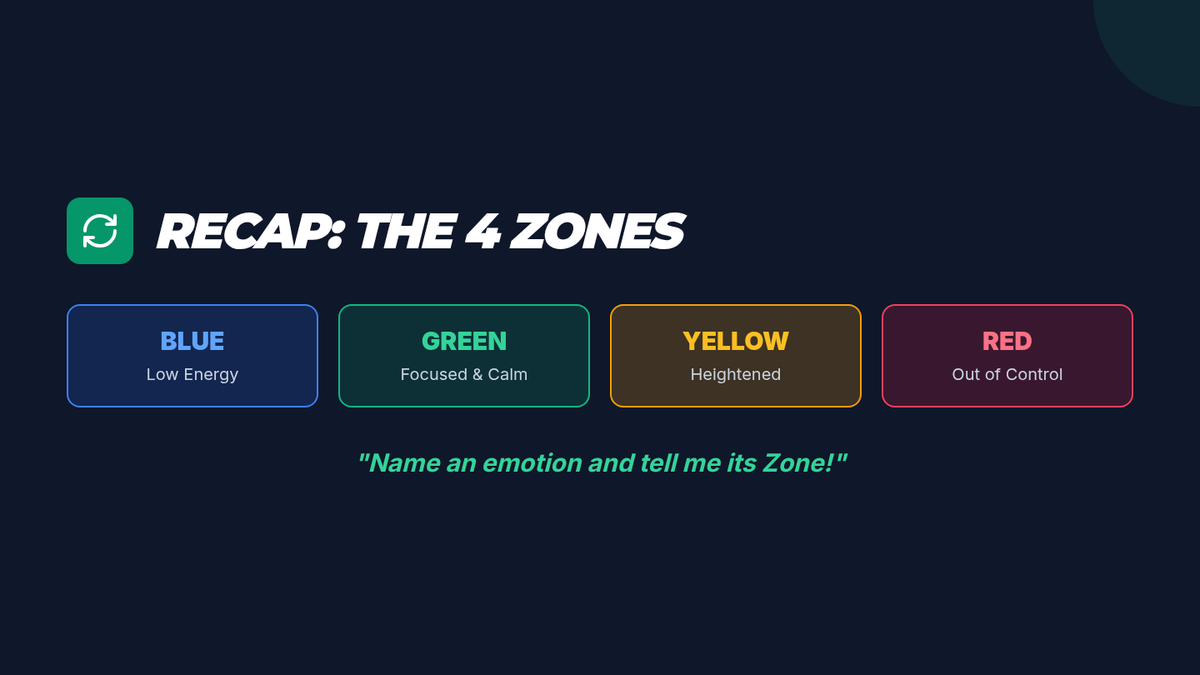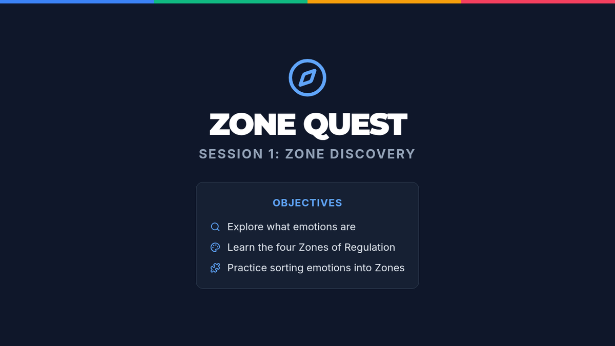 A 3-session course for middle schoolers to understand and master the Zones of Regulation. Students learn to identify emotions, develop a toolkit of self-regulation strategies, and create a personalized plan for emotional control.