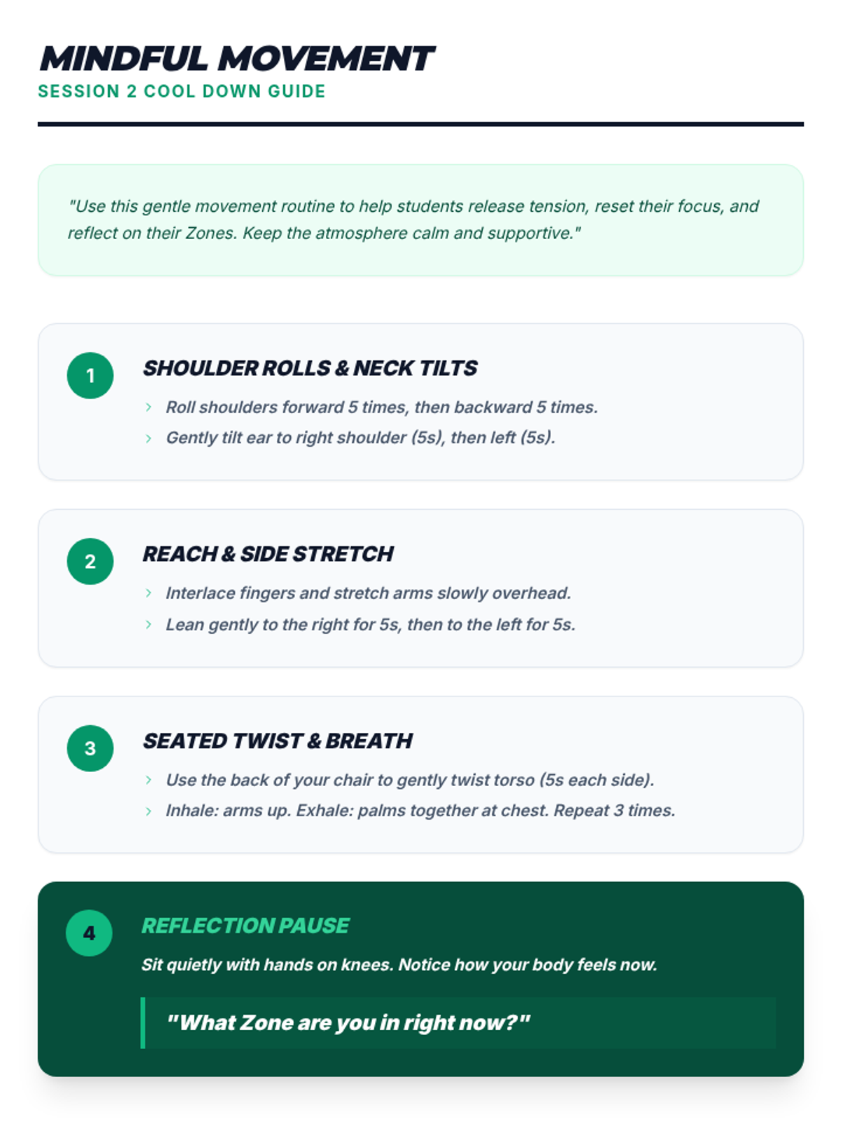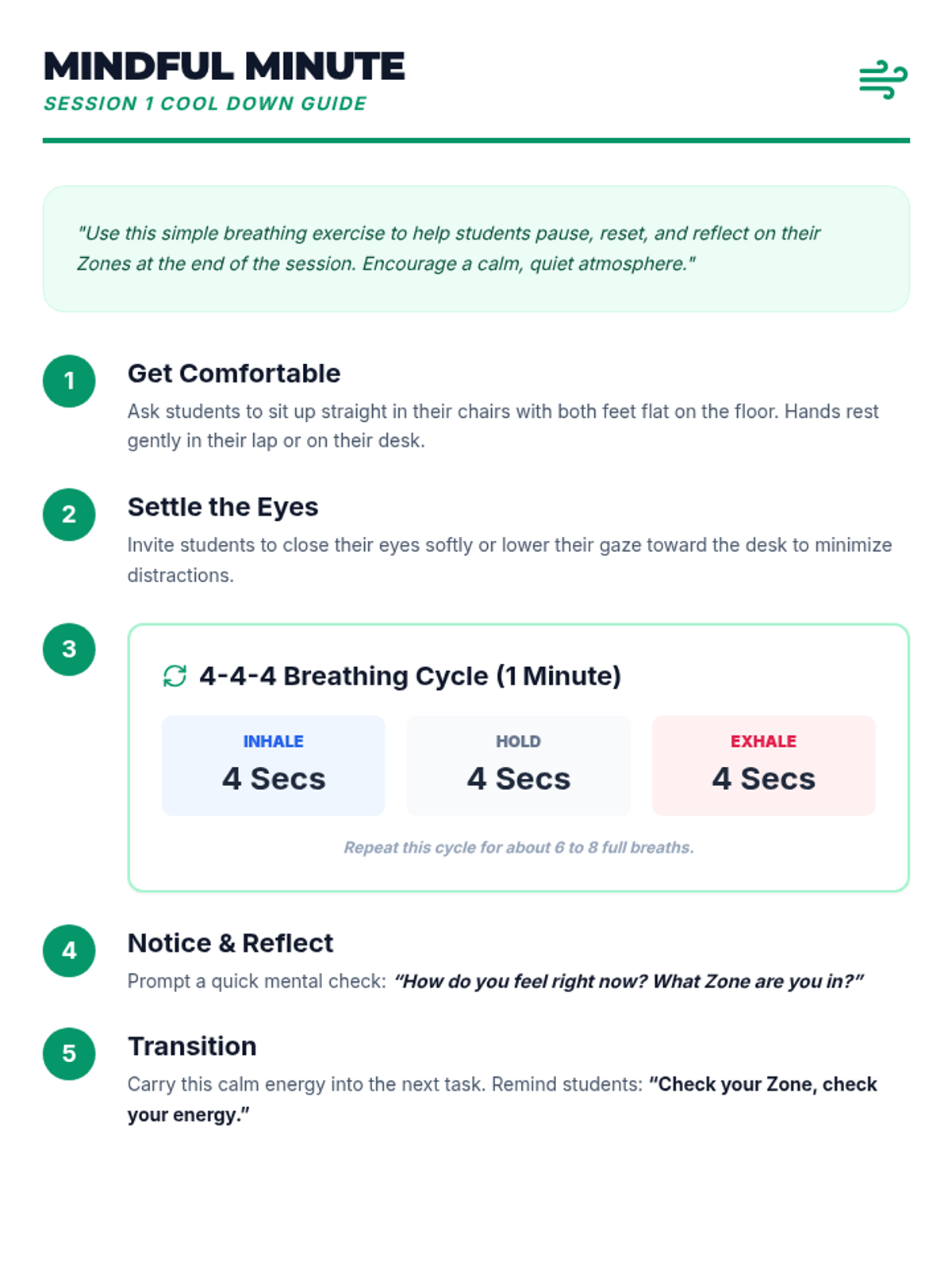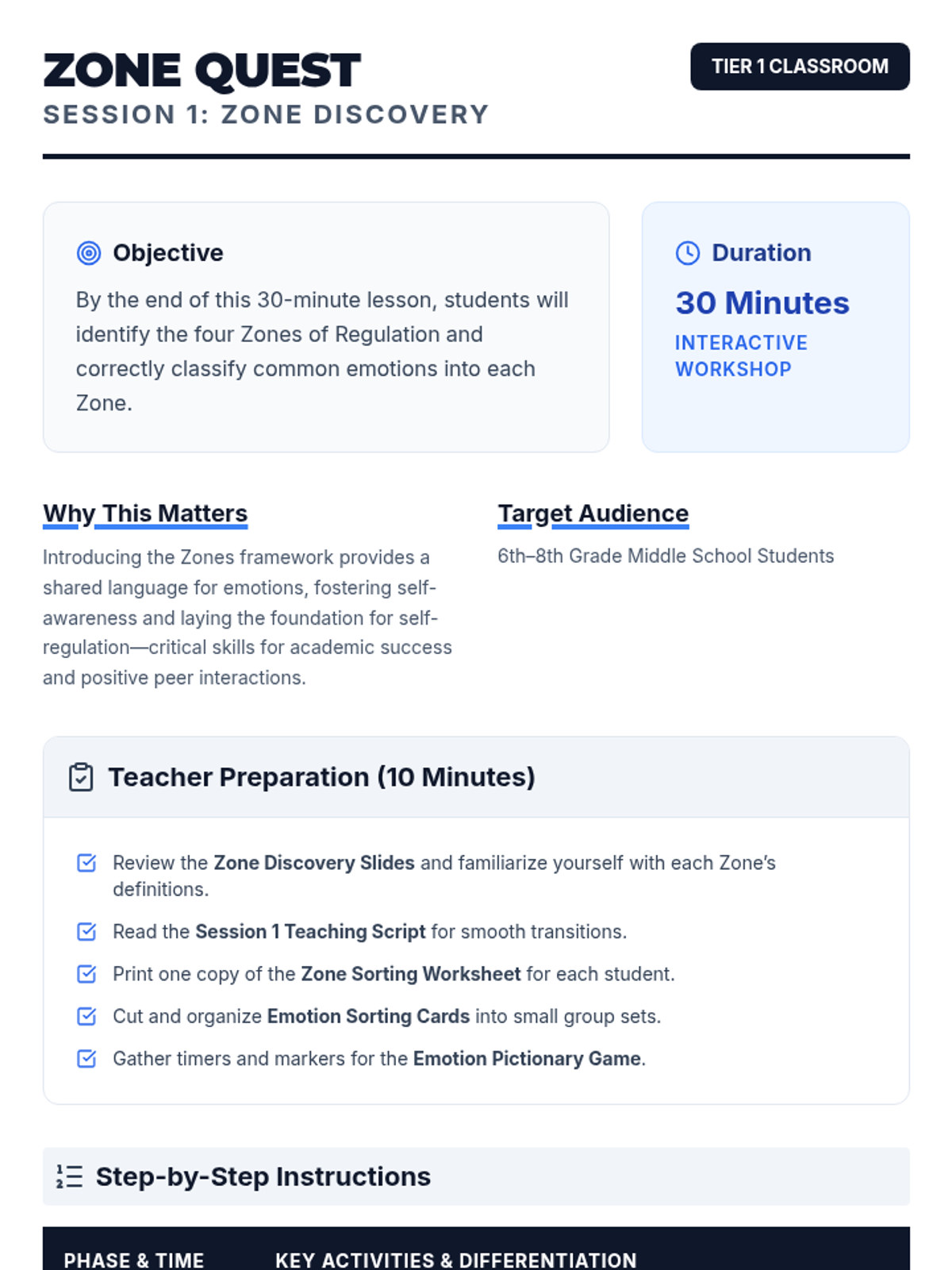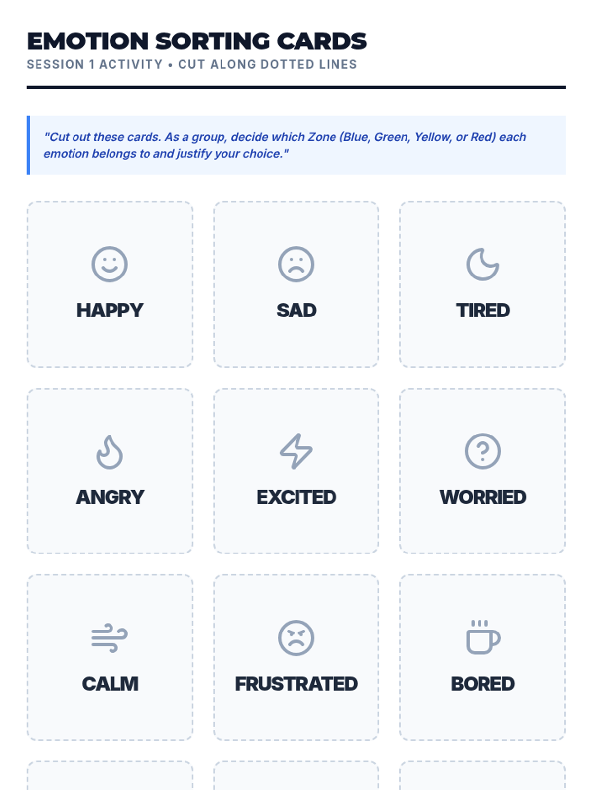 A 3-session course for middle schoolers to understand and master the Zones of Regulation. Students learn to identify emotions, develop a toolkit of self-regulation strategies, and create a personalized plan for emotional control.